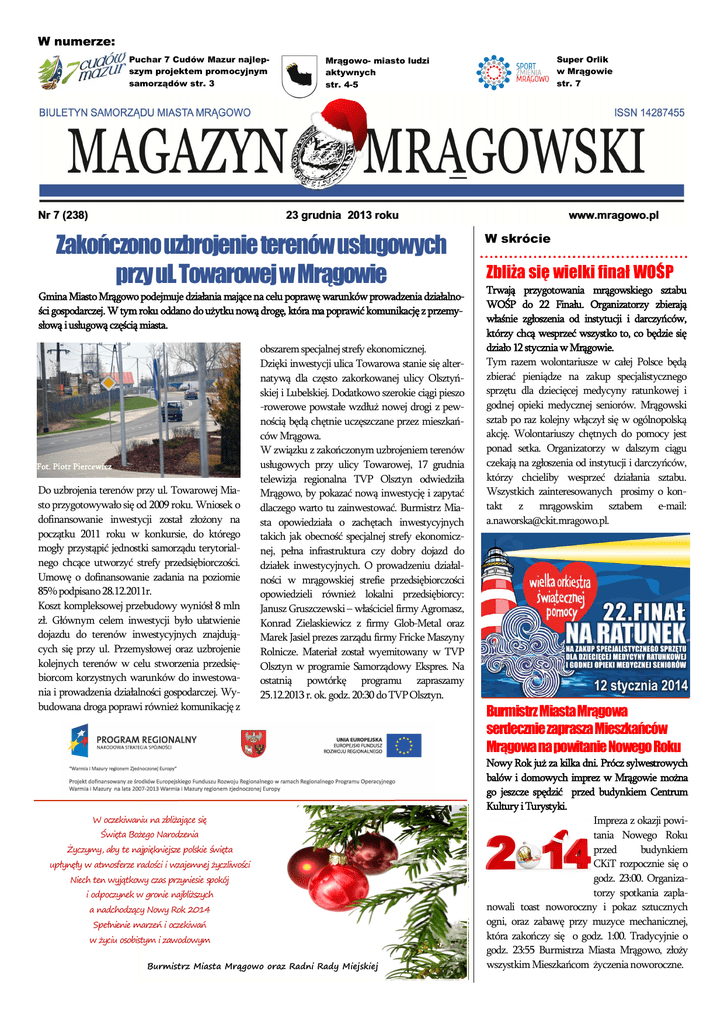 W numerze: Puchar 7 Cudów Mazur najlepszym projektem promocyjnym samorządów str. 3 Nr 7 (238) Super Orlik w Mrągowie str. 7 Mrągowo- miasto ludzi aktywnych str. 4-5 23 grudnia 2013 roku Zakończono uzbrojenie terenów usługowych przy ul. Towarowej w Mrągowie Gmina Miasto Mrągowo podejmuje działania mające na celu poprawę warunków prowadzenia działalności gospodarczej. W tym roku oddano do użytku nową drogę, która ma poprawić komunikację z przemysłową i usługową częścią miasta. Fot. Piotr Piercewicz Do uzbrojenia terenów przy ul. Towarowej Miasto przygotowywało się od 2009 roku. Wniosek o dofinansowanie inwestycji został złożony na początku 2011 roku w konkursie, do którego mogły przystąpić jednostki samorządu terytorialnego chcące utworzyć strefy przedsiębiorczości. Umowę o dofinansowanie zadania na poziomie 85% podpisano 28.12.2011r. Koszt kompleksowej przebudowy wyniósł 8 mln zł. Głównym celem inwestycji było ułatwienie dojazdu do terenów inwestycyjnych znajdujących się przy ul. Przemysłowej oraz uzbrojenie kolejnych terenów w celu stworzenia przedsiębiorcom korzystnych warunków do inwestowania i prowadzenia działalności gospodarczej. Wybudowana droga poprawi również komunikację z obszarem specjalnej strefy ekonomicznej. Dzięki inwestycji ulica Towarowa stanie się alternatywą dla często zakorkowanej ulicy Olsztyńskiej i Lubelskiej. Dodatkowo szerokie ciągi pieszo -rowerowe powstałe wzdłuż nowej drogi z pewnością będą chętnie uczęszczane przez mieszkańców Mrągowa. W związku z zakończonym uzbrojeniem terenów usługowych przy ulicy Towarowej, 17 grudnia telewizja regionalna TVP Olsztyn odwiedziła Mrągowo, by pokazać nową inwestycję i zapytać dlaczego warto tu zainwestować. Burmistrz Miasta opowiedziała o zachętach inwestycyjnych takich jak obecność specjalnej strefy ekonomicznej, pełna infrastruktura czy dobry dojazd do działek inwestycyjnych. O prowadzeniu działalności w mrągowskiej strefie przedsiębiorczości opowiedzieli również lokalni przedsiębiorcy: Janusz Gruszczewski – właściciel firmy Agromasz, Konrad Zielaskiewicz z firmy Glob-Metal oraz Marek Jasiel prezes zarządu firmy Fricke Maszyny Rolnicze. Materiał został wyemitowany w TVP Olsztyn w programie Samorządowy Ekspres. Na ostatnią powtórkę programu zapraszamy 25.12.2013 r. ok. godz. 20:30 do TVP Olsztyn. W oczekiwaniu na zbliżające się Święta Bożego Narodzenia Życzymy, aby te najpiękniejsze polskie święta upłynęły w atmosferze radości i wzajemnej życzliwości Niech ten wyjątkowy czas przyniesie spokój i odpoczynek w gronie najbliższych a nadchodzący Nowy Rok 2014 Spełnienie marzeń i oczekiwań w życiu osobistym i zawodowym Burmistrz Miasta Mrągowo oraz Radni Rady Miejskiej www.mragowo.pl W skrócie Zbliża się wielki finał WOŚP Trwają przygotowania mrągowskiego sztabu WOŚP do 22 Finału. Organizatorzy zbierają właśnie zgłoszenia od instytucji i darczyńców, którzy chcą wesprzeć wszystko to, co będzie się działo 12 stycznia w Mrągowie. Tym razem wolontariusze w całej Polsce będą zbierać pieniądze na zakup specjalistycznego sprzętu dla dziecięcej medycyny ratunkowej i godnej opieki medycznej seniorów. Mrągowski sztab po raz kolejny włączył się w ogólnopolską akcję. Wolontariuszy chętnych do pomocy jest ponad setka. Organizatorzy w dalszym ciągu czekają na zgłoszenia od instytucji i darczyńców, którzy chcieliby wesprzeć działania sztabu. Wszystkich zainteresowanych prosimy o kontakt z mrągowskim sztabem e-mail: [email protected]. Burmistrz Miasta Mrągowa serdecznie zaprasza Mieszkańców Mrągowa na powitanie Nowego Roku Nowy Rok już za kilka dni. Prócz sylwestrowych balów i domowych imprez w Mrągowie można go jeszcze spędzić przed budynkiem Centrum Kultury i Turystyki. Impreza z okazji powitania Nowego Roku przed budynkiem CKiT rozpocznie się o godz. 23:00. Organizatorzy spotkania zaplanowali toast noworoczny i pokaz sztucznych ogni, oraz zabawę przy muzyce mechanicznej, która zakończy się o godz. 1:00. Tradycyjnie o godz. 23:55 Burmistrza Miasta Mrągowo, złoży wszystkim Mieszkańcom życzenia noworoczne. Strona 2 ,,Magazyn Mrągowski” Nr 1 (232) 21 grudnia2011 ,,Magazyn Mrągowski” Nr 7 (238) 23 grudnia 2013 roku Biznesowo o Mazurach Mazury ważnym ośrodkiem turystyki biznesowej w kraju? Oczywiście, że tak! Mazurski Klaster Turystyczny na www.konferencjemazury.com odsłania biznesową stronę mazurskiej turystyki. Portal zawiera kompleksową informację o turystyce biznesowej Mazur. Jest swoistym planerem, który ma służyć organizatorom i uczestnikom biznesowych spotkań. Na stronie znajduję się między innymi wyszukiwarka obiektów konferencyjnych, lista tłumaczy przysięgłych, baza firm organizujących szkolenia czy imprezy integracyjne itd. Stworzenie strony internetowej gromadzącej potrzebne do tego celu informacje to jednak tylko pierwszy krok. Kolejnym będzie przejście od pasywnej prezentacji oferty do aktywnego pozyskiwania firm. Portal został przygotowany w ramach grupy projektowej „Convention Bureau Mazury” Mazurskiego Klastra Turystycznego, zajmującej się promocją regionu jako atrakcyjnego miejsca organizacji spotkań i wydarzeń biznesowych. Koordynatorem MKT jest Lokalna Organizacja Turystyczna „Ziemia Mrągowska”. Strona nie jest jeszcze skończona, na bieżąco będzie uzupełniania. Mrągowski camping wśród najlepszych w Polsce Już po raz kolejny Camping „Cezar” z Mrągowa został laureatem konkursu na najlepszy camping w Polsce „Mister Camping”. W tegorocznej edycji zdobył on III miejsce. W konkursie biorą udział wszystkie campingi zrzeszone w Polskiej Federacji Campingu i Caravaningu (PFCC), zatem konkurencja była spora. Konkurs organizowany jest już od 49 lat przez PFCC we współpracy z Ministerstwem Sportu i Turystyki oraz Polską Organizacją Turystyczną. W skład Jury 