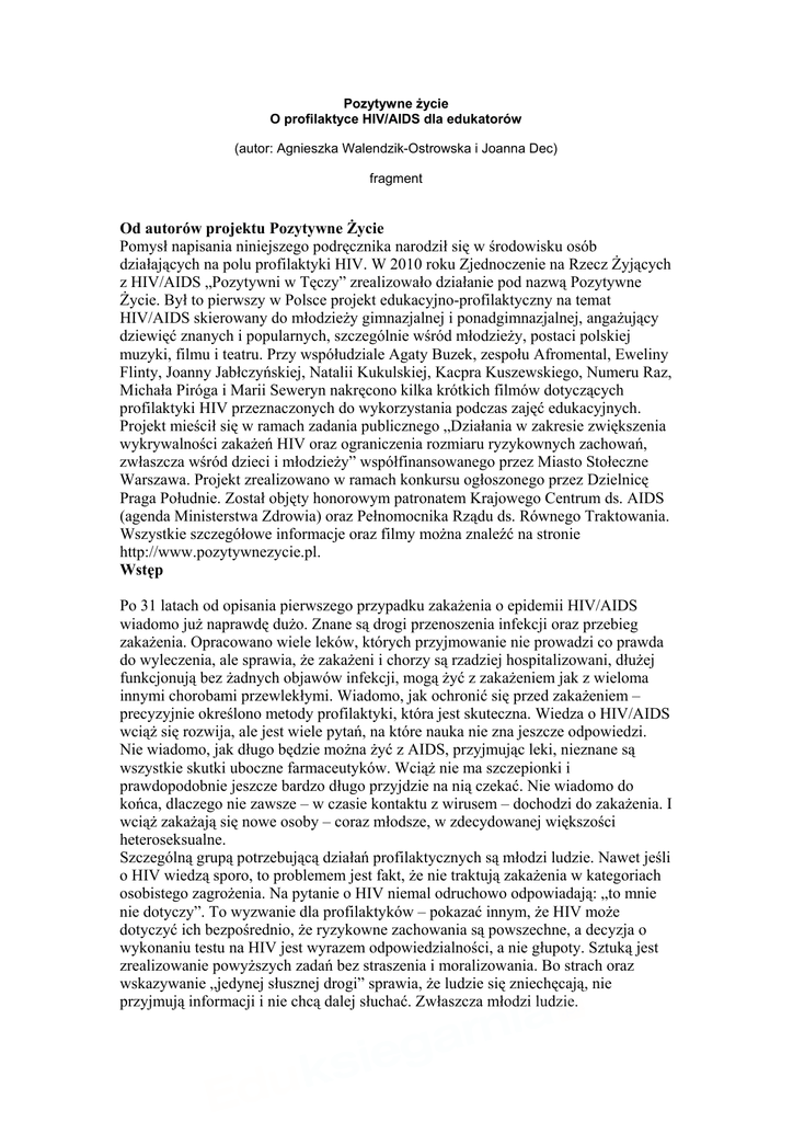 Pozytywne życie O profilaktyce HIV/AIDS dla edukatorów (autor: Agnieszka Walendzik-Ostrowska i Joanna Dec) fragment Od autorów projektu Pozytywne Życie Pomysł napisania niniejszego podręcznika narodził się w środowisku osób działających na polu profilaktyki HIV. W 2010 roku Zjednoczenie na Rzecz Żyjących z HIV/AIDS „Pozytywni w Tęczy” zrealizowało działanie pod nazwą Pozytywne Życie. Był to pierwszy w Polsce projekt edukacyjno-profilaktyczny na temat HIV/AIDS skierowany do młodzieży gimnazjalnej i ponadgimnazjalnej, angażujący dziewięć znanych i popularnych, szczególnie wśród młodzieży, postaci polskiej muzyki, filmu i teatru. Przy współudziale Agaty Buzek, zespołu Afromental, Eweliny Flinty, Joanny Jabłczyńskiej, Natalii Kukulskiej, Kacpra Kuszewskiego, Numeru Raz, Michała Piróga i Marii Seweryn nakręcono kilka krótkich filmów dotyczących profilaktyki HIV przeznaczonych do wykorzystania podczas zajęć edukacyjnych. Projekt mieścił się w ramach zadania publicznego „Działania w zakresie zwiększenia wykrywalności zakażeń HIV oraz ograniczenia rozmiaru ryzykownych zachowań, zwłaszcza wśród dzieci i młodzieży” współfinansowanego przez Miasto Stołeczne Warszawa. Projekt zrealizowano w ramach konkursu ogłoszonego przez Dzielnicę Praga Południe. Został objęty honorowym patronatem Krajowego Centrum ds. AIDS (agenda Ministerstwa Zdrowia) oraz Pełnomocnika Rządu ds. Równego Traktowania. Wszystkie szczegółowe informacje oraz filmy można znaleźć na stronie http://www.pozytywnezycie.pl. Wstęp Po 31 latach od opisania pierwszego przypadku zakażenia o epidemii HIV/AIDS wiadomo już naprawdę dużo. Znane są drogi przenoszenia infekcji oraz przebieg zakażenia. Opracowano wiele leków, których przyjmowanie nie prowadzi co prawda do wyleczenia, ale sprawia, że zakażeni i chorzy są rzadziej hospitalizowani, dłużej funkcjonują bez żadnych objawów infekcji, mogą żyć z zakażeniem jak z wieloma innymi chorobami przewlekłymi. Wiadomo, jak ochronić się przed zakażeniem – precyzyjnie określono metody profilaktyki, która jest skuteczna. Wiedza o HIV/AIDS wciąż się rozwija, ale jest wiele pytań, na które nauka nie zna jeszcze odpowiedzi. Nie wiadomo, jak długo będzie można żyć z AIDS, przyjmując leki, nieznane są wszystkie skutki uboczne farmaceutyków. Wciąż nie ma szczepionki i prawdopodobnie jeszcze bardzo długo przyjdzie na nią czekać. Nie wiadomo do końca, dlaczego nie zawsze – w czasie kontaktu z wirusem – dochodzi do zakażenia. I wciąż zakażają się nowe osoby – coraz młodsze, w zdecydowanej większości heteroseksualne. Szczególną grupą potrzebującą działań profilaktycznych są młodzi ludzie. Nawet jeśli o HIV wiedzą sporo, to problemem jest fakt, że nie traktują zakażenia w kategoriach osobistego zagrożenia. Na pytanie o HIV niemal odruchowo odpowiadają: „to mnie nie dotyczy”. To wyzwanie dla profilaktyków – pokazać innym, że HIV może dotyczyć ich bezpośrednio, że ryzykowne zachowania są powszechne, a decyzja o wykonaniu testu na HIV jest wyrazem odpowiedzialności, a nie głupoty. Sztuką jest zrealizowanie powyższych zadań bez straszenia i moralizowania. Bo strach oraz wskazywanie „jedynej słusznej drogi” sprawia, że ludzie się zniechęcają, nie przyjmują informacji i nie chcą dalej słuchać. Zwłaszcza młodzi ludzie. HIV – czy nam się to podoba czy też nie – mocno wiąże się z seksem. A wszystko co seksu dotyczy, budzi emocje, często skrajne i sprzeczne. Seks w naszym kraju to sprawa skomplikowana. Z jednej strony jesteśmy bombardowani treściami o charakterze seksualnym, nagości w reklamach właściwie już nie zauważamy, sceny erotyczne w telewizji zobaczyć można praktycznie przez cały dzień. Gdy szukamy w sieci treści grzecznych i porządnych, natrafiamy na wcale nie grzeczne strony. Jednocześnie wciąż się tego seksu wstydzimy w pruderyjny sposób, niemający nic wspólnego z poczuciem intymności. Próba publicznej dyskusji na temat seksualności i edukacji seksualnej to mało strawny dla słuchacza/widza koktajl osobistych racji związanych z wyznawanym światopoglądem, fałszywej wstydliwości, moralizowania, dulszczyzny, protekcjonalizmu i przekonania o wyższości własnych poglądów nad poglądami innych, w powodzi którego giną nieliczne głosy rozsądku. W rezultacie młodzież w szkole jest przekonywana, że prezerwatywy składają sie z samych dziur, a od masturbacji można oślepnąć. Że antykoncepcja niszczy zdrowie i związek, a metody naturalne są idealne dla kobiet nieregularnie miesiączkujących. Po ukończeniu 15. roku życia można „legalnie” rozpocząć współżycie, ale ginekolog, chcąc przepisać pigułki antykoncepcyjne, musi mieć zgodę rodzica, podobnie jest zresztą z badaniem na HIV. Edukację seksualną młodszych i starszych Polaków zapewniają Internet i pornografia, pełne mitów, nieprawdziwych i często groźnych dla zdrowia przekonań. A tymczasem w szkołach co roku zjawiają się młodzi ludzie, potrzebujący rzetelnych informacji, atmosfery zrozumienia i szacunku oraz życzliwych dorosłych, którzy – mniej emocjonalnie nastawieni niż rodzice – pomogą uporać się z trudem dojrzewania, zrozumieć budzącą się seksualność i podjąć mądre decyzje m.in. dotyczące intymności i życia seksualnego. Dlatego edukacja seksualna i związana z nią profilaktyka HIV nie są fanaberią grupy zafiksowanych na seksie i mówieniu o nim zapaleńców. To dzisiaj konieczność i wręcz obowiązek dorosłych wobec młodych ludzi wkraczających w życie, mających prawo do rzetelnych informacji i treningu podejmowania ważnych dla nich decyzji. Także tych dotyczących życia seksualnego.