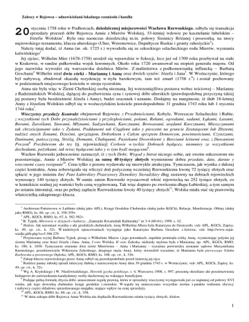 Zalescy w Rejowcu – odnowicielami lokalnego rzemiosła i handlu stycznia 1758 roku w Podhorcach, dziedzicznej miejscowości Wacława Rzewuskiego, odbyła się transakcja sprzedaży przezeń dóbr Rejowca Annie z Mierów Wolskiej, 33-letniej wdowie po kasztelanie lubelskim – Józefie Wolskim1. Była ona naonczas dziedziczką m.in. połowy Siennicy Różanej i posesorką, na mocy mężowskiego testamentu, klucza uherskiego (Uher, Weremowice, Depułtycze Ruskie i grunty rahożyckie2). Należy tutaj dodać, iż Anna (ur. ok. 1725 r.) wywodziła się ze szkockiego szlacheckiego rodu Mierów, wyznania kalwińskiego3 Jej ojciec, Wilhelm Mier (1678-1758) urodził się wprawdzie w Szkocji, lecz już od 1709 roku przebywał na stałe w Krakowie, w randze pułkownika wojsk koronnych. Około roku 1720 awansował na stopień generała majora. Od jego nazwiska wywodzi się warszawska dzielnica Mirów. Z małżeństwa z podkomorzanką inflancką – Barbarą Geschanu4 Wilhelm miał dwie córki - Mariannę i Annę oraz dwóch synów: Józefa i Jana5. W Wożuczynie, którego był nabywcą, zbudował okazałą rezydencję w stylu barokowym, tam też zmarł (1758 r.6) i został pochowany w podziemiach miejscowego kościoła w stroju rycerskim. Anna nie była więc w Ziemi Chełmskiej osobą nieznaną. Jej wstrzemięźliwa postawa wobec teściowej – Marianny z Radzimińskich Wolskiej, dążącej do pozbawienia syna i synowej dóbr uherskich (prawdopodobną przyczyną takiej jej postawy była bezdzietność Józefa i Anny), budzi szacunek i uznanie. Dodajmy na marginesie, iż ślub 18-letniej Anny z Józefem Wolskim odbył się w wożuczyńskim kościele prawdopodobnie 31 grudnia 1743 roku lub 1 stycznia 1744 roku7. Wieczystey przedaży Kontrakt obejmował Rejowiec z Przedmieściami, Kobyle, Wereszcze Szlacheckie i Rubie, z wszystkiemi tych Dobr przynależytościami y przyległościami, polami, Rolami, ogrodami, sadami, Łąkami, Lasami, Borami, Zaroślami, Stawami, Młynami, Sadzawkami, Karczmami, Browarami, arędami Karczmami, Mieszczanami tak chrześcijanami iako y Żydami, Poddanemi tak Ciągłemi iako y pieszemi na gruncie Zostaiącemi lub Zbytemi, tudzież onych Żonami, Dziećmi, sprzężajem, Dobytkiem y Całym sprzętem Domowym, powinnościami, Czynszami, Daninami, pańszczyzną, Stróżą, Domami, Chałupami, Pasiekami Dworskiemi y Barciami leśnemi oraz z Dawaniem Prezent8 Prezbiterom do tey [tj. rejowieckiej] Cerkwie w tychże Dobrach będącey, niemniey ze wszystkiemi dochodami, pożytkami, tak teraz będącemi iako y w tym bydź mogącemi9. Wacław Rzewuski jednocześnie zaznaczył, iż z tych Dobr, Wygod y Intrat niczego sobie, ani swoim sukcesorom nie pozostawiając, Annie z Mierów Wolskiej za sumę 40 tysięcy złotych wymienione dobra przedaie, daie, daruie y wiecznemi czasy resignuie10. Cena tylko z pozoru wydawała się niezwykle atrakcyjna. Tymczasem, jak wynika z dalszej części kontraktu, Anna zobowiązała się wliczyć doń pożyczoną wcześniej Rzewuskiemu kwotę 72 tysięcy złotych oraz spłacić w jego imieniu Imć Pani Łubirskiey Pisarzowey Ziemskiey Sieradzkiey dług zastawny na dobrach rejowieckich wynoszący 140 tysięcy złotych. W sumie zatem Rzewuski wyszacował włość rejowiecką na 252 tysiące złotych, co w kontekście realnej jej wartości było ceną wygórowaną. Tak więc dopiero po zwróceniu długu Łubirskiej, a tym samym po ustaniu intromisji, oraz po pełnej zapłacie Rzewuskiemu kwoty 40 tysięcy złotych11, Wolska miała stać się prawowitą właścicielką zakupionego klucza. 20 1 Archiwum Państwowe w Lublinie (dalej jako APL), Księgi Grodzkie Chełmskie (dalej jasko KGCh), Relacje, Manifestacje, Oblaty (dalej jako RMO), ks. 60, op. cit., k. 358-359v. 2 APL, KGCh, RMO, ks. 67, k. 582-582v. 3 B. Typek, Mierowie w dziejach i kulturze, „Zamojski Kwartalnik Kulturalny” nr 3-4 (60-61), 1999, s. 42. 4 Ibidem. Jak natomiast wynika z akt grodzkich chełmskich, żoną Wilhelma Miera była Katarzyna de Grenszoth; vide APL, KGCh, Zapisy, ks. 49, op. cit., k. 32v. W niektórych opracowaniach występuje jako Katarzyna Barbara Geschaw z Jeżowa; vide http://www.sejmwielki.pl/b.php?o=5.396.279 5 Przytaczana wyżej Barbara Typek, pisząc o Wilhelmie Mierze i jego potomkach, zupełnie pominęła córkę Annę, wymieniając jedynie jej siostrę Mariannę oraz braci Józefa i Jana. Anna, I voto Wolska, II voto Zaleska, niekiedy mylona była z Marianną; np. APL, KGCh, RMO, ks. 180, k. 1030. Tymczasem istnienie dwu sióstr Mierówien – Anny i Marianny - wyraźnie potwierdza zeznanie sądowe Maxymiliana Kurnickiego, przedstawiciela Wiktoryna Zaleskiego, drugiego męża Anny, który stwierdził wyraźnie, iż Marianna była pierwszego Szlubu Karłowska a powtornego Dąbska; APL, KGCh, RMO, ks. 108, op. cit., k. 516. 6 Zakup klucza rejowieckiego przez Annę odbył się prawdopodobnie przed śmiercią jej ojca. 7 Rodzice panny młodej spisali intercyzę ślubną z narzeczonym Anny dnia 30 grudnia 1743 r. w Wożuczynie; vide APL, KGCh, Zapisy, ks. 49, op. cit., k. 32v. 8 Wg A. Kryńskiego i W. Niedźwiedzkiego, Słownik języka polskiego, t. 4, Warszawa 1908, s. 997, prezentą określano akt przedstawienia biskupowi do zatwierdzenia kandydatury osoby duchownej na wakujące beneficjum. 9 Podając pełną formułę zbycia dóbr, unaoczniam regułę prawną, która w sprzedaży wieczystej występowała już co najmniej od połowy XVI wieku, jak tego dowodzą chełmskie księgi grodzkie i ziemskie. W regule tej umieszczano wszystkie istotne z punktu widzenia zbywcy i nabywcy części składowe sprzedawanego majątku, mające wpływ na cenę sprzedaży. 10 APL, KGCh, RMO, ks. 60, op. cit., k. 358. 11 W dniu zakupu dóbr Rejowca Anna Wolska nie dopłaciła Rzewuskiemu ośmiu tysięcy złotych; ibidem. 1 Dodatkowy dług wyderkafowy (prowizyjny), zaciągnięty wcześniej przez sprzedawcę dóbr u Ojców Pijarów w Chełmie, wynoszący 33 tysiące złotych, został prze