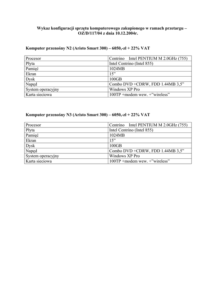 Wykaz konfiguracji sprzętu komputerowego zakupionego w ramach przetargu – OZ/D/117/04 z dnia 10.12.2004r. Komputer przenośny N2 (Aristo Smart 300) – 6050,-zł + 22% VAT Procesor Płyta Pamięć Ekran Dysk Napęd System operacyjny Karta sieciowa Centrino Intel PENTIUM M 2.0GHz (755) Intel Centrino (Intel 855) 1024MB 15” 100GB Combo DVD +CDRW, FDD 1.44MB 3,5” Windows XP Pro 100TP +modem wew. +”wireless” Komputer przenośny N3 (Aristo Smart 300) – 6050,-zł + 22% VAT Procesor Płyta Pamięć Ekran Dysk Napęd System operacyjny Karta sieciowa Centrino Intel PENTIUM M 2.0GHz (755) Intel Centrino (Intel 855) 1024MB 15” 100GB Combo DVD +CDRW, FDD 1.44MB 3,5” Windows XP Pro 100TP +modem wew. +”wireless”