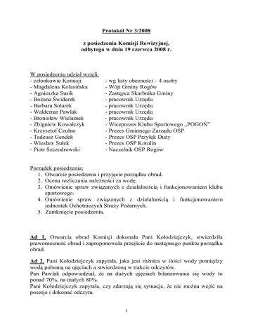 Protokół Nr 3/2008 z posiedzenia Komisji Rewizyjnej, odbytego w dniu 19 czerwca 2008 r. W posiedzeniu udział wzięli: - członkowie Komisji - Magdalena Kolasińska - Agnieszka Susik - Bożena Świderek - Barbara Solarek - Waldemar Pawlak - Bronisław Wielamek - Zbigniew Kowalczyk - Krzysztof Czułno - Tadeusz Gendek - Wiesław Sułek - Piotr Szczodrowski - wg listy obecności – 4 osoby - Wójt Gminy Rogów - Zastępca Skarbnika Gminy - pracownik Urzędu - pracownik Urzędu - pracownik Urzędu - pracownik Urzędu - Wiceprezes Klubu Sportowego „POGOŃ” - Prezes Gminnego Zarządu OSP - Prezes OSP Przyłęk Duży - Prezes OSP Kotulin - Naczelnik OSP Rogów Porządek posiedzenia: 1. Otwarcie posiedzenia i przyjęcie porządku obrad. 2. Ocena rozliczania należności za wodę. 3. Omówienie spraw związanych z działalnością i funkcjonowaniem klubu sportowego. 4. Omówienie spraw związanych z działalnością i funkcjonowaniem jednostek Ochotniczych Straży Pożarnych. 5. Zamknięcie posiedzenia. Ad 1. Otwarcia obrad Komisji dokonała Pani Kołodziejczyk, stwierdziła prawomocność obrad i zaproponowała przejście do następnego punktu porządku obrad. Ad 2. Pani Kołodziejczyk zapytała, jaka jest różnica w ilości wody pomiędzy wodą pobraną na ujęciach a stwierdzoną w trakcie odczytów. Pan Pawlak odpowiedział, że na dużych ujęciach bilansowanie się wody to ponad 70%, na małych 80%. Pani Kołodziejczyk zapytała, czy zdarzają się sytuacje, że nie można wejść na posesje i dokonać odczytu. 1 Pan Pawlak odpowiedział, że tak. Pani Wójt wyjaśniła, że często zdarzają się sytuacje, iż ludzie nie odbierają upomnień ani wezwań do zapłaty. Pani Świderek powiedziała, że występują takie przypadki, kiedy koszty ściągalności przekraczają wartość dostarczonej wody. Pan Lubczyński zapytał, czy wszyscy odbiorcy mają zainstalowane liczniki. Pan Pawlak odpowiedział, że prawie wszędzie, brak natomiast taryfikatora a tym samym możliwości nakładania sankcji. Chodzi głównie o osoby, które zerwą plombę nie zgłaszając tego faktu. Pan Dybała powiedział, że według niego największym dłużnikom należy blokować odbiór wody. Pan Kołada zauważył, że Pan Pawlak mówił o odcięciu wody, lecz często nie ma możliwości by wejść na posesję. Pani Kołodziejczyk stwierdziła, że według niej dopuszczalną stratą jest 10%. Pani Świderek zapoznała członków Komisji z wykazem największych dłużników ( stanowi on załącznik do protokółu). Pani Kołodziejczyk powiedziała, że jej zdaniem, kiedy kolejne faktury nie zostają zapłacone, pobór wody należy odciąć. Pani Świderek wyjaśniła, iż należności ściągane przez komornika są na niezłym poziomie. Dodała, że problem jest w sytuacji śmierci odbiorcy. Pani Kołodziejczyk odpowiedziała, że w takiej sytuacji należy zdecydowanie odciąć. Pan Pawlak wyjaśnił, że sam nie może podejmować takich interwencji, ale zgłasza ten problem przełożonym i oni decydują o ewentualnym odcięciu. Pani Kołodziejczyk uznała, że reagować na zadłużenie należy dużo szybciej, np. w przypadku piekarni „PAWEX”. Pani Świderek odpowiedziała, że w tym przypadku działania zostały podjęte. Pani Kołodziejczyk wyjaśniła, że trzeba podejmować je szybko. Pan Dybała powiedział, że gdyby w kilku przypadkach doszło do bardziej restrykcyjnych posunięć nie zaistniałyby podobne sytuacje. Pan Lubczyński zapytał, czy jest możliwe, aby sołtys mógł ujawnić dane dotyczące zadłużenia. Pani Solarek odpowiedziała, że takich danych nie wolno ujawniać. Pani Świderek wyjaśniła, że byłoby to sprzeczne z ustawą o ochronie danych osobowych. Pani Kołodziejczyk zaproponowała, aby Komisja przyjęła wniosek zobowiązujący Wójta do podejmowania szybszych działań w sytuacji, kiedy powstaje zadłużenie. Pozostali członkowie Komisji zgodzili się z tą propozycją i wniosek został przyjęty. Pani Kołodziejczyk zgłosiła również sugestię by radca prawny dokonał analizy umów na odbiór wody. Pan Pawlak poinformował zebranych, iż Gmina notuje duże straty na wodzie dostarczanej na teren Gminy Jeżów. 2 Pani Solarek powiedziała, że Pani Wójt zawarła już w tej sprawie porozumienie z Gminą Jeżów. Pani Kołodziejczyk zapytała, co z jakością wody. Pan Pawlak odpowiedział, że wyniki badań pokazują, iż jest dobra. Pani Solarek dodała, że badania są wykonywane, co 2 miesiące i faktycznie wychodzi z nich, że jakość wody jest dobra. Ad 3. Pan Kowalczyk przedstawił Komisji sprawozdanie finansowe z działalności Klubu. Dodał, że wszystko jest udokumentowane rachunkami. Wyjaśnił, że koszt wyjazdu obejmują 11 meczów seniorów i 15 młodzików (sprawozdanie stanowi załącznik do protokółu). Pani Kołodziejczyk powiedziała, że Klub wygrywa konkurs, rozlicza się na podstawie faktur i koniec. Tymczasem na jednej z sesji Rady Gminy padł zarzut nie przedstawiania sprawozdania przed komisją rewizyjną Klubu. Drugi dotyczył braku jej posiedzeń. Pani Kołodziejczyk wyjaśniła, że chodzi o to, aby przewodniczący komisji rewizyjnej Klubu potwierdzał sprawozdanie Prezesa Klubu. Pan Lubczyński powiedział Panu Kowalczykowi, że działacze Klubu nie wiedzą, iż radni różnie oceniają poruszone właśnie kwestie. Dodał, że kiedy komisja rewizyjna Klubu dokona sprawdzenia sprawozdania nie będzie potrzebna kontrola Komisji Rewizyjnej Rady Gminy. Pan Kowalczyk powiedział, że obowiązek zwołania posiedzenia komisji rewizyjnej ciąży na jej przewodniczącym. Dodał, że trudno oczekiwać inicjatywy zarządu w tej sprawie. Pan Lubczyński zapytał, czy Klub ma sponsorów. Pan Kowalczyk odpowiedział, że wpływają pewne kwoty. Podał, że np. „Top Plast” wpłacił dwa razy po 500 zł. Ponadto Klub ma umowę sponsorską z Panem Janem Wojdalem, który wpłacił jednorazowo 1.200 zł. Pan Lubczyński powiedział, że ma nadzieję,
