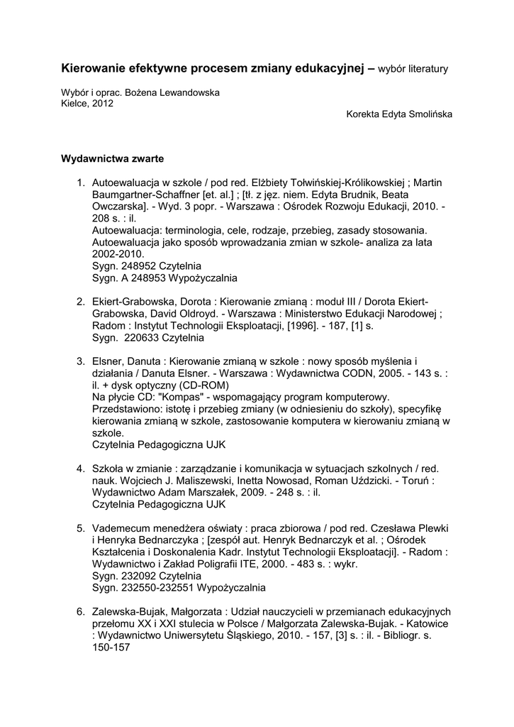 Kierowanie efektywne procesem zmiany edukacyjnej – wybór literatury Wybór i oprac. Bożena Lewandowska Kielce, 2012 Korekta Edyta Smolińska Wydawnictwa zwarte 1. Autoewaluacja w szkole / pod red. Elżbiety Tołwińskiej-Królikowskiej ; Martin Baumgartner-Schaffner [et. al.] ; [tł. z jęz. niem. Edyta Brudnik, Beata Owczarska]. - Wyd. 3 popr. - Warszawa : Ośrodek Rozwoju Edukacji, 2010. 208 s. : il. Autoewaluacja: terminologia, cele, rodzaje, przebieg, zasady stosowania. Autoewaluacja jako sposób wprowadzania zmian w szkole- analiza za lata 2002-2010. Sygn. 248952 Czytelnia Sygn. A 248953 Wypożyczalnia 2. Ekiert-Grabowska, Dorota : Kierowanie zmianą : moduł III / Dorota EkiertGrabowska, David Oldroyd. - Warszawa : Ministerstwo Edukacji Narodowej ; Radom : Instytut Technologii Eksploatacji, [1996]. - 187, [1] s. Sygn. 220633 Czytelnia 3. Elsner, Danuta : Kierowanie zmianą w szkole : nowy sposób myślenia i działania / Danuta Elsner. - Warszawa : Wydawnictwa CODN, 2005. - 143 s. : il. + dysk optyczny (CD-ROM) Na płycie CD: "Kompas" - wspomagający program komputerowy. Przedstawiono: istotę i przebieg zmiany (w odniesieniu do szkoły), specyfikę kierowania zmianą w szkole, zastosowanie komputera w kierowaniu zmianą w szkole. Czytelnia Pedagogiczna UJK 4. Szkoła w zmianie : zarządzanie i komunikacja w sytuacjach szkolnych / red. nauk. Wojciech J. Maliszewski, Inetta Nowosad, Roman Uździcki. - Toruń : Wydawnictwo Adam Marszałek, 2009. - 248 s. : il. Czytelnia Pedagogiczna UJK 5. Vademecum menedżera oświaty : praca zbiorowa / pod red. Czesława Plewki i Henryka Bednarczyka ; [zespół aut. Henryk Bednarczyk et al. ; Ośrodek Kształcenia i Doskonalenia Kadr. Instytut Technologii Eksploatacji]. - Radom : Wydawnictwo i Zakład Poligrafii ITE, 2000. - 483 s. : wykr. Sygn. 232092 Czytelnia Sygn. 232550-232551 Wypożyczalnia 6. Zalewska-Bujak, Małgorzata : Udział nauczycieli w przemianach edukacyjnych przełomu XX i XXI stulecia w Polsce / Małgorzata Zalewska-Bujak. - Katowice : Wydawnictwo Uniwersytetu Śląskiego, 2010. - 157, [3] s. : il. - Bibliogr. s. 150-157 Spis treści. 1. Teoretyczne aspekty badań nad udziałem nauczycieli w przemianach oświatowych drugiej połowy lat dziewięćdziesiątych XX stulecia w Polsce. Pedagogiczny aspekt pojęcia reformy oraz udziału nauczycieli w przemianach oświatowych. Polska edukacja a wyzwania cywilizacyjne. Zmiany reformatorskie ostatniego dziesięciolecia jako odpowiedź na globalne i polskie wyzwania cywilizacyjne. Znaczenie i rola nauczyciela w wybranych systemach edukacyjnych. Zmienność w edukacji a współczesny nauczyciel. Metodologiczne podstawy reform oświatowych - historia przemian. Szkoła w okresie przeobrażeń. Kryzys szkoły oraz postulaty jej zmiany. Działania reformatorskie w latach dziewięćdziesiątych. Funkcje, zadania oraz cechy współczesnej szkoły. Kierowanie szkołą w okresie zmian. Nauczyciel w przemianach edukacyjnych. Nauczyciel - nowe wyzwania. Nowy profil kwalifikacji zawodowych nauczycieli. Proces kształcenia nauczycieli w obliczu przemian edukacyjnych. Podstawy metodologiczne badań nad udziałem nauczycieli w reformowaniu szkolnictwa. Postawy, opinie oraz udział nauczycieli w przemianach oświatowych jako przedmiot podjętych badań empirycznych. Obszary badawczych poszukiwań - pytania badawcze i zakładane odpowiedzi. Charakterystyka zastosowanych metod gromadzenia danych oraz organizacja badań empirycznych. Nauczyciele wobec reformy systemu szkolnego końca lat dziewięćdziesiątych XX stulecia w Polsce - opinie i formy udziału (raport z badań). Miejsce nauczycieli w reformie szkolnictwa w świetle ustaw sejmowych i rozporządzeń towarzyszących. Powinności nauczyciela w zreformowanej szkole. Wymagania kwalifikacyjne wobec nauczycieli w nowej rzeczywistości szkolnej oraz ich awans zawodowy. Ocena nauczycieli w świetle obowiązującego prawa. Nawiązanie, zmiana i rozwiązanie stosunku pracy z nauczycielem. Warunki pracy i wynagrodzenia nauczycieli. Wymagania wobec osób zajmujących stanowisko dyrektora szkoły oraz stawiane im ogólne zadania. Przejawy i uwarunkowania udziału nauczycieli w reformowaniu szkolnictwa. Konieczność oraz przyczyny wprowadzenia reformy szkolnictwa w opinii badanych. Formy uczestnictwa nauczycieli w reformie oświatowej oraz czynniki warunkujące to uczestnictwo. Przygotowanie nauczycieli do reformowanej rzeczywistości edukacyjnej. Formy indywidualnej pracy nauczyciela z uczniem o specyficznych potrzebach edukacyjnych. Samokształcenie i doskonalenie zawodowe nauczycieli oraz czynniki warunkujące tę aktywność. Współpraca nauczycieli z instytucjami mającymi wpływ na oświatę. Działalność nauczycieli w zakresie przygotowywania reformy oświatowej. Formy uczestnictwa badanych osób w reformie oświatowej. Opinia badanych o przeobrażeniach edukacyjnych przełomu XX i XXI stulecia w Polsce. Założenia teoretyczne reformy oraz nowe programy nauczania. Zreformowany system finansowania oświaty i przygotowanie szkół do reformy oświatowej. Możliwości zawodowe nauczycieli w zreformowanym systemie oświatowym. Działalność edukacyjna gmin w opinii badanych. Wydawnictwa ciągłe 7. Dróżka, Wanda : Nauczycielska dojrzałość : średnie pokolenie nauczycieli wobec zmiany społeczno-edukacyjnej w Polsce w świetle badań autobiograficznych : zarys koncepcji badań / Wanda Dróżka // "Edukacja". 2003, nr 2, s. 92-97 Szczegółowe omówienie koncepcji badań nad wpływem zmian na nauczycieli średniego pokolenia. Czytelnia PBW 8. Ekiert-Grabowska, Dorota : Kierowanie zmianą / Dorota Ekiert-Grabowska // "Nowa Szkoła". - 1994, nr 1, s. 10-14 Strategie wprowadzania zmian w szkole (innowacji, modyfikacji, usprawnień), niezależnie od ich źródła. Czynniki determinujące przyswajanie zmian. Planowanie, wdrażanie i ocenianie efektów zmiany. Czytelnia PBW 9. Elsner, Danuta : Kierowanie zmianą / Danuta Elsner // "Dyrektor Szkoły". 19