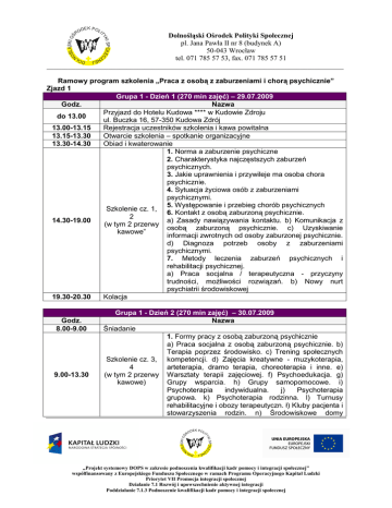 Dolnośląski Ośrodek Polityki Społecznej pl. Jana Pawła II nr 8 (budynek A) 50-043 Wrocław tel. 071 785 57 53, fax. 071 785 57 51 __________________________________________________________________________________ Ramowy program szkolenia „Praca z osobą z zaburzeniami i chorą psychicznie” Zjazd 1 Grupa 1 - Dzień 1 (270 min zajęć) – 29.07.2009 Godz. Nazwa Przyjazd do Hotelu Kudowa **** w Kudowie Zdroju do 13.00 ul. Buczka 16, 57-350 Kudowa Zdrój 13.00-13.15 Rejestracja uczestników szkolenia i kawa powitalna 13.15-13.30 Otwarcie szkolenia – spotkanie organizacyjne 13.30-14.30 Obiad i kwaterowanie 1. Norma a zaburzenie psychiczne 2. Charakterystyka najczęstszych zaburzeń psychicznych. 3. Jakie uprawnienia i przywileje ma osoba chora psychicznie. 4. Sytuacja Ŝyciowa osób z zaburzeniami psychicznymi. 5. Występowanie i przebieg chorób psychicznych Szkolenie cz. 1, 6. Kontakt z osobą zaburzoną psychicznie. 2 14.30-19.00 a) Zasady nawiązywania kontaktu. b) Komunikacja z (w tym 2 przerwy osobą zaburzoną psychicznie. c) Uzyskiwanie kawowe” informacji zwrotnych od osoby zaburzonej psychicznie. d) Diagnoza potrzeb osoby z zaburzeniami psychicznymi. 7. Metody leczenia zaburzeń psychicznych i rehabilitacji psychicznej. a) Praca socjalna / terapeutyczna - przyczyny trudności, moŜliwości rozwiązań. b) Nowy nurt psychiatrii środowiskowej 19.30-20.30 Kolacja Godz. 8.00-9.00 9.00-13.30 Grupa 1 - Dzień 2 (270 min zajęć) – 30.07.2009 Nazwa Śniadanie 1. Formy pracy z osobą zaburzoną psychicznie a) Praca socjalna z osobą zaburzoną psychicznie. b) Terapia poprzez środowisko. c) Trening społecznych Szkolenie cz. 3, kompetencji. d) Zajęcia kreatywne - muzykoterapia, arteterapia, dramo terapia, choreoterapia i inne. e) 4 (w tym 2 przerwy Warsztaty terapii zajęciowej. f) Psychoedukacja. g) kawowe) Grupy wsparcia. h) Grupy samopomocowe. i) Psychoterapia indywidualna. j) Psychoterapia grupowa. k) Psychoterapia rodzinna. l) Turnusy rehabilitacyjne i obozy terapeutyczn. ł) Kluby pacjenta i stowarzyszenia rodzin. n) Środowiskowe domy „Projekt systemowy DOPS w zakresie podnoszenia kwalifikacji kadr pomocy i integracji społecznej” współfinansowany z Europejskiego Funduszu Społecznego w ramach Programu Operacyjnego Kapitał Ludzki Priorytet VII Promocja integracji społecznej Działanie 7.1 Rozwój i upowszechnienie aktywnej integracji Poddziałanie 7.1.3 Podnoszenie kwalifikacji kadr pomocy i integracji społecznej Dolnośląski Ośrodek Polityki Społecznej pl. Jana Pawła II nr 8 (budynek A) 50-043 Wrocław tel. 071 785 57 53, fax. 071 785 57 51 __________________________________________________________________________________ samopomocy, hostele, firmy społeczne. 2. Zasady kontraktu pracownika socjalnego z osobą z zaburzeniami psychicznymi. 3. Trudności pracownika socjalnego w pracy z osobą z zaburzeniami psychicznymi. a) ograniczenia wynikające z zaŜywania leków. b) zachowania agresywne osób z zaburzeniami psychicznymi. c) tendencje samobójcze osób z zaburzeniami psychicznymi 4. Przykłady dobrych praktyk – pracy socjalnej i terapeutycznej z osobami z zaburzeniami psychicznymi. a) Projekcja filmów b) Dyskusja grupowa w oparciu o własne doświadczenia. 5. Rola rodziny w terapii i rehabilitacji osoby z zaburzeniem psychicznym. a) Problemy i zadania rodziny. b) Komunikacja i współpraca. c) Nadmierna opiekuńczość. d) Nadmierne uwikłanie uczuciowe. e) Agresja i krytycyzm. f) Kontakty społeczne 6. Praca z osobą chorą psychicznie - współpraca pracownika socjalnego, psychiatry i psychologa w leczeniu zaburzeń psychicznych. 7. Ustawa o ochronie zdrowia psychicznego i jej konsekwencje dla praktyki pracy socjalnej . a) Odmowa leczenia psychiatrycznego. b)Badanie psychiatryczne a zgoda pacjenta. c) Przyjecie do szpitala psychiatrycznego.d) Leczenie na oddziale psychiatrycznym a przymus bezpośredni. e) Problem ubezwłasnowolnienia osoby z zaburzeniem psychicznym. 13.30-14.30 14.30-15.30 19.30-20.30 Godz. 8.00-9.00 9.00-13.30 Obiad Czas wolny Kolacja grilowa Grupa 1 - Dzień 3 (270 min zajęć) – 31.07.2009 Nazwa Śniadanie Szkolenie cz. 5, 1. Komunikacja z osobą z zaburzeniami psychicznymi 6 w sytuacjach ostrych i zagroŜenia zdrowia i Ŝycia. (w tym 1 przerwa a) Zasady bezpiecznego kontaktu. b) Interwencja w kawowa) kryzysie. 6–etapowy model interwencji kryzysowej. c) „Projekt systemowy DOPS w zakresie podnoszenia kwalifikacji kadr pomocy i integracji społecznej” współfinansowany z Europejskiego Funduszu Społecznego w ramach Programu Operacyjnego Kapitał Ludzki Priorytet VII Promocja integracji społecznej Działanie 7.1 Rozwój i upowszechnienie aktywnej integracji Poddziałanie 7.1.3 Podnoszenie kwalifikacji kadr pomocy i integracji społecznej Dolnośląski Ośrodek Polityki Społecznej pl. Jana Pawła II nr 8 (budynek A) 50-043 Wrocław tel. 071 785 57 53, fax. 071 785 57 51 __________________________________________________________________________________ 13.30-13.40 13.40-14.40 Współpraca z innymi słuŜbami pomocowymi. 2. Spotkania postinterwencyjne pracowników socjalnych. 3. Debriefing indywidualny i grupowy. a) Zastosowanie procedur debriefingu u pracowników socjalnych. b) Zasady prowadzenia debriefingu indywidualnego. c) Zasady prowadzenia debriefingu grupowego 4. Defusing . a) Zastosowanie procedur defusingu u pracowników socjalnych b) Zasady prowadzenia defusingu 5. Superwizja w pracy z osobami z zaburzeniami psychicznymi. Rozdanie certyfikatow, koniec szkolenia Obiad ZJAZD 2 Godz. do 11.00 11.00-11.15 11.15-11.30 11.30-13.30 13.30-14.30 14.30-17.00 Grupa 2 - Dzień 1 (270 min zajęć) – 05.08.2009 Nazwa Przyjazd do Hotelu Kudowa **** w Kudowie Zdroju ul. Buczka 16, 57-350 Kudowa Zdrój Rejestracja uczestników szkolenia i kawa powitalna Otwarcie szkolenia – spotkanie organizacyjne 1. Norma a zaburzenie psychiczne 2. Charakterystyka najczęstszych zaburzeń psychicznych. Szkolenie cz. 1 3. Jakie uprawnienia