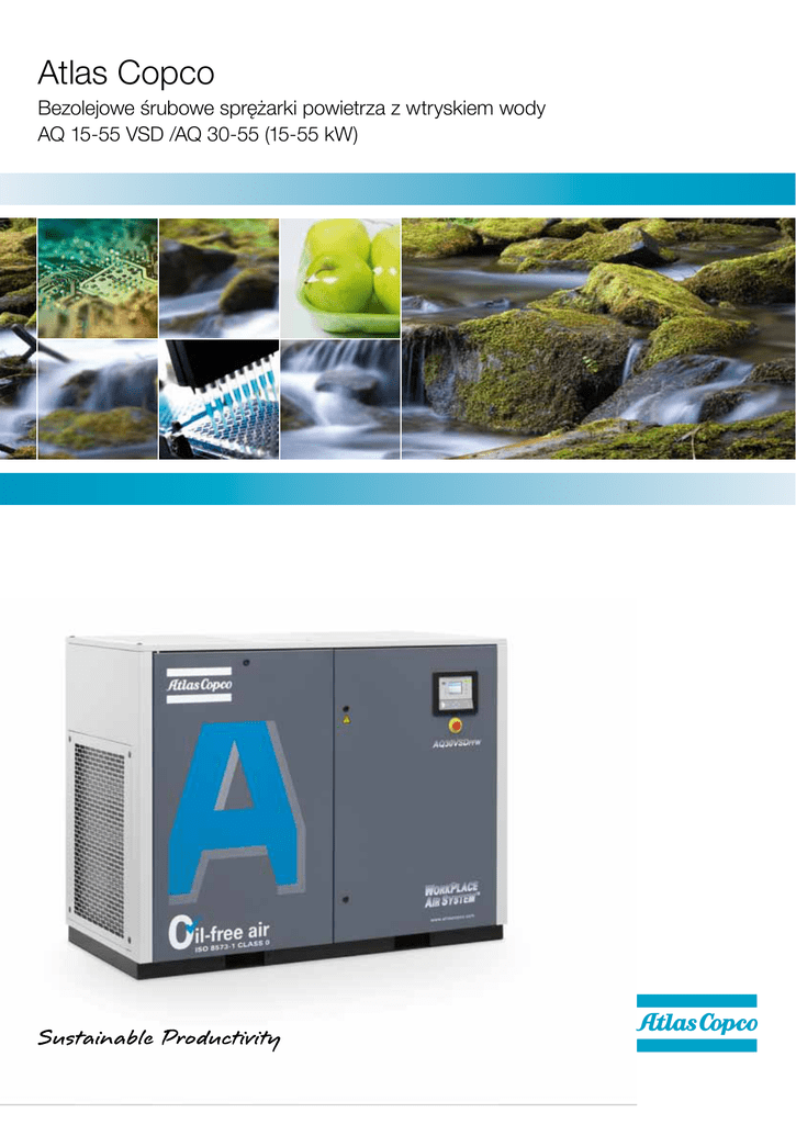 Atlas Copco Bezolejowe śrubowe sprężarki powietrza z wtryskiem wody AQ 15-55 VSD /AQ 30-55 (15-55 kW) Powietrze bezolejowe – wysoka jakość, ekonomiczne rozwiązania Czyste sprężone powietrze bez domieszek oleju jest warunkiem koniecznym do utrzymania stałości i wysokiej jakości wielu procesów produkcyjnych. Od wielu lat Atlas Copco jest pionierem w rozwoju bezolejowej technologii śrubowej projektując szeroką gamę sprężarek wytwarzających w 100% pozbawione oleju czyste powietrze. Określając normę dla czystości powietrza dzięki świadectwu ISO 8573-1 CLASS 0 seria AQ sprężarek śrubowych z wtryskiem wody spełnia surowe wymagania dotyczące czystego, pozbawionego oleju powietrza, oferując możliwość pracy przy wysokim ciśnieniu i lepsze wykorzystanie energii Niższe koszty energii Koszt energii może stanowić ponad 70% całkowitego kosztu eksploatacji sprężarki (LCC). Najbardziej ekonomiczne rozwiązanie instalacji sprężonego powietrza dopasowuje wartość ciśnienia, wydajność i konieczność zastosowania urządzeń uzdatniających sprężone powietrze do wymagań konkretnego procesu produkcyjnego. Sprężarki AQ Atlas Copco łączą te wszystkie parametry w jednym urządzeniu umożliwiając oszczędności nawet do 40% całkowitego kosztu energii. Wykluczone niebezpieczeństwo zanieczyszczenia olejem Doświadczenia i innowacyjność Przemysł farmaceutyczny, przemysł spożywczy, elektronika to jedne z wielu dziedzin, w których wymagane jest sprężone powietrze najwyższej jakości gwarantujące ściśle określoną jakość produktu końcowego i ściśle określony przebieg procesu produkcyjnego. Opracowane specjalnie z myślą o zastosowaniach wymagających najwyższego poziomu czystości bezolejowe sprężarki serii AQ wykluczają niebezpieczeństwo zanieczyszczenia olejem, co mogłoby doprowadzić do ponoszenia dodatkowych kosztów. Od ponad sześćdziesięciu lat Atlas Copco jest liderem na rynku w technologii bezolejowego sprężania powietrza dzięki doświadczeniu i stałym innowacjom technicznym. Mając na uwadze ochronę procesów produkcyjnych u naszych Klientów stworzyliśmy serię sprężarek AQ gwarantującą wytwarzanie sprężonego powietrza w 100% bezolejowego, którego Państwo potrzebują. Napęd o zmiennej prędkości obrotowej Dzięki automatycznemu dopasowaniu wydatku sprężarki do aktualnego poboru sprężonego powietrza wymagana jest minimalna ilość energii, co pozwala na oszczędności ok 35% jej kosztów Napęd o zmiennej prędkości obrotowej pozwala na wyeliminowanie nieefektywnego okresu przejściowego między pełnym dociążeniem i brakiem dociążenia Wysoka efektywność pracy Filtrując wodę w obwodzie smarowania, filtr wody zapewnia stałe zasilanie czystym środkiem smarującym W porównaniu do zewnętrznych układów chłodzenia koszty instalacji maszyny chłodzonej powietrzem są wyjątkowo niskie dzięki wymiennikom ciepła powietrze – powietrze i powietrze – woda Wyjątkowa odporność Wykonana z aluminium i brązu obudowa elementu sprężającego zapewnia wyjątkową trwałość i odporność. Wyeliminowane zostało niebezpieczeństwo korozji wewnątrz elementu sprężającego. Zastosowanie łożysk hydrodynamicznych gwarantuje długi okres ich eksploatacji ze względu na to, że nie dochodzi do kontaktu pomiędzy poszczególnymi elementami wewnątrz łożyska. Stworzone by spełniać indywidualne wymagania użytkowników Celem działalności Atlas Coco jest wyposażanie naszych Klientów w sprężarki, które spełniają, a nawet przewyższają ich wymagania i oczekiwania. Seria sprężarek śrubowych AQ z wtryskiem wody skonstruowana na bazie wieloletnich doświadczeń w pracy z technologią bezolejową przy wykorzystaniu naszej szerokiej wiedzy i praktyki stała się liderem w swojej klasie na rynku sprężarek. 1 Filtr powietrza SAE, oczyszczanie dokładne 99,5% SAE, oczyszczanie zgrubne 99,9% 2 Filtr wody 5 Filtrując wodę w obwodzie smarowania, filtr wody zapewnia stałe zasilanie czystym środkiem smarującym. Zdolność filtracji wynosi 10 mikronów przez cały okres żywotności filtra. 2 1 3 Zbiornik separatora 3 Zbiornik separatora wody ze stali nierdzewnej służący do separacji poprzez działanie siły odśrodkowej i siły ciężkości. W zestawie znajdują się dwa czujniki (dolny i górny) pozwalające utrzymać prawidłowy poziom wody. 9 4 Silnik indukcyjny Silnik indukcyjny IP55, kołnierzowy, zapewniający doskonałe centrowanie. Bezpośredni układ napędowy dla uzyskania doskonałej wydajności energetycznej. AQ 55 VSD chłodzona powietrzem 5 Wersja chłodzona powietrzem i wodą Sprężarki z serii AQ są dostępne w wersji chłodzonej powietrzem lub wodą. W porównaniu do zewnętrznych układów chłodzenia zarówno powierzchnia konieczna do instalacji sprężarki jak i koszt tej instalacji są niewielkie dzięki wykonanym ze stali nierdzewnej wymiennikom ciepła powietrze – powietrze i powietrze – woda. Zastosowanie nowego, dużego wymiennika woda-woda pozwoliło na utrzymanie praktycznie stałej temperatury wody przy wlocie osuszacza wynoszącą poniżej 55°C bez użycia chłodnicy końcowej. 11 Łożyska elementu sprężającego Do pracy elementu sprężającego nie jest konieczny olej. Nawet łożyska elementu są smarowane wodą, co powoduje, że sprężone powietrze jest w 100% wolne od domieszek oleju. Łożyska są bezsmarowe, eliminując w ten sposób ryzyko zanieczyszczenia. Warstwa wody w łożyskach zapewnia ich dłuższą żywotność i jednocześnie płynny ruch obrotowy w elemencie sprężającym. 10 System odwróconej osmozy Woda podawana przez wtryskiwacze to woda destylowana lub woda uzyskana w procesie odwróconej osmozy. Wbudowany system odwróconej osmozy zapewnia stały dopływ wysokiej jakości wody, nie dopuszczając do powstania korozji ani rozwoju bakterii. 9 Pompa wody 6 8 Pompa wody zwiększa ciśnienie w łożysku podczas rozruchu i pracy na b