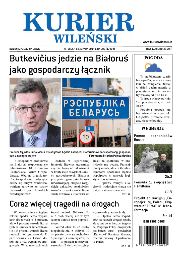 www.kurierwilenski.lt DZIENNIK POLSKI NA LITWIE WTOREK 4 LISTOPADA 2014 r. Nr. 208 (17494) cena 1,20 Lt (0,35 EUR) Butkevičius jedzie na Białoruś jako gospodarczy łącznik POGODA W najbliższym czasie bez opadów, w nocy i rano lokalne zamglenia.Dzisiaj w dzień zachmurzenie z przejaśnieniami, termometry wskażą od 8 do 13 st. W środę w nocy od 4 do 7 st. powyżej zera, w dzień 10-12. Podobna pogoda ma być również w czwartek. Od piątku przelotne deszcze, nieco chłodniej. W NUMERZE Pomoc Rossie poznaniaków Premier Algirdas Butkevičius w Mohylewie będzie zachęcał Białorusinów do współpracy gospodarczej z naszym krajem Fotomontaż Marian Paluszkiewicz 4 listopada w Mohylewie na Białorusi rozpoczyna się jubileuszowe 10. Litewsko-Białoruskie Forum Gospodarcze. Według organizatorów, to spotkanie tradycyjnie cieszy się dużym zainteresowaniem zarówno ze strony białoruskich, jak i litewskich przedsiębiorców. Jednak w tegorocznej imprezie litewscy uczestnicy chętnie biorą udział również w kontekście rosyjskich sankcji gospodarczych, Białoruś jest postrzegana jako łącznik umożliwiający obejście rosyjskich zakazów. Aczkolwiek rozmów o reeksporcie litewskich towarów z Białorusi do Rosji na spotkaniu w Mohylewie nie będzie. Przynajmniej nieoficjalnie. Oficjalnie tematami spotkania będzie współpraca w zakresie logistyki oraz innowacji. — Sprawy tranzytu i logistyki tradycyjnie cieszą się dużym zainteresowaniem. str. 4 » Coraz więcej tragedii na drogach W porównaniu z ubiegłym rokiem spadła liczba wypadków drogowych o 4 procent, ale o 1 procent wzrosła liczba tych ze skutkiem śmiertelnym i o 1,5 procent wzrosła liczba rannych. W tym roku do 31 października na Litwie doszło do 2 422 wypadków drogowych. W zdarzeniach tych śmierć poniosło 206 osób. To o 7 osób więcej niż w tym samym okresie roku poprzedniego. Wśród ofiar to 22 osoby niepełnoletnie, z których 10 — pasażerowie samochodów, 5 pieszych, 4 rowerzystów, jeden — to pasażer motocykla, natomiast 2 kierowców zginę- ło, prowadząc samochody. — Ogólna liczba wypadków na naszych drogach spada, ale są one coraz bardziej tragiczne. Przyczyn kolizji drogowych jest bardzo dużo – powiedział „Kurierowi” Ramūnas Matonis, rzecznik prasowy Departamentu Policji. str. 5 » Str.3 Formuła 1: zwycięstwo Hamiltona Str. 8 Projekt edukacyjny „Europejczycy, Polacy, Obywatele” TEMAT IV: Transformacja Str. 14 ISSN 1392-0405 WYDARZENIA 3 KURIER WILEŃSKI • Wtorek, 4 listopada 2014 r. Pomoc poznaniaków Rossie 33 400 złotych — taką sumę zebrano 1 listopada podczas tegorocznej kwesty na poznańskich cmentarzach. Uzyskane środki pomogą w odnowieniu kolejnych pomników na zabytkowym cmentarzu – wileńskiej Rossie. Tym razem przeprowadzone zostaną prace restauracyjne dachu kaplicy Jeleńskich, grobu rodziny Rodziewiczów oraz pomnika Michała Innocentego Buthardta. Tradycyjna akcja — którą zapoczątkował proboszcz parafii pw. św. Kazimierza w Gułtowach, ksiądz Edmund Jaworski — w tym roku była kolejno piętnastą. Jak i dotychczas kwestujący, wśród których byli politycy, aktorzy, ludzie nauki oraz dziennikarze z poznańskich mediów ze specjalnie oznakowanymi puszkami, oraz identyfikato- rami, zachęcali do wrzucania datków, które pójdą na rzecz odnowienia Rossy — tej jednej z najstarszych nekropolii w Europie, która, niestety, jest bardzo zniszczona. Przypominając początki tej akcji śmiało można powiedzieć, że jej sukces to ciągłość. A to zasługa właśnie księdza Jaworskiego, który potrafił nadać jej życia, zaangażować do niej wielu ludzi z różnych branż oraz oczywiście poznańskie media, które rokrocznie ją nagłaśniają. Sam ksiądz rozpoczynając tę tak ważną akcję, kiedyś przyznał, że sam się nie spodziewał, że przyniesie ona takie skutki. Że powstanie taka wielka fala dobra, w której weźmie udział tak wielu ludzi, zarówno przekazujących swoje pieniądze na renowację grobów, jak i chętnych do udziału w kwestowaniu. H. G. Sukces akcji to zasługa księdza Jaworskiego Fot. M. P. EUROPEJSKA FUNDACJA PRAW CZŁOWIEKA UDZIELA BEZPŁATNYCH PORAD PRAWNYCH Pomoc otrzyma każdy, kto czuje się ofiarą dyskryminacji w życiu zawodowym i prywatnym. Pamiętaj, że wszelka dyskryminacja ze względu m. in. na płeć, przynależność do mniejszości narodowej, niepełnosprawność lub wiek są w Unii Europejskiej zakazane. Jeżeli decyzja administracyjna, działania organów państwowych lub firm naruszają Twoje prawa — skontaktuj się z nami. Nasza pomoc obejmuje wszelkie formy dyskryminacji i naruszeń praw człowieka (z wyjątkiem kwestii zwrotu ziemi osobom fizycznym). Od poniedziałku do piątku przy ul. Liepkalnio 103, w godzinach: Pn. 10.00-14.00; Wt. 14.00-18.00; Śr. 10.00-14.00; Czw. 14.0018.00; Pt. 10.00-14.00 Jeżeli nie możesz przyjść, to napisz do nas e-maila: [email protected], zadzwoń pod nr +37069150822 lub wypełnij odpowiedni kwestionariusz na stronie www.efhr.eu PULS KURIERA ZDJĘCIE DNIA Międzynarodowy Festiwal Latawców w Capetown Fot. EPA-ELTA KOMENTARZ DNIA Na cmentarz z... papierosem i pieskiem Jesteśmy jeszcze w oktawie Święta Zmarłych i z pewnością wielu z nas w tych dniach będzie odwiedzać groby swoich najbliższych, przyjaciół, znajomych, żeby po raz kolejny trochę przystanąć, wyciszyć się, pokontemplować i dodatkowy paciorek zmówić. Tradycja ta wprawdzie stara jak świat, choć i tu już wkracza „cywilizacja” i nowa moda. Owszem, ładnie zadbane groby, czasem nawet do przesady kolorowe, ale coraz mniej jest też ciszy i skupienia na naszych cmentarzach. Ostatnio byłam trochę niemile zaskoczona, gdy odwiedzający groby bliskich zaczęli przychodzić z pieskami. Na jednym ręku piesek, drugą ręką się przeżegnał i paciorek „odklepał”. Ale pieski to już nie nowość. Tym razem zetknęłam się z jeszcze „lepszą tradycją” 