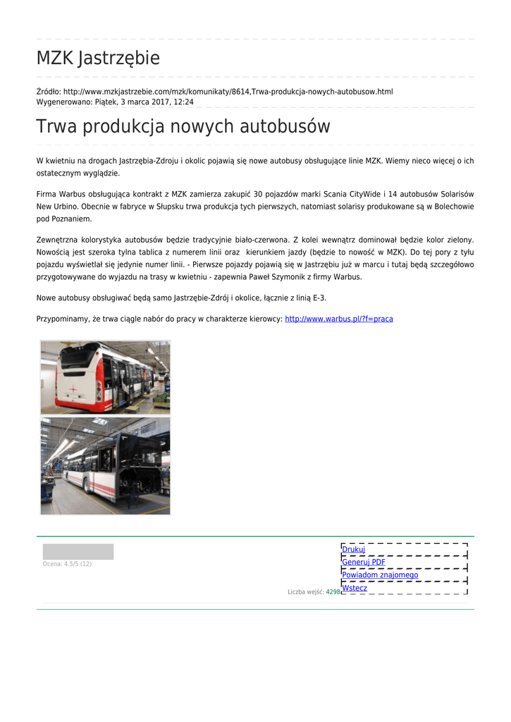MZK Jastrzębie Źródło: http://www.mzkjastrzebie.com/mzk/komunikaty/8614,Trwa-produkcja-nowych-autobusow.html Wygenerowano: Piątek, 3 marca 2017, 12:24 Trwa produkcja nowych autobusów W kwietniu na drogach Jastrzębia-Zdroju i okolic pojawią się nowe autobusy obsługujące linie MZK. Wiemy nieco więcej o ich ostatecznym wyglądzie. Firma Warbus obsługująca kontrakt z MZK zamierza zakupić 30 pojazdów marki Scania CityWide i 14 autobusów Solarisów New Urbino. Obecnie w fabryce w Słupsku trwa produkcja tych pierwszych, natomiast solarisy produkowane są w Bolechowie pod Poznaniem. Zewnętrzna kolorystyka autobusów będzie tradycyjnie biało-czerwona. Z kolei wewnątrz dominował będzie kolor zielony. Nowością jest szeroka tylna tablica z numerem linii oraz kierunkiem jazdy (będzie to nowość w MZK). Do tej pory z tyłu pojazdu wyświetlał się jedynie numer linii. - Pierwsze pojazdy pojawią się w Jastrzębiu już w marcu i tutaj będą szczegółowo przygotowywane do wyjazdu na trasy w kwietniu - zapewnia Paweł Szymonik z firmy Warbus. Nowe autobusy obsługiwać będą samo Jastrzębie-Zdrój i okolice, łącznie z linią E-3. Przypominamy, że trwa ciągle nabór do pracy w charakterze kierowcy: http://www.warbus.pl/?f=praca Drukuj Generuj PDF Ocena: 4.5/5 (12) Powiadom znajomego Liczba wejść: 4298 Wstecz