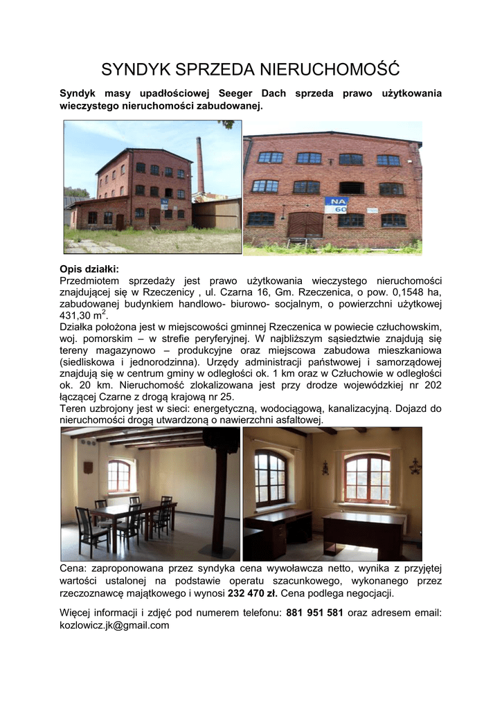 SYNDYK SPRZEDA NIERUCHOMOŚĆ Syndyk masy upadłościowej Seeger Dach sprzeda prawo użytkowania wieczystego nieruchomości zabudowanej. Opis działki: Przedmiotem sprzedaży jest prawo użytkowania wieczystego nieruchomości znajdującej się w Rzeczenicy , ul. Czarna 16, Gm. Rzeczenica, o pow. 0,1548 ha, zabudowanej budynkiem handlowo- biurowo- socjalnym, o powierzchni użytkowej 431,30 m2. Działka położona jest w miejscowości gminnej Rzeczenica w powiecie człuchowskim, woj. pomorskim – w strefie peryferyjnej. W najbliższym sąsiedztwie znajdują się tereny magazynowo – produkcyjne oraz miejscowa zabudowa mieszkaniowa (siedliskowa i jednorodzinna). Urzędy administracji państwowej i samorządowej znajdują się w centrum gminy w odległości ok. 1 km oraz w Człuchowie w odległości ok. 20 km. Nieruchomość zlokalizowana jest przy drodze wojewódzkiej nr 202 łączącej Czarne z drogą krajową nr 25. Teren uzbrojony jest w sieci: energetyczną, wodociągową, kanalizacyjną. Dojazd do nieruchomości drogą utwardzoną o nawierzchni asfaltowej. Cena: zaproponowana przez syndyka cena wywoławcza netto, wynika z przyjętej wartości ustalonej na podstawie operatu szacunkowego, wykonanego przez rzeczoznawcę majątkowego i wynosi 232 470 zł. Cena podlega negocjacji. Więcej informacji i zdjęć pod numerem telefonu: 881 951 581 oraz adresem email: [email protected]