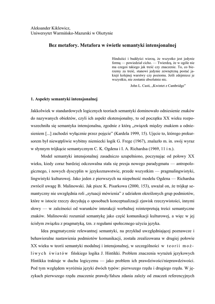 Aleksander Kiklewicz, Uniwersytet Warmińsko-Mazurski w Olsztynie Bez metafory. Metafora w świetle semantyki intensjonalnej Hinduiści i buddyści wierzą, że wszystko jest jedynie formą — powiedział cicho. — Twierdzą, że w ogóle nie ma czegoś takiego jak treść czy znaczenie. To, co bierzemy za treść, stanowi jedynie zewnętrzną postać jakiejś kolejnej warstwy czy poziomu. Jeśli zdejmiesz je wszystkie, nie zostanie absolutnie nic. John L. Casti, „Kwintet z Cambridge” 1. Aspekty semantyki intensjonalnej Jakkolwiek w standardowych logicznych teoriach semantyki dominowało odniesienie znaków do nazywanych obiektów, czyli ich aspekt ekstensjonalny, to od początku XX wieku rozpowszechniła się semantyka intensjonalna, zgodnie z którą „związek między znakiem a odniesieniem ... zachodzi wyłącznie przez pojęcie” (Kardela 1999, 15). Ujęcie to, którego prekursorem był niewątpliwie wybitny niemiecki logik G. Frege (1967), znalazło m. in. swój wyraz w słynnym trójkącie semantycznym C. K. Ogdena i I. A. Richardsa (1969, 11 i n.). Model semantyki intensjonalnej zasadniczo uzupełniono, poczynając od połowy XX wieku, kiedy coraz bardziej odczuwalna stała się presja nowego paradygmatu — antropologicznego, i nowych dyscyplin w językoznawstwie, przede wszystkim — pragmalingwistyki, lingwistyki kulturowej. Jako jeden z pierwszych na niepełność modelu Ogdena — Richardsa zwrócił uwagę B. Malinowski. Jak pisze K. Pisarkowa (2000, 153), uważał on, że trójkąt semantyczny nie uwzględnia roli „sytuacji mówienia” z udziałem określonych grup podmiotów, które w istocie rzeczy decydują o sposobach konceptualizacji zjawisk rzeczywistości, innymi słowy — w zależności od warunków interakcji werbalnej reinterpretują treści semantyczne znaków. Malinowski rozumiał semantykę jako część komunikacji kulturowej, a więc w jej ścisłym związku z pragmatyką, tzn. z regułami społecznego użycia języka. Idea pragmatycznie relewantnej semantyki, na przykład uwzględniającej poznawcze i behawioralne nastawienia podmiotów komunikacji, została zrealizowana w drugiej połowie XX wieku w teorii semantyki modalnej i intensjonalnej, w szczególności w t e o r i i m o ż l i w y c h ś w i a t ó w fińskiego logika J. Hintikki. Problem znaczenia wyrażeń językowych Hintikka traktuje w duchu logicyzmu — jako problem ich prawdziwości/nieprawdziwości. Pod tym względem wyróżnia języki dwóch typów: pierwszego rzędu i drugiego rzędu. W językach pierwszego rzędu znaczenie prawdy/fałszu zdania zależy od znaczeń referencyjnych 2 jego składników. Innymi słowy, w języku pierwszego rzędu wszystko, co jest niezbędne dla rozumienia informacji, zawarte jest w jego systemie semantycznym, tzn. w regułach nominacji przyporządkowujących określonym znakom określone grupy desygnatów. Do języków pierwszego rzędu należy język opisywany w „Traktacie” L. Wittgensteina — u jego podstaw „znajduje się dany, ustalony zbiór relacji między nazwami a przedmiotami” (Hintikka 1992, 300). Zasadnicze novum koncepcji Hintikki polega na tym, że zaproponował on traktowanie znaczenia intensjonalnego (pojęciowego) znaku (czyli „sensu” w teorii G. Fregego) jako funkcji: Sinn [...] jest funkcją. Zawiera on [...] poza odniesieniem przedmiotowym również sposób, w jaki jest ono nam dane. A mówienia o „sposobach bycia danym” nie można oczywiście w ostatecznym rozrachunku rozumieć inaczej niż funkcjonowanie. Sensy wyrażeń i sensy aktów są po prostu funkcjami wyznaczającymi, odpowiednio, ich odniesienia przedmiotowe i przedmioty (Hintikka 1992, 131 i n.). Każdej funkcji jest przyporządkowany określony zakres znaczeń. W wypadku funkcji semantycznej (czy też intensjonalnej) chodzi o zespół odniesień referencyjnych, które są zgodne z sensem znaku. Odniesienia przedmiotowe znaku są traktowane jako sytuacje jego użycia czy też jako m o ż l i w e ś w i a t y (dalej: referencyjne możliwe światy). W terminologii Hintikki „pojęcia, sensy są ... funkcjami przeprowadzającymi możliwe światy w odniesienia przedmiotowe” (ibidem, 132). Możliwe światy definiuje się jako wszelkie zrealizowane i niezrealizowane stany rzeczy i przebiegi zdarzeń. [...] Z technicznego punktu widzenia, wymienienie tego, co a wie (w świecie W) oznacza wyszczególnienie możliwych światów, alternatywnych (dokładniej, epistemicznie a-alternatywnych) względem W, to jest zgodne z tym, co a wie w W (ibidem, 158). Można, pisze Hintikka, coś powiedzieć o następnym gubernatorze Kalifornii, nie myśląc jednak o żadnej konkretnej osobie, ponieważ „zwrot następny gubernator Kalifornii oznacza różnych polityków w różnych przebiegach zdarzeń, o których sądzę, że są możliwe” (ibidem, 160). Z tego wynika, że w semantyce możliwych światów należy brać pod uwagę odniesienia przedmiotowe wyrażeń w więcej niż jednym „świecie” [...] Musimy [...] dla każdego pierwotnego wyrażenia naszego języka założyć [...] funkcję (funkcję znaczeniową) określającą jego odniesienie przedmiotowe (o ile takie posiada) w różnych możliwych scenariuszach („światach”). Co przedtem, na przykład, stanowiło nazwę o odniesieniu przedmiotowym w postaci pojedynczego indywiduum, teraz ma jako swoje znaczenie (odniesienie przedmiotowe) pewną funkcję („funkcję indywiduacyjną”), która dla każdego świata z osobna określa właściwe dla niego szczególne wcielenie wspomnianego indywiduum (ibidem, 301 i n.). 3 Istnienie możliwych światów jest uwarunkowane intensjonalnymi stanami podmiotów, tzn. ich „skierowaniem na pewien przedmiot”. Jakkolwiek sens (pojęcie) zależy od konceptualizacji, którą narzuca użytkownikom języka system semantyczny (konwencje semantyczne), to nominacja znaków językowych zależy przede wszystkim od ukierunkowania podmiotu: „Ta sama funkcja, która w naszym