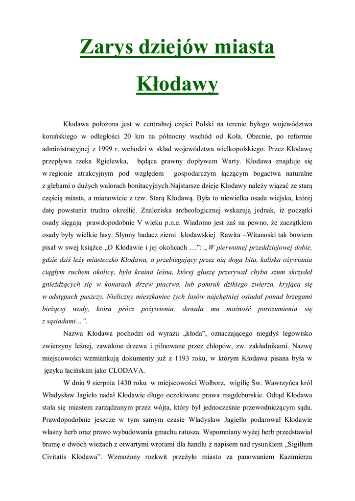 Zarys dziejów miasta Kłodawy Kłodawa położona jest w centralnej części Polski na terenie byłego województwa konińskiego w odległości 20 km na północny wschód od Koła. Obecnie, po reformie administracyjnej z 1999 r. wchodzi w skład województwa wielkopolskiego. Przez Kłodawę przepływa rzeka Rgielewka, będąca prawny dopływem Warty. Kłodawa znajduje się w regionie atrakcyjnym pod względem gospodarczym łączącym bogactwa naturalne z glebami o dużych walorach bonitacyjnych.Najstarsze dzieje Kłodawy należy wiązać ze starą częścią miasta, a mianowicie z tzw. Starą Kłodawą. Była to niewielka osada wiejska, której datę powstania trudno określić. Znaleziska archeologicznej wskazują jednak, iż początki osady sięgają prawdopodobnie V wieku p.n.e. Wiadomo jest zaś na pewno, że zaczątkiem osady były wielkie lasy. Słynny badacz ziemi kłodawskiej Rawita –Witanoski tak bowiem pisał w swej książce „O Kłodawie i jej okolicach …”: „W pierwotnej przeddziejowej dobie, gdzie dziś leży miasteczko Kłodawa, a przebiegający przez nią doga bita, kaliska ożywiania ciągłym ruchem okolicę, była kraina leśna, której głuszę przerywał chyba szum skrzydeł gnieżdżących się w konarach drzew ptactwa, lub pomruk dzikiego zwierza, kryjąca się w odstępach puszczy. Nieliczny mieszkaniec tych lasów najchętniej osiadał ponad brzegami bieżącej wody, która prócz pożywienia, dawała mu możność porozumienia się z sąsiadami…”. Nazwa Kłodawa pochodzi od wyrazu „kłoda”, oznaczającego niegdyś legowisko zwierzyny leśnej, zawalone drzewa i pilnowane przez chłopów, zw. zakładnikami. Nazwę miejscowości wzmiankują dokumenty już z 1193 roku, w którym Kłodawa pisana była w języku łacińskim jako CLODAVA. W dniu 9 sierpnia 1430 roku w miejscowości Wolborz, wigilię Św. Wawrzyńca król Władysław Jagieło nadał Kłodawie długo oczekiwane prawa magdeburskie. Odtąd Kłodawa stała się miastem zarządzanym przez wójta, który był jednocześnie przewodniczącym sądu. Prawdopodobnie jeszcze w tym samym czasie Władysław Jagiełło podarował Kłodawie własny herb oraz prawo wybudowania gmachu ratusza. Wspomniany wyżej herb przedstawiał bramę o dwóch wieżach z otwartymi wrotami dla handlu z napisem nad rysunkiem „Sigillum Civitatis Kłodawa”. Wzmożony rozkwit przeżyło miasto za panowaniem Kazimierza Jagieiellończyka, do czego walnie przyczynił się sam król. Na zjeździe w Piotrkowie w 1455 roku zwolnił on mieszkańców Kłodawy od wszelkich ceł i opłaty targowych, co przyczyniło się do wzrostu liczby mieszczan i ich zamożności. To z kolei spowodowało, że Kłodawa stała się drugim co do wielkości miastem ówczesnego województwa, ustępując jedynie jego stolicy, czyli Łęczycy. Wiek XVI charakteryzował się największym rozwojem kulturalnym i gospodarczym miasta. Główną przyczyną wzrostu gospodarczego było to, że tędy przebiegła międzynarodowa droga handlowa łącząca Niemcy z Litwą i Rusią, a także krzyżował się szlak z Łęczycy do Torunia i Gdańska. Miejscowa ludzkość obsługując przejezdnych handlarzy bogaciła się w bardzo szybkim tempie. Kłodawa liczyła wówczas 2500 mieszkańców i była jedynym z większych miast Wielkopolski. Dla porównania Poznań liczył w tym w tym samym czasie 9000 mieszkańców, Kalisz – 2700, a Koło – 1100. Rozwój kulturalny Kłodawy dokonywał się już na przestrzeni XVI wieku dzięki miejscowości szkolnictwu, a dokładniej dzięki miejscowości kolegiacie. W 1420 roku Władysław Jagiełło przekazał ją w ręce kanoników regularnych laterańskich. Ci natomiast stworzyli z niej szkołę kolegiacką, do której świetności przyczynił się głównie Sędziwój z Czechla, kanonik gnieźnieński, prof. Akademii Krakowskiej. Będąc proboszczem kolegiaty stworzył tam księgozbiór, który zaliczany był do ważniejszych zbiorów bibliotecznych średniowiecznej Wielkopolski. Księgozbiór ten posiada m.in. kopię kroniki Galla Anonima. Sędziwój z Czechla przyczynił się również do tego, że szkoła kolegiacka została uznana za filię Akademii Krakowskiej. Istniała ona do 1752 roku i zyskała ogromne znaczenie w całym kraju. Wraz w rozkwitem gospodarczym i naukowym miasta Kłodawy można też zaobserwować wysoko rozwinięty poziom kultury materialnej tego środowiska. Za panowaniem Jagiellonów na terenie miasta powstały kolejno: szpital miejski, łaźnia, studia pośrodku rynku, młyn i wiatraki zbożowe. Kłodawa w czasach najdawniejszych przeżyła zarówno dobre jak i złe chwile. Po okresie dobrego rozwoju nastąpił okres mniej pomyślny – wiek XVII. W 1650 roku na Polskę napadli Szwedzi, którzy pod wodzą Karola Gustawa wkroczyli również na teren Kłodawy. Pomimo zaciętej obrony mieszczan miasto zostało zdobyte. Najeźdźcy wymordowali wówczas część ludności i spalili większość stojących tam domów, łącznie z kolegiatą i klasztorem kanoników regularnych. Do tego miasto zostało obciążone wyjątkowo uciążliwą kontrybucją wojenną. O rozmiarach zniszczeń świadczy fakt, że na 700 domów w mieście ocalało zaledwie 100. W latach 1657-1658 miasto nawiedziła zaraza, a w 1659 roku Kłodawę zniszczył uciążliwy pobyt wojsk niemieckich cesarzy Ferdynanda . Do dalszego upadku miasta przyczyniły się rozbiory, które nawiedziły nasz kraj pod koniec XVIII wieku. 11 IV 1793 roku na mocy manifestu króla pruskiego Fryderyka Wilhelma część Wielkopolski Wschodniej wraz z Kłodawą została przyłączona do państwa pruskiego . Ten drugi rozbiór Polski zapoczątkował okres niewoli narodowej dla miast, który trwał 125 lat. Wraz z początkiem okupacji pruskiej do Kłodawy zaczęła napływać dużo liczba urzędników i rzemieślników niemieckich oraz znaczna rzesza kupców pochodzenia żydowskiego. Władze pruskie wydały wiele uwłaczających ludzkiej godności rozporządzeń