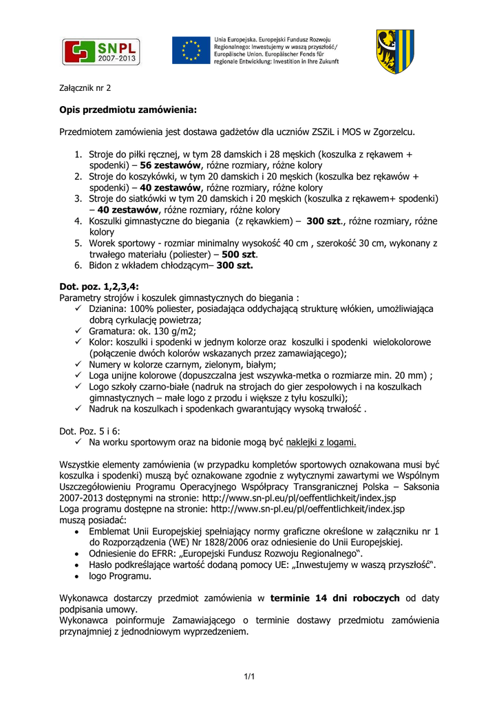 Załącznik nr 2 Opis przedmiotu zamówienia: Przedmiotem zamówienia jest dostawa gadżetów dla uczniów ZSZiL i MOS w Zgorzelcu. 1. Stroje do piłki ręcznej, w tym 28 damskich i 28 męskich (koszulka z rękawem + spodenki) – 56 zestawów, różne rozmiary, różne kolory 2. Stroje do koszykówki, w tym 20 damskich i 20 męskich (koszulka bez rękawów + spodenki) – 40 zestawów, różne rozmiary, różne kolory 3. Stroje do siatkówki w tym 20 damskich i 20 męskich (koszulka z rękawem+ spodenki) – 40 zestawów, różne rozmiary, różne kolory 4. Koszulki gimnastyczne do biegania (z rękawkiem) – 300 szt., różne rozmiary, różne kolory 5. Worek sportowy - rozmiar minimalny wysokość 40 cm , szerokość 30 cm, wykonany z trwałego materiału (poliester) – 500 szt. 6. Bidon z wkładem chłodzącym– 300 szt. Dot. poz. 1,2,3,4: Parametry strojów i koszulek gimnastycznych do biegania : Dzianina: 100% poliester, posiadająca oddychającą strukturę włókien, umożliwiająca dobrą cyrkulację powietrza; Gramatura: ok. 130 g/m2; Kolor: koszulki i spodenki w jednym kolorze oraz koszulki i spodenki wielokolorowe (połączenie dwóch kolorów wskazanych przez zamawiającego); Numery w kolorze czarnym, zielonym, białym; Loga unijne kolorowe (dopuszczalna jest wszywka-metka o rozmiarze min. 20 mm) ; Logo szkoły czarno-białe (nadruk na strojach do gier zespołowych i na koszulkach gimnastycznych – małe logo z przodu i większe z tyłu koszulki); Nadruk na koszulkach i spodenkach gwarantujący wysoką trwałość . Dot. Poz. 5 i 6: Na worku sportowym oraz na bidonie mogą być naklejki z logami. Wszystkie elementy zamówienia (w przypadku kompletów sportowych oznakowana musi być koszulka i spodenki) muszą być oznakowane zgodnie z wytycznymi zawartymi we Wspólnym Uszczegółowieniu Programu Operacyjnego Współpracy Transgranicznej Polska – Saksonia 2007-2013 dostępnymi na stronie: http://www.sn-pl.eu/pl/oeffentlichkeit/index.jsp Loga programu dostępne na stronie: http://www.sn-pl.eu/pl/oeffentlichkeit/index.jsp muszą posiadać: Emblemat Unii Europejskiej spełniający normy graficzne określone w załączniku nr 1 do Rozporządzenia (WE) Nr 1828/2006 oraz odniesienie do Unii Europejskiej. Odniesienie do EFRR: „Europejski Fundusz Rozwoju Regionalnego“. Hasło podkreślające wartość dodaną pomocy UE: „Inwestujemy w waszą przyszłość“. logo Programu. Wykonawca dostarczy przedmiot zamówienia w terminie 14 dni roboczych od daty podpisania umowy. Wykonawca poinformuje Zamawiającego o terminie dostawy przedmiotu zamówienia przynajmniej z jednodniowym wyprzedzeniem. 1/1