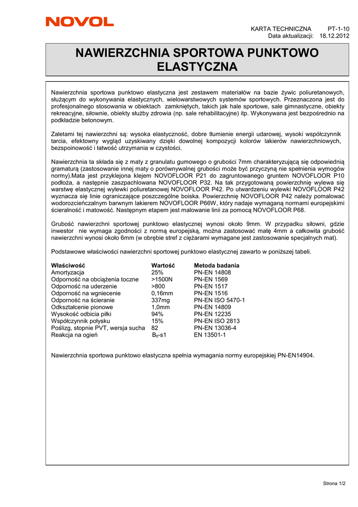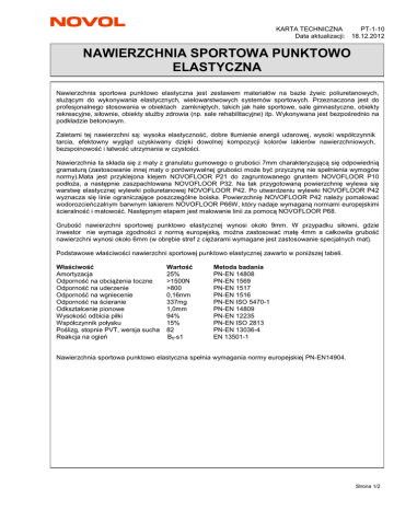 KARTA TECHNICZNA PT-1-10 Data aktualizacji: 18.12.2012 NAWIERZCHNIA SPORTOWA PUNKTOWO ELASTYCZNA Nawierzchnia sportowa punktowo elastyczna jest zestawem materiałów na bazie żywic poliuretanowych, służącym do wykonywania elastycznych, wielowarstwowych systemów sportowych. Przeznaczona jest do profesjonalnego stosowania w obiektach zamkniętych, takich jak hale sportowe, sale gimnastyczne, obiekty rekreacyjne, siłownie, obiekty służby zdrowia (np. sale rehabilitacyjne) itp. Wykonywana jest bezpośrednio na podkładzie betonowym. Zaletami tej nawierzchni są: wysoka elastyczność, dobre tłumienie energii udarowej, wysoki współczynnik tarcia, efektowny wygląd uzyskiwany dzięki dowolnej kompozycji kolorów lakierów nawierzchniowych, bezspoinowość i łatwość utrzymania w czystości. Nawierzchnia ta składa się z maty z granulatu gumowego o grubości 7mm charakteryzującą się odpowiednią gramaturą (zastosowanie innej maty o porównywalnej grubości może być przyczyną nie spełnienia wymogów normy).Mata jest przyklejona klejem NOVOFLOOR P21 do zagruntowanego gruntem NOVOFLOOR P10 podłoża, a następnie zaszpachlowana NOVOFLOOR P32. Na tak przygotowaną powierzchnię wylewa się warstwę elastycznej wylewki poliuretanowej NOVOFLOOR P42. Po utwardzeniu wylewki NOVOFLOOR P42 wyznacza się linie ograniczające poszczególne boiska. Powierzchnię NOVOFLOOR P42 należy pomalować wodorozcieńczalnym barwnym lakierem NOVOFLOOR P66W, który nadaje wymaganą normami europejskimi ścieralność i matowość. Następnym etapem jest malowanie linii za pomocą NOVOFLOOR P68. Grubość nawierzchni sportowej punktowo elastycznej wynosi około 9mm. W przypadku siłowni, gdzie inwestor nie wymaga zgodności z normą europejską, można zastosować matę 4mm a całkowita grubość nawierzchni wynosi około 6mm (w obrębie stref z ciężarami wymagane jest zastosowanie specjalnych mat). Podstawowe właściwości nawierzchni sportowej punktowo elastycznej zawarto w poniższej tabeli. Właściwość Amortyzacja Odporność na obciążenia toczne Odporność na uderzenie Odporność na wgniecenie Odporność na ścieranie Odkształcenie pionowe Wysokość odbicia piłki Współczynnik połysku Poślizg, stopnie PVT, wersja sucha Reakcja na ogień Wartość 25% >1500N >800 0,16mm 337mg 1,0mm 94% 15% 82 Bfl-s1 Metoda badania PN-EN 14808 PN-EN 1569 PN-EN 1517 PN-EN 1516 PN-EN ISO 5470-1 PN-EN 14809 PN-EN 12235 PN-EN ISO 2813 PN-EN 13036-4 EN 13501-1 Nawierzchnia sportowa punktowo elastyczna spełnia wymagania normy europejskiej PN-EN14904. Strona 1/2 KARTA TECHNICZNA PT-1-10 Data aktualizacji: 18.12.2012 Typowy układ warstw nawierzchni sportowej punktowo elastycznej przedstawia poniższy rysunek. 1 - Podłoże betonowe 2 - Grunt NOVOFLOOR P10 3 - Klej NOVOFLOOR P21 4 - Mata z granulatu gumowego 5 - Szpachlówka NOVOFLOOR P32 6 - Wylewka NOVOFLOOR P42 7 - Lakier NOVOFLOOR P66W oraz Lakier NOVOFLOOR P68 (linie) Zalecenia dotyczące mycia i konserwacji nawierzchni można znaleźć w karcie technicznej PT-4-02. Inne informacje: Efektywność naszych systemów jest wynikiem badań laboratoryjnych oraz wieloletniego doświadczenia. Dane zawarte w niniejszym materiale są zgodne z aktualnym stanem wiedzy o naszych produktach i możliwościach ich stosowania. Gwarantujemy wysoką jakość pod warunkiem, że są spełnione nasze instrukcje i że praca jest wykonana zgodnie z zasadami dobrego rzemiosła. Konieczne jest wykonanie próbnego zastosowania produktu ze względu na potencjalnie różne zachowanie się wyrobu z różnymi materiałami. Nie ponosimy odpowiedzialności jeżeli na końcowy rezultat pracy miały wpływ czynniki znajdujące się poza naszą kontrolą. Strona 2/2