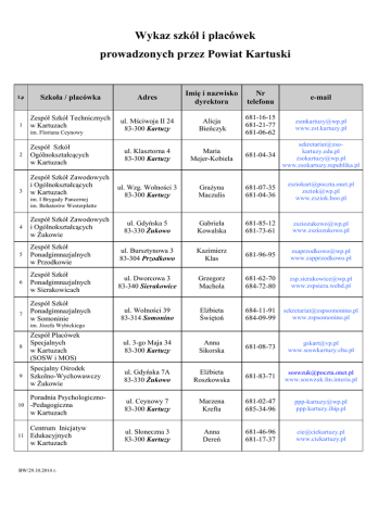 Wykaz szkół i placówek prowadzonych przez Powiat Kartuski Lp Szkoła / placówka Adres Imię i nazwisko dyrektora Nr telefonu e-mail 1 Zespół Szkół Technicznych w Kartuzach ul. Mściwoja II 24 83-300 Kartuzy Alicja Bieńczyk 681-16-15 681-21-77 681-06-62 [email protected] www.zst.kartuzy.pl ul. Klasztorna 4 83-300 Kartuzy Maria Mejer-Kobiela 681-04-34 [email protected] [email protected] www.zsokartuzy.republika.pl ul. Wzg. Wolności 3 83-300 Kartuzy Grażyna Maczulis 681-07-35 681-04-36 [email protected] [email protected] www.zsziok.boo.pl ul. Gdyńska 5 83-330 Żukowo Gabriela Kowalska 681-85-12 681-73-61 [email protected] www.zsziozukowo.pl im. Floriana Ceynowy 2 3 Zespół Szkół Ogólnokształcących w Kartuzach Zespół Szkół Zawodowych i Ogólnokształcących w Kartuzach im. I Brygady Pancernej im. Bohaterów Westerplatte 4 Zespół Szkół Zawodowych i Ogólnokształcących w Żukowie 5 Zespół Szkół Ponadgimnazjalnych w Przodkowie ul. Bursztynowa 3 83-304 Przodkowo Kazimierz Klas 681-96-95 [email protected] www.zspprzodkowo.pl 6 Zespół Szkół Ponadgimnazjalnych w Sierakowicach ul. Dworcowa 3 83-340 Sierakowice Grzegorz Machola 681-62-70 684-72-80 [email protected] www.zspsiera.webd.pl Zespół Szkół Ponadgimnazjalnych w Somoninie ul. Wolności 39 83-314 Somonino Elżbieta Świętoń 684-11-91 684-09-99 [email protected] www.zspsomonino.pl 8 Zespół Placówek Specjalnych w Kartuzach (SOSW i MOS) ul. 3-go Maja 34 83-300 Kartuzy Anna Sikorska 681-08-73 [email protected] www.soswkartuzy.cba.pl 9 Specjalny Ośrodek Szkolno-Wychowawczy w Żukowie ul. Gdyńska 7A 83-330 Żukowo Elżbieta Roszkowska 681-83-71 [email protected] www.soswzuk.fm.interia.pl 10 Poradnia Psychologiczno-Pedagogiczna w Kartuzach ul. Ceynowy 7 83-300 Kartuzy Marzena Krefta 681-02-47 685-34-96 [email protected] ppp.kartuzy.ibip.pl 11 Centrum Inicjatyw Edukacyjnych w Kartuzach ul. Słoneczna 3 83-300 Kartuzy Anna Dereń 681-46-96 681-17-37 [email protected] www.ciekartuzy.pl 7 im. Józefa Wybickiego BW/29.10.2014 r.