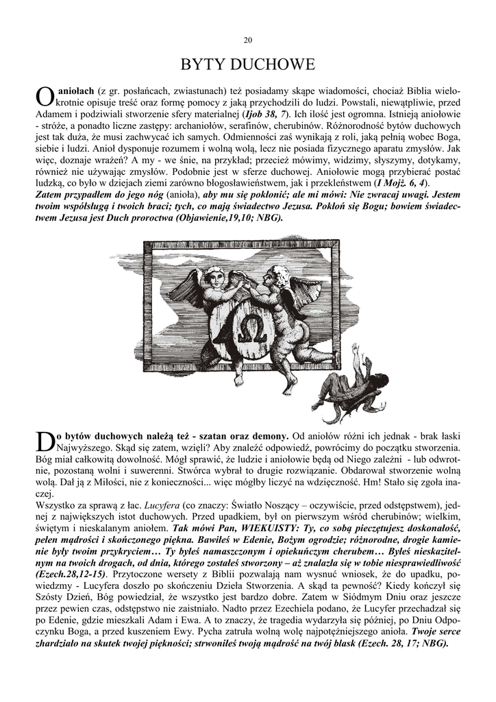 20 BYTY DUCHOWE O aniołach (z gr. posłańcach, zwiastunach) też posiadamy skąpe wiadomości, chociaż Biblia wielokrotnie opisuje treść oraz formę pomocy z jaką przychodzili do ludzi. Powstali, niewątpliwie, przed Adamem i podziwiali stworzenie sfery materialnej (Ijob 38, 7). Ich ilość jest ogromna. Istnieją aniołowie - stróże, a ponadto liczne zastępy: archaniołów, serafinów, cherubinów. Różnorodność bytów duchowych jest tak duża, że musi zachwycać ich samych. Odmienności zaś wynikają z roli, jaką pełnią wobec Boga, siebie i ludzi. Anioł dysponuje rozumem i wolną wolą, lecz nie posiada fizycznego aparatu zmysłów. Jak więc, doznaje wrażeń? A my - we śnie, na przykład; przecież mówimy, widzimy, słyszymy, dotykamy, również nie używając zmysłów. Podobnie jest w sferze duchowej. Aniołowie mogą przybierać postać ludzką, co było w dziejach ziemi zarówno błogosławieństwem, jak i przekleństwem (I Mojż. 6, 4). Zatem przypadłem do jego nóg (anioła), aby mu się pokłonić; ale mi mówi: Nie zwracaj uwagi. Jestem twoim współsługą i twoich braci; tych, co mają świadectwo Jezusa. Pokłoń się Bogu; bowiem świadectwem Jezusa jest Duch proroctwa (Objawienie,19,10; NBG). D o bytów duchowych należą też - szatan oraz demony. Od aniołów różni ich jednak - brak łaski Najwyższego. Skąd się zatem, wzięli? Aby znaleźć odpowiedź, powrócimy do początku stworzenia. Bóg miał całkowitą dowolność. Mógł sprawić, że ludzie i aniołowie będą od Niego zależni - lub odwrotnie, pozostaną wolni i suwerenni. Stwórca wybrał to drugie rozwiązanie. Obdarował stworzenie wolną wolą. Dał ją z Miłości, nie z konieczności... więc mógłby liczyć na wdzięczność. Hm! Stało się zgoła inaczej. Wszystko za sprawą z łac. Lucyfera (co znaczy: Światło Noszący – oczywiście, przed odstępstwem), jednej z największych istot duchowych. Przed upadkiem, był on pierwszym wśród cherubinów; wielkim, świętym i nieskalanym aniołem. Tak mówi Pan, WIEKUISTY: Ty, co sobą pieczętujesz doskonałość, pełen mądrości i skończonego piękna. Bawiłeś w Edenie, Bożym ogrodzie; różnorodne, drogie kamienie były twoim przykryciem… Ty byłeś namaszczonym i opiekuńczym cherubem… Byłeś nieskazitelnym na twoich drogach, od dnia, którego zostałeś stworzony – aż znalazła się w tobie niesprawiedliwość (Ezech.28,12-15). Przytoczone wersety z Biblii pozwalają nam wysnuć wniosek, że do upadku, powiedzmy - Lucyfera doszło po skończeniu Dzieła Stworzenia. A skąd ta pewność? Kiedy kończył się Szósty Dzień, Bóg powiedział, że wszystko jest bardzo dobre. Zatem w Siódmym Dniu oraz jeszcze przez pewien czas, odstępstwo nie zaistniało. Nadto przez Ezechiela podano, że Lucyfer przechadzał się po Edenie, gdzie mieszkali Adam i Ewa. A to znaczy, że tragedia wydarzyła się później, po Dniu Odpoczynku Boga, a przed kuszeniem Ewy. Pycha zatruła wolną wolę najpotężniejszego anioła. Twoje serce zhardziało na skutek twojej piękności; strwoniłeś twoją mądrość na twój blask (Ezech. 28, 17; NBG).