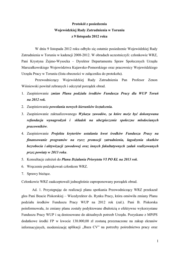Protokół z posiedzenia Wojewódzkiej Rady Zatrudnienia w Toruniu z 9 listopada 2012 roku W dniu 9 listopada 2012 roku odbyło się ostatnie posiedzenie Wojewódzkiej Rady Zatrudnienia w Toruniu w kadencji 2008-2012. W obradach uczestniczyli: członkowie WRZ, Pani Krystyna Żejmo-Wysocka – Dyrektor Departamentu Spraw Społecznych Urzędu Marszałkowskiego Województwa Kujawsko-Pomorskiego oraz pracownicy Wojewódzkiego Urzędu Pracy w Toruniu (lista obecności w załączniku do protokołu). Przewodniczący Wojewódzkiej Rady Zatrudnienia Pan Profesor Zenon Wiśniewski powitał zebranych i odczytał porządek obrad. 1. Zaopiniowanie zmian Planu podziału środków Funduszu Pracy dla WUP Toruń na 2012 rok. 2. Zaopiniowanie powołania nowych kierunków kształcenia. 3. Zaopiniowanie zaktualizowanego Wykazu zawodów, za które może być dokonywana refundacja wynagrodzeń i składek na ubezpieczenie społeczne młodocianych pracowników. 4. Zaopiniowanie Projektu kryteriów ustalania kwot środków Funduszu Pracy na finansowanie programów na rzecz promocji zatrudnienia, łagodzenia skutków bezrobocia i aktywizacji zawodowej oraz innych fakultatywnych zadań realizowanych przez powiaty w 2013 roku. 5. Konsultacje założeń do Planu Działania Priorytetu VI PO KL na 2013 rok. 6. Wręczenie podziękowań członkom WRZ. 7. Sprawy bieżące. Członkowie WRZ zaakceptowali jednogłośnie zaproponowany porządek obrad. Ad. 1. Przystępując do realizacji planu spotkania Przewodniczący WRZ przekazał głos Pani Beacie Piskorskiej – Wicedyrektor ds. Rynku Pracy, która omówiła zmiany Planu podziału środków Funduszu Pracy WUP na 2012 rok (zał.). Pani B. Piskorska poinformowała, że zmiany planu zostały podyktowane dbałością o efektywne wykorzystane Funduszu Pracy WUP i są dostosowane do aktualnych potrzeb Urzędu. Pozyskane z MPiPS dodatkowe środki FP w kwocie 138.000,00 zł zostaną przeznaczone na zakup ekranów informacyjnych, modernizację aplikacji „Baza CV” na potrzeby pośrednictwa pracy oraz 1 modernizację strony internetowej Urzędu. Pani Beata Piskorska zaproponowała także, aby dokonać przesunięcia 4.000,00 zł na zakup i wdrożenie oprogramowania do inwentaryzacji środków trwałych – STOCK z oszczędności, jakie powstały w ramach: drukowania ulotek opracowanych przez pracowników Wydziału Pośrednictwa Pracy, zawierających informacje z zakresu zatrudnienia za granicą oraz paragrafu wydatkowego dot. kosztów pomocy prawnej zatrudnionym za granicą w ramach umów międzynarodowych. Po wysłuchaniu wypowiedzi Przewodniczący WRZ poddał pod głosowanie Uchwałę nr 36/2012 w sprawie zaopiniowania planu podziału środków Funduszu Pracy dla WUP Toruń na 2012 rok. Uchwała została jednomyślnie pozytywnie przyjęta przez członków WRZ. Ad. 2. Następny punkt obrad dotyczył powołania nowych kierunków kształcenia w szkołach ponadgimnazjalnych. Pierwszy został omówiony wniosek Towarzystwa Kultury, Edukacji i Promocji Gminy Choceń o powołanie 9 nowych kierunków kształcenia, w nowotworzonej od 2012 roku szkole policealnej, w zawodach: technik administracji, technik bezpieczeństwa i higieny pracy, opiekun w domu pomocy społecznej, technik rachunkowości, technik ochrony fizycznej osób i mienia, technik turystyki wiejskiej, technik weterynarii, technik hotelarstwa oraz florysta. Omówienia tego wniosku dokonały Pani Joanna Hołod oraz Pani Lilla Załęska – Doradcy Zawodowi w Centrum Informacji i Planowania Kariery Zawodowej w Toruniu, przedstawiając szczegółową analizę ww. zawodów na regionalnym rynku pracy (zał.). Z analizy możliwości zatrudnienia wynikało, że w skali województwa w 2011 r. zawód technik administracji był zaliczany do zawodu zrównoważonego, zawód florysta do zawodu deficytowego, natomiast pozostałe zawody były zaliczane do zawodów nadwyżkowych. Pozytywnymi przesłankami za uruchomieniem kierunków kształcenia w zawodach nadwyżkowych (opiekun w domu pomocy społecznej, technik rachunkowości, technik turystyki wiejskiej, technik weterynarii) jest m.in. mała liczba lub brak szkół na terenie powiatu włocławskiego kształcących w tych zawodach. Po wysłuchaniu analizy poddano pod głosowanie Uchwałę nr 37/2012 w sprawie opinii w zakresie powołania nowych kierunków kształcenia w Towarzystwie Kultury, Edukacji i Promocji Gminy Choceń. Członkowie WRZ, przy dwóch głosach wstrzymujących i czterech przeciw, przyjęli ww. uchwałę w brzmieniu: „Wojewódzka Rada Zatrudnienia w Toruniu, po analizie sytuacji rynku pracy, pozytywnie opiniuje, zgłoszoną przez Towarzystwo Kultury, Edukacji i Promocji Gminy Choceń, potrzebę kształcenia w nowych kierunkach: opiekun w domu 2 pomocy społecznej, technik rachunkowości, technik turystyki wiejskiej, technik weterynarii oraz florysta, natomiast negatywnie opiniuje potrzebę kształcenia w nowych kierunkach: technik administracji, technik bezpieczeństwa i higieny pracy, technik ochrony fizycznej osób i mienia oraz technik hotelarstwa”. Następnie został omówiony drugi wniosek Zespołu Szkół Handlowych im. Marii Dąbrowskiej w Bydgoszczy w sprawie powołania nowego kierunku kształcenia w zawodzie technik eksploatacji portów i terminali (zał.). Pani Joanna Hołod poinformowała, że w województwie kujawsko-pomorskim nie istnieje szkoła kształcąca w zawodzie technik eksploatacji portów i terminali. Wniosek jest szczegółowo uzasadniony. Ponadto Wnioskodawca wskazał pracodawców, którzy wyrażali chęć przyjęcia uczniów na praktyki. Po wysłuchaniu informacji Pan Prof. Zenon Wiśniewski poddał pod głosowanie Uchwałę nr 38/2012 w sprawie opinii w zakresie powołania nowego kierunku kształcenia w Zespole Szkół Handlowych im. Marii Dąbrowskiej w Bydgoszczy. Członkowie WRZ jednogłośnie przyjęli ww. uchwałę w brzmieniu: „Wojewódzka Rada Zatrudnienia w Toruniu, po analizie sytuacji na rynku pracy, pozytywnie opiniuje, zgłos