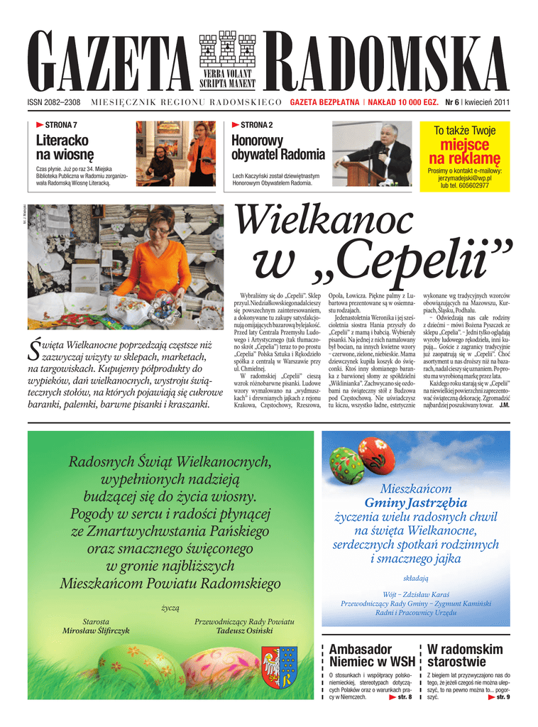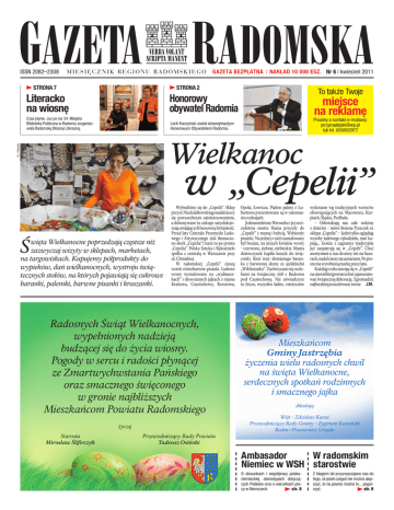 ISSN 2082–2308 MIESIĘCZNIK REGIONU RADOMSKIEGO STRONA 7 GAZETA BEZPŁATNA | NAKŁAD 10 000 EGZ. Nr 6 | kwiecień 2011 STRONA 2 Literacko na wiosnę Honorowy obywatel Radomia Czas płynie. Już po raz 34. Miejska Biblioteka Publiczna w Radomiu zorganizowała Radomską Wiosnę Literacką. Lech Kaczyński został dziewiętnastym Honorowym Obywatelem Radomia. To także Twoje miejsce na reklamę Prosimy o kontakt e-mailowy: [email protected] lub tel. 605602977 fot. J. Madejski Wielkanoc w „Cepelii” Ś więta Wielkanocne poprzedzają częstsze niż zazwyczaj wizyty w sklepach, marketach, na targowiskach. Kupujemy półprodukty do wypieków, dań wielkanocnych, wystroju świątecznych stołów, na których pojawiają się cukrowe baranki, palemki, barwne pisanki i kraszanki. Wybraliśmy się do „Cepelii”. Sklep przyul.Niedziałkowskiegonadalcieszy się powszechnym zainteresowaniem, a dokonywane tu zakupy satysfakcjonują omijających bazarową bylejakość. Przed laty Centrala Przemysłu Ludowego i Artystycznego (tak tłumaczono skrót „Cepelia”) teraz to po prostu „Cepelia” Polska Sztuka i Rękodzieło spółka z centralą w Warszawie przy ul. Chmielnej. W radomskiej „Cepelii” cieszą wzrok różnobarwne pisanki. Ludowe wzory wymalowano na „wydmuszkach” i drewnianych jajkach z rejonu Krakowa, Częstochowy, Rzeszowa, Radosnych Świąt Wielkanocnych, wypełnionych nadzieją budzącej się do życia wiosny. Pogody w sercu i radości płynącej ze Zmartwychwstania Pańskiego oraz smacznego święconego w gronie najbliższych Mieszkańcom Powiatu Radomskiego wykonane wg tradycyjnych wzorców obowiązujących na Mazowszu, Kurpiach, Śląsku, Podhalu. – Odwiedzają nas całe rodziny z dziećmi – mówi Bożena Pyszczek ze sklepu „Cepelia”. – Jedni tylko oglądają wyroby ludowego rękodzieła, inni kupują... Goście z zagranicy tradycyjnie już zaopatrują się w „Cepelii”. Choć asortyment u nas droższy niż na bazarach, nadal cieszy się uznaniem. Po prostu ma wyrobioną markę przez lata. Każdego roku starają się w „Cepelii” na niewielkiej powierzchni zaprezentować świąteczną dekorację. Zgromadzić najbardziej poszukiwany towar. J.M. Mieszkańcom Gminy Jastrzębia życzenia wielu radosnych chwil na święta Wielkanocne, serdecznych spotkań rodzinnych i smacznego jajka składają Wójt – Zdzisław Karaś Przewodniczący Rady Gminy – Zygmunt Kamiński Radni i Pracownicy Urzędu życzą Starosta Mirosław Ślifirczyk Opola, Łowicza. Piękne palmy z Lubartowa prezentowane są w osiemnastu rodzajach. Jedenastoletnia Weronika i jej sześcioletnia siostra Hania przyszły do „Cepelii” z mamą i babcią. Wybierały pisanki. Na jednej z nich namalowany był bocian, na innych kwietne wzory – czerwone, zielone, niebieskie. Mama dziewczynek kupiła koszyk do święconki. Ktoś inny słomianego baranka z barwionej słomy ze spółdzielni „Wiklinianka”. Zachwycano się ozdobami na świąteczny stół z Budzowa pod Częstochową. Nie uświadczysz tu kiczu, wszystko ładne, estetycznie Przewodniczący Rady Powiatu Tadeusz Osiński Ambasador W radomskim Niemiec w WSH starostwie O stosunkach i współpracy polskoniemieckiej, stereotypach dotyczących Polaków oraz o warunkach prastr. 8 cy w Niemczech. Z biegiem lat przyzwyczajono nas do tego, że jeżeli czegoś nie można ulepszyć, to na pewno można to... pogorstr. 9 szyć. 2 AKTUALNOŚCI Nr 6 • kwiecień 2011 OD REDAKCJI Drodzy Czytelnicy Oddajemy ten numer gazety wiosną. Święta za pasem, a wraz z nimi zwyczaje wielkanocne, o których nie mogliśmy nie wspomnieć. Radom nam pięknieje. Teraz, gdy pora kwitnienia czyni wszystko wkoło barwne i radosne, tym bardziej dostrzegamy uroki miasta. Przekażmy tę radość odradzającego się życia w przyrodzie bliskim. Dajmy odpór ponurakom. Uśmiechajmy się do siebie. Naszym Czytelnikom życzymy pogody ducha, wielu satysfakcji, rodzinnego ciepła przy świątecznym stole. Jerzy Madejski redaktor naczelny Z RÓŻNYCH STRON MIASTA kal przeszedł niebywałą metamorfozę – jego wystrój to skok w XXI wiek. Kolorystyka w brązach, beżach i pomarańczy, ekrany na menu, nowoczesne meble i oświetlenie sprawiły, że bar jest nie do poznania. Za to dania jak dawniej – smaczne i tanie. Tunelem na własne ryzyko Przejście przez tory na ul. Słowackiego jest wyjątkowo niebezpieczne. Można przejść nad torami wiaduktem, ale droga jest znacznie dłuższa. Nieco krócej tunelem pod torami. Tylko że to przejście, wydawać by się mogło najwłaściwsze, wiąże się z dużym ryzykiem, także za dnia. Niejeden stracił tu portfel, komórkę, zdarzały się pobicia. Przejście nie tylko jest niebezpieczne. Brudno tu i ponuro... Dla archeologów Konkurs – pod patronatem Kolegium Licencjackiego UMCS w Radomiu – organizują: SCM „Arka”, ZSP im. Józefa Brandta, ZSO nr 4 im. Polskich Olimpijczyków i ZSO nr 6 im. Jana Kochanowskiego. Młodzieży, do piór! Bar jak nowy Ruszył VI Regionalny Konkurs Literacki – w tym roku poświęcony Marii Curie– Skłodowskiej. Do 13 maja uczniowie szkół gimnazjalnych, ponadgimnazjalnych oraz studenci z terenu Radomia mogą nadsyłać prace w następujących kategoriach: pojedynczy utwór prozatorski lub dramatyczny inspirowany życiem i działalnością noblistki, pojedynczy utwór prozatorski lub dramatyczny o tematyce dowolnej (do 5 stron formatu A4). Prace można nadsyłać pod adresem e-mail: [email protected] wraz z krótką informacją na temat autora (imię, nazwisko, wiek, adres, telefon, nazwa i adres szkoły, nazwisko opiekuna) oraz dopisek „VI Regionalny Konkurs Literacki”. Rozstrzygnięcie 23 maja o godz. 17 w SCM „Arka”, przy ul. Chrobrego 7/9. Trwający przez dziesięciolecia i znany chyba wszystkim radomianom bar przy ul. Moniuszki w budynku „Sezamu” znów otwarty. W trakcie remontu lo- Bar „Sezam” w nowej krasie Kamienica Starościńska przy ul. Grodzkiej 8 ożyje. Spółk