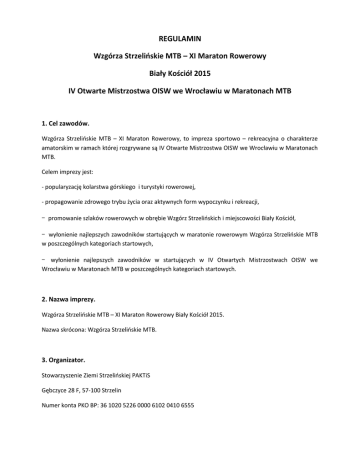 REGULAMIN Wzgórza Strzelińskie MTB – XI Maraton Rowerowy Biały Kościół 2015 IV Otwarte Mistrzostwa OISW we Wrocławiu w Maratonach MTB 1. Cel zawodów. Wzgórza Strzelińskie MTB – XI Maraton Rowerowy, to impreza sportowo – rekreacyjna o charakterze amatorskim w ramach której rozgrywane są IV Otwarte Mistrzostwa OISW we Wrocławiu w Maratonach MTB. Celem imprezy jest: - popularyzację kolarstwa górskiego i turystyki rowerowej, - propagowanie zdrowego trybu życia oraz aktywnych form wypoczynku i rekreacji, - promowanie szlaków rowerowych w obrębie Wzgórz Strzelińskich i miejscowości Biały Kościół, - wyłonienie najlepszych zawodników startujących w maratonie rowerowym Wzgórza Strzelińskie MTB w poszczególnych kategoriach startowych, - wyłonienie najlepszych zawodników w startujących w IV Otwartych Mistrzostwach OISW we Wrocławiu w Maratonach MTB w poszczególnych kategoriach startowych. 2. Nazwa imprezy. Wzgórza Strzelińskie MTB – XI Maraton Rowerowy Biały Kościół 2015. Nazwa skrócona: Wzgórza Strzelińskie MTB. 3. Organizator. Stowarzyszenie Ziemi Strzelińskiej PAKTiS Gębczyce 28 F, 57-100 Strzelin Numer konta PKO BP: 36 1020 5226 0000 6102 0410 6555 4. Współorganizator. Strzelińskie Towarzystwo Sportowe EXTREME ul Władysława Łokietka 2/2 57-100 Strzelin Zakład Karny w Strzelinie ul. Ząbkowicka 68 57-100 Strzelin 5. Miejsce i termin imprezy. Termin zawodów –30.08.2015 r. (niedziela) Biuro zawodów –Ośrodek Wypoczynku Świątecznego w Białym Kościele. Miejsce startu i mety – Ośrodek Wypoczynku Świątecznego w Białym Kościele. 6. Impreza towarzysząca Wyścig Dziecięcy. W ramach Wzgórz Strzelińskich MTB przeprowadzony będzie wyścig dla najmłodszych, Będzie on rozgrywany w formie zabawy w wyścig rowerowy, promującej aktywne formy wypoczynku. Do startu w tej imprezie dopuszczane będą dzieci pod stałą opieką rodziców lub opiekunów prawnych. Osoby biorące udział w Dziecięcym Wyścigu winny posiadać kask rowerowy oraz sprawny technicznie rower napędzany wyłącznie siłą mięśni. Trasa Dziecięcego Wyścigu poprowadzona będzie w obrębie OWŚ ‘’Biały Kościół ‘’ w obszarze oznaczonym taśmami. Podczas wyścigu obowiązują zasady fair play, wykluczające wspomaganie startującego dziecka w sposób wpływający na uzyskany rezultat (np. popychanie). W przypadku najmłodszych uczestników wyjątkowo dopuszcza się bierny udział rodzica, mający na celu podniesienie poczucia bezpieczeństwa u uczestnika. Organizator zastrzega sobie możliwość odwołania startu w wyniku warunków atmosferycznych panujących w dniu wyścigu ( obfite opady deszczu, uciążliwy upał itp.). 7. Pomiar czasu. Podczas Wzgórz Strzelińskich MTB będzie funkcjonował elektroniczny system identyfikacji i pomiaru czasu. Każdy z uczestników startujący w imprezie zobowiązany jest do posiadania numeru startowego wraz z chipem, który udostępniany będzie przez Organizatora. Na trasie będą zlokalizowane elektroniczne punkty kontrolne. Ominięcie punktu kontrolnego będzie skutkowało dyskwalifikacją. 8. Sposób przeprowadzenia imprezy. Start Wzgórz Strzelińskich MTB odbędzie się ze startu wspólnego na trasach okrężnych wokół miejscowości Biały Kościół. Trasa będzie oznakowana oraz na stałe zabezpieczona przez odpowiednie służby organizatora i służby ratownicze. Organizator zastrzega sobie prawo do innego sposobu przeprowadzenia startu oraz zmian w poprowadzeniu trasy o czym poinformuje uczestników na odprawie technicznej w dniu rozgrywania maratonu. Start Wyścigu Dziecięcego odbędzie się bez pomiaru czasu .Organizator zastrzega sobie w zależności od ilości zgłoszonych uczestników i podziału na kategorie, wystartować uczestników razem lub oddzielnie każdą z kategorii. O dokładnej godzinie i sposobie startu uczestnicy dowiedzą się z komunikatu spikera. 9. Dystanse. Wzgórza Strzelińskie MTB rozegrane zostaną na dystansach: – Giga - 65 - 70 km (2 pętle), – Mega – 40 - 45 km (1 pętla), – Mini – 15 - 20 km (1/2 pętli), – Family – 5 - 7 km - Impreza towarzysząca Wyścig dla dzieci Osesek – 500 m Mistrzostwa OISW we Wrocławiu rozegrane zostaną na dystansach: – Giga - 65 - 70 km (2 pętle), – Mega – 40 - 45 km (1 pętla), – Mini – 15 - 20 km (1/2 pętli). Każdy z zawodników w trakcie rejestracji wybiera dystans na którym będzie startował. W zależności od zadeklarowanego dystansu zawodnik zostanie ustawiony we właściwym dla niego sektorze startowym. Organizator dopuszcza zmianę dystansu w trakcie rywalizacji, jednakże w takiej sytuacji będą stosowane procedury kar minutowych opisane w punkcie „9 – sektory startowe”. Wjazd na drugą pętle dystansu Giga będzie ograniczony limitem czasu podawanym odpowiednio wcześniej na stronie organizatora oraz w dniu imprezy na odprawie technicznej przed startem (przewidywany limit wjazdu na drugą pętle wynosić będzie ok. 3 godz. ). Po upłynięciu limitu czasu wjazd na drugą pętle dystansu Giga zostanie zamknięty, a zawodnicy zostaną skierowani do mety i sklasyfikowani na dystansie Mega z zastosowaniem wspomnianej wcześniej procedury kar minutowych. Wjazd na drugą pętle dystansu Giga po upłynięciu limitu czasu i zamknięciu pętli będzie skutkował automatyczną dyskwalifikacją uczestnika maratonu, ponadto taki zawodnik poruszał się będzie po zamkniętej trasie maratonu wyłącznie na swoją odpowiedzialność. Sklasyfikowanie zawodnika na każdym z dystansów będzie ograniczone limitem czasu wjazdu na metę. Jeśli nie zostanie wyznaczona inna godzina zamknięcia tras, to obowiązującą jest godz.17.00. Po upłynięciu limitu czasu, zawodnicy kończący poszczególne dystanse nie zostaną ujęci w klasyfikacji danego dystansu. Podczas imprezy obowiązuje limit uczestników maratonu w wysokości 600 zawodników. O prawie startu decyduje kolejność zapisów. 10.Sektory startowe.