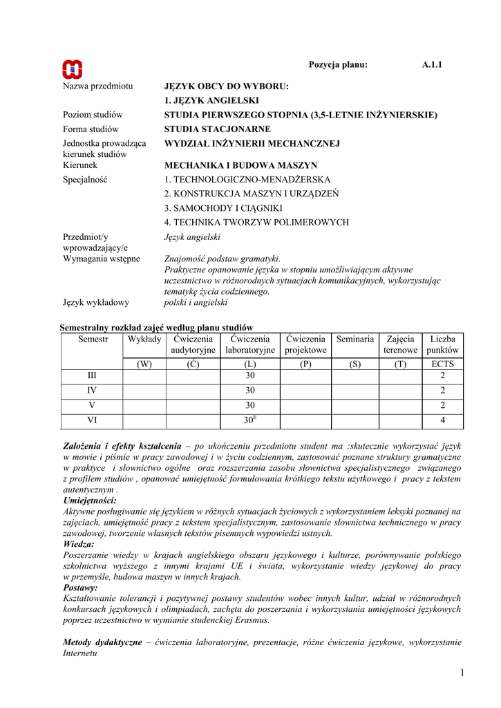 Pozycja planu: A.1.1 JĘZYK OBCY DO WYBORU: Nazwa przedmiotu 1. JĘZYK ANGIELSKI Poziom studiów STUDIA PIERWSZEGO STOPNIA (3,5-LETNIE INŻYNIERSKIE) Forma studiów STUDIA STACJONARNE Jednostka prowadząca kierunek studiów Kierunek WYDZIAŁ INŻYNIERII MECHANCZNEJ Specjalność 1. TECHNOLOGICZNO-MENADŻERSKA MECHANIKA I BUDOWA MASZYN 2. KONSTRUKCJA MASZYN I URZĄDZEŃ 3. SAMOCHODY I CIĄGNIKI 4. TECHNIKA TWORZYW POLIMEROWYCH Przedmiot/y wprowadzający/e Wymagania wstępne Język wykładowy Język angielski Znajomość podstaw gramatyki. Praktyczne opanowanie języka w stopniu umożliwiającym aktywne uczestnictwo w różnorodnych sytuacjach komunikacyjnych, wykorzystując tematykę życia codziennego. polski i angielski Semestralny rozkład zajęć według planu studiów Wykłady Ćwiczenia Ćwiczenia Semestr audytoryjne laboratoryjne (W) (Ć) Ćwiczenia projektowe Seminaria (P) (S) Zajęcia Liczba terenowe punktów III (L) 30 IV 30 2 V 30 2 VI 30 E (T) ECTS 2 4 Założenia i efekty kształcenia – po ukończeniu przedmiotu student ma :skutecznie wykorzystać język w mowie i piśmie w pracy zawodowej i w życiu codziennym, zastosować poznane struktury gramatyczne w praktyce i słownictwo ogólne oraz rozszerzania zasobu słownictwa specjalistycznego związanego z profilem studiów , opanować umiejętność formułowania krótkiego tekstu użytkowego i pracy z tekstem autentycznym . Umiejętności: Aktywne posługiwanie się językiem w różnych sytuacjach życiowych z wykorzystaniem leksyki poznanej na zajęciach, umiejętność pracy z tekstem specjalistycznym, zastosowanie słownictwa technicznego w pracy zawodowej, tworzenie własnych tekstów pisemnych wypowiedzi ustnych. Wiedza: Poszerzanie wiedzy w krajach angielskiego obszaru językowego i kulturze, porównywanie polskiego szkolnictwa wyższego z innymi krajami UE i świata, wykorzystanie wiedzy językowej do pracy w przemyśle, budowa maszyn w innych krajach. Postawy: Kształtowanie tolerancji i pozytywnej postawy studentów wobec innych kultur, udział w różnorodnych konkursach językowych i olimpiadach, zachęta do poszerzania i wykorzystania umiejętności językowych poprzez uczestnictwo w wymianie studenckiej Erasmus. Metody dydaktyczne – ćwiczenia laboratoryjne, prezentacje, różne ćwiczenia językowe, wykorzystanie Internetu 1 Forma i warunki zaliczenia przedmiotu - kolokwia, egzamin ( VI semestr ) Treści kształcenia: Ćwiczenia - tematyka wprowadzonego słownictwa( ja i moje otoczenie, życie codzienne, czas wolny, hobby, praca , wybór zawodu, przygotowanie się do rozmowy kwalifikacyjnej, zawieranie znajomości, podróże, tolerancja, zdrowie ,środki masowego przekazu np. Internet, komputer, słownictwo specjalistyczne, gramatyka (rzeczowniki ,przymiotniki, przysłówki, liczebniki, przyimki, czasy gramatyczne, mowa zależna i niezależna, zdania warunkowe . Nazwisko (a) osoby prowadzącej (cych) lub odpowiedzialnej (ych) za realizację przedmiotu Mgr Agnieszka Górecka-Ciechacka Literatura: Literatura podstawowa: 1. P.Kerr-Straightforward 2. S.Kay,V. Jones-New Inside Out Literatura uzupełniająca: 1. M. Cieślak-English-repetytorium tematyczno- leksykalne 2. B.Jasińska-Język angielski-repetytorium gramatyki z ćwiczeniami 3. E.Murphy – Grammar in use 4. czasopisma: Amercan machinist, Newsweek, Time, USA Today 5. Professional English in use (Engineering) – teksty 6. Internet: artykuły specjalistyczne związane z profilem studiów 2 Pozycja planu: A.1.2 JĘZYK OBCY DO WYBORU: Nazwa przedmiotu 2. JĘZYK NIEMIECKI Poziom studiów STUDIA PIERWSZEGO STOPNIA (3,5-LETNIE INŻYNIERSKIE) Forma studiów STUDIA STACJONARNE Jednostka prowadząca kierunek studiów Kierunek WYDZIAŁ INŻYNIERII MECHANCZNEJ Specjalność 1. TECHNOLOGICZNO-MENADŻERSKA MECHANIKA I BUDOWA MASZYN 2. KONSTRUKCJA MASZYN I URZĄDZEŃ 3. SAMOCHODY I CIĄGNIKI 4. TECHNIKA TWORZYW POLIMEROWYCH Przedmiot/y wprowadzający/e Wymagania wstępne Język niemiecki w stopniu podstawowym Język wykładowy Język polski/niemiecki Znajomość podstaw gramatycznych i leksykalnych z języka niemieckiego Semestralny rozkład zajęć według planu studiów Wykłady Ćwiczenia Ćwiczenia Semestr audytoryjne laboratoryjne (W) (Ć) Ćwiczenia projektowe Seminaria (P) (S) Zajęcia Liczba terenowe punktów III (L) 30 IV 30 2 V 30 2 VI 30 E (T) ECTS 2 4 Założenia i efekty kształcenia – rozwijanie sprawności językowych receptywnych: rozumienia ze słuchu tekstów wypowiadanych przez rodzimych użytkowników z elementami języka fachowego i czytania ze zrozumieniem tekstów autentycznych, szczególnie tekstów technicznych z dziedziny kierunku studiów, np.: budowa maszyn oraz sprawności produktywne jak pisanie: listu intencyjnego, życiorysu, przygotowanie prezentacji oraz mówienie jak prowadzenie rozmowy na temat: zainteresowań czy pracy zawodowej, studiów Umiejętności: umiejętność posługiwania się językiem w sytuacjach dnia codziennego, opisania swojej osoby i otoczenia, uzyskania informacji, postawienia pytań i udzielenia odpowiedzi, umiejętność zrozumienia i właściwego przetłumaczenia tekstów specjalistycznych Wiedza: opanowanie słownictwa z dziedziny kierunku studiów np.: budowa i praca maszyn jak obrabiarki, narzędzia, zdobycie wiedzy o tej gałęzi przemysłu w Niemczech: Maschinenbau, mechanika i budowa maszyn jako kierunek studiów na naszej uczelni, przedmioty na studiach, przykładowe prezentacje z dziedzin zainteresowań wzbogacające wiedzę specjalistyczną z języka niemieckiego oraz wiedzę o krajach niemieckiego obszaru językowego Postawy: wyrabianie pozytywnej postawy i motywacji wobec nauczanego języka i społeczności nim władającej, rozwijanie kreatywności studentów studiów niestacjonarnych oraz postawy ciekawości, otwartości i tolerancji wobec wszystkich kultur Metody dydaktyczne – ćwiczenia laboratoryjne z zastosowaniem środków medialnych płyt, kaset, filmów, różnorodne ćwiczenia języko