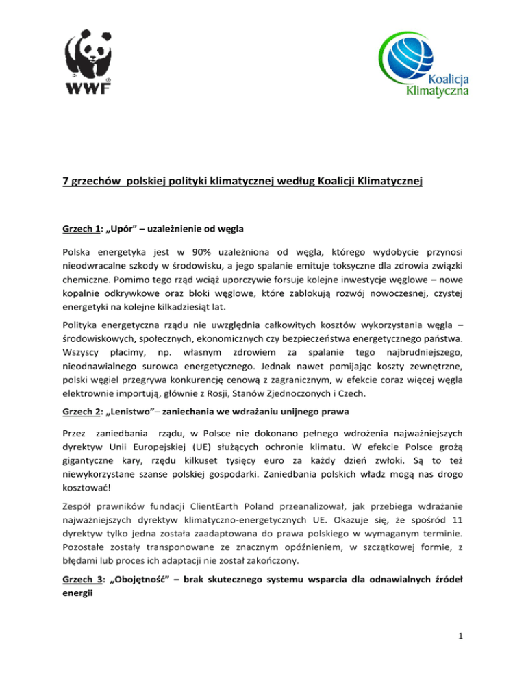 7 grzechów polskiej polityki klimatycznej według Koalicji Klimatycznej Grzech 1: „Upór” – uzależnienie od węgla Polska energetyka jest w 90% uzależniona od węgla, którego wydobycie przynosi nieodwracalne szkody w środowisku, a jego spalanie emituje toksyczne dla zdrowia związki chemiczne. Pomimo tego rząd wciąż uporczywie forsuje kolejne inwestycje węglowe – nowe kopalnie odkrywkowe oraz bloki węglowe, które zablokują rozwój nowoczesnej, czystej energetyki na kolejne kilkadziesiąt lat. Polityka energetyczna rządu nie uwzględnia całkowitych kosztów wykorzystania węgla – środowiskowych, społecznych, ekonomicznych czy bezpieczeństwa energetycznego państwa. Wszyscy płacimy, np. własnym zdrowiem za spalanie tego najbrudniejszego, nieodnawialnego surowca energetycznego. Jednak nawet pomijając koszty zewnętrzne, polski węgiel przegrywa konkurencję cenową z zagranicznym, w efekcie coraz więcej węgla elektrownie importują, głównie z Rosji, Stanów Zjednoczonych i Czech. Grzech 2: „Lenistwo”– zaniechania we wdrażaniu unijnego prawa Przez zaniedbania rządu, w Polsce nie dokonano pełnego wdrożenia najważniejszych dyrektyw Unii Europejskiej (UE) służących ochronie klimatu. W efekcie Polsce grożą gigantyczne kary, rzędu kilkuset tysięcy euro za każdy dzień zwłoki. Są to też niewykorzystane szanse polskiej gospodarki. Zaniedbania polskich władz mogą nas drogo kosztować! Zespół prawników fundacji ClientEarth Poland przeanalizował, jak przebiega wdrażanie najważniejszych dyrektyw klimatyczno-energetycznych UE. Okazuje się, że spośród 11 dyrektyw tylko jedna została zaadaptowana do prawa polskiego w wymaganym terminie. Pozostałe zostały transponowane ze znacznym opóźnieniem, w szczątkowej formie, z błędami lub proces ich adaptacji nie został zakończony. Grzech 3: „Obojętność” – brak skutecznego systemu wsparcia dla odnawialnych źródeł energii 1 Aktualny system wsparcia promuje współspalanie – technologię szkodliwą z punktu widzenia ochrony środowiska i „odnawialności zasobów”, z której korzystają głównie koncerny węglowe. Rozwój OZE jest blokowany, szczególnie dla obywateli, którzy zamierzają wziąć udział w produkowaniu czystej energii. . Producenci odnawialnych źródeł energii zmagają się z biurokracją, niskimi cenami zielonych certyfikatów oraz niepewnością odnośnie systemu wsparcia dla odnawialnych źródeł w przyszłości. Rząd nie ma spójnej wizji rozwoju rynku OZE ani propozycji stabilnych systemów wsparcia, za to bardzo często wprowadza zmiany w propozycjach nowych przepisów. Destabilizuje polski rynek OZE i hamuje jego rozwój, w tym powstanie nowych miejsc pracy, inwestycje i bezpieczeństwo energetyczne. Podtrzymuje tym samym uzależnienie Polski od nieodnawialnych surowców, również tych sprowadzanych spoza granic naszego kraju. Grzech 4: „Marnotrawstwo” - brak poprawy efektywności polskiej gospodarki Polacy mogliby żyjąc na tym samym poziomie, zużywać trzykrotnie mniej energii, a tym samym płacić znacznie mniejsze rachunki. Polska gospodarka jest jedną z najbardziej energochłonnych w Europie, jeśli chcemy być konkurencyjni musimy znacznie efektywniej wykorzystywać energię. Po prostu nie stać nas marnowanie energii! Pomimo wielu deklaracji, rząd niewiele robi w dziedzinie poprawy efektywności energetycznej. Nasza gospodarka na tym traci, bo poprawa efektywności energetycznej oznacza oszczędności, wzrost innowacyjności gospodarki i nowe, lokalne miejsca pracy, a także wyższy komfort życia obywateli. Korzyści z poprawy efektywności jest więc wiele, a poniesione w związku z tym koszty zwracają się bardzo szybko! Grzech 5: „Krótkowzroczność” – niewykorzystanie szans, które oferuje europejska polityka klimatyczna Politycy wzajemnie obwiniają się dziś o to, kto podpisał pakiet klimatyczno-energetyczny. Tymczasem dzięki niemu polska energetyka może stać się bardziej innowacyjna i konkurencyjna. Zostało już niewiele czasu, aby na tym skorzystać. Dwa razy nie dostaniemy tej samej szansy. Pakiet klimatyczno-energetyczny oznacza, że już od tego roku do polskiego budżetu wpływać będą dodatkowe środki finansowe szacunkowo od 24 do 45 mld złotych w latach 2013 – 2020. Żaden z polityków o tym głośno nie powiedział, bo zamiast środki te przeznaczyć na programy oszczędzania energii i wsparcia OZE, rząd planuje łatać nimi dziurę budżetową. W tym samym czasie Polska blokuje politykę klimatyczną UE. Jest to jednak działanie krótkowzroczne i nieskuteczne. Pomimo naszego sprzeciwu nadal Komisja pracuje nad unijnymi celami klimatyczno-energetycznymi do roku 2030, a Polska traci szansę na „specjalne” traktowanie w nowej polityce. Jeśli chcemy być uważani za partnera w unijnej 2 debacie, powinniśmy konstruktywnie zaangażować się w dyskusje na temat celów i instrumentów polityki klimatycznej do 2030. Grzech 6: „Bezmyślność” - szczyt klimatyczny COP19 dla klimatu czy dla węgla? Już 11 listopada rozpocznie się w Warszawie COP19. Polska, jako gospodarz powinna być poza wszelkimi podejrzeniami, jeżeli chodzi o chęć osłabienia wyników konferencji. Tymczasem jest wręcz przeciwnie, przedstawiciele polskiego rządu będą obecni równocześnie na Szczycie Węglowym, co stawia nas w dwuznacznej sytuacji. Już wkrótce oczy całego świata będą zwrócone na Polskę. Ich uwadze nie ujdzie fakt, że w tym samym czasie odbędzie się w Warszawie Szczyt Węgla i Klimatu organizowany przez Światowy Związek Węglowy (World Coal Association - WCA). Fakt, że oba te wydarzenia odbywają się w tym samym czasie można traktować jak bezmyślność albo działanie z premedytacją. Podczas Szczytu Klimatycznego rząd nie powinien jednocześnie promować wielkich koncernów reprezentujących lobby węglowe, wiedząc, że to spalanie węgla w znacznej mierze przyczynia się do po