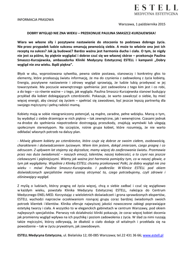 INFORMACJA PRASOWA Warszawa, 1 października 2015 DOBRY WYGLĄD NIE ZNA WIEKU – PRZEKONUJE PAULINA SMASZCZ-KURZAJEWSKA! Wiara we własne siły i pozytywne nastawienie do otoczenia to podstawa dobrego życia. Nie przez przypadek ludzie sukcesu emanują pewnością siebie. A może to właśnie ona jest ich receptą na sukces? Jak ją budować? Bardzo ważna jest harmonia ducha i ciała. O tym, że nigdy nie jest za późno, by pięknie wyglądać i dobrze czuć się we własnej skórze – przekonuje Paulina Smaszcz-Kurzajewska, ambasadorka Kliniki Medycyny Estetycznej ESTELL i kampanii „Dobry wygląd nie zna wieku. Bądź piękna”. Błysk w oku, wyprostowana sylwetka, pewna siebie postawa, stanowczy i konkretny głos to elementy, które przekazują światu informację, że ma do czynienia z zadowoloną z życia kobietą. Energia, pozytywne nastawienie i zdrowy wygląd sprawiają, że ludzie lubią przebywać w jej towarzystwie. Ma poczucie wewnętrznego spełnienia: jest zadowolona z tego kim jest i co robi, a do tego – co równie ważne – z tego, jak wygląda. Paulina Smaszcz-Kurzajewska stanowi budujący przykład dla kobiet dobiegających czterdziestki. Pokazuje, że warto zawalczyć o siebie, by mieć więcej energii, aby cieszyć się życiem – spełniać się zawodowo, być jeszcze lepszą partnerką dla swojego mężczyzny i pełną radości mamą. Kobiety mają w sobie nieograniczony potencjał, są mądre, zaradne, pełne wdzięku. Marzą o tym, by wydobyć z siebie drzemiące w nich piękno – tak zewnętrzne, jak i wewnętrzne. Czasami jednak na drodze do spełnienia niepotrzebnie dostrzegają przeszkody, znajdują wymówki lub ulegają społecznym stereotypom. Na szczęście, rośnie grupa kobiet, które rozumieją, że nie warto odkładać własnych potrzeb na dalszy plan. - Mówię głosem kobiety po czterdziestce, która czuje się dobrze ze swoim ciałem, osobowością, charakterem i doświadczeniem życiowym. Wiem kim jestem, dokąd zmierzam, czego pragnę i co odrzucam. Z upływem lat stajemy się dojrzalsze, mamy więcej do zaoferowania światu. Przemawia przez nas duża świadomość – naszych emocji, talentów, naszej kobiecości, a to czyni nas jeszcze ciekawszymi i piękniejszymi. Wiemy jak ważna jest harmonia pomiędzy tym, co w naszej głowie, a tym jak wyglądamy. Wspólnie z Kliniką ESTELL chcemy przekonywać Polki, że dobry wygląd nie zna wieku – mówi Paulina Smaszcz-Kurzajewska. I podkreśla: W Klinice ESTELL pod okiem doświadczonych specjalistów mamy szansę otrzymać to, czego potrzebujemy, czyli zdrowie i olśniewający wygląd. Z myślą o ludziach, którzy pragną od życia więcej, chcą o siebie zadbać i czuć się wyjątkowo w każdym wieku, powstała Klinika Medycyny Estetycznej ESTELL, należąca do Centrum Medycznego ENEL-MED. Korzystając z wieloletnich doświadczeń i grona sprawdzonych ekspertów, ESTELL wychodzi naprzeciw oczekiwaniom rosnącej grupy coraz bardziej świadomych swoich potrzeb klientek i klientów. Klinika oferuje najwyższej jakości nowoczesne zabiegi poprawiające estetykę twarzy i ciała. A wszystko to w eleganckich gabinetach w centrum Warszawy, pod okiem najlepszych specjalistów. Pierwszy rok działalności kliniki pokazuje, że coraz więcej kobiet docenia jak promienny wygląd wpływa na ich psychikę i poziom zadowolenia z życia. W ślad za nimi ruszają także mężczyźni, którzy odkrywają, że dbałość o ciało dodaje sił witalnych i przekłada się na powodzenie – tak w życiu prywatnym, jak zawodowym. ESTELL Medycyna Estetyczna, ul. Bielańska 12; 00-085 Warszawa; tel.22 431 36 66; www.estell.pl Kontakt dla mediów: Dorota Steliga - tel. 512 949 039, e-mail [email protected] Informacje o firmie: Centrum Medyczne ENEL-MED S.A. istnieje od 1993 roku. Od 2011 r. jest spółką notowaną na Giełdzie Papierów Wartościowych. ENEL-MED oferuje pełną obsługę medyczną, prowadzi pacjenta od konsultacji, przez diagnostykę, hospitalizację, operację, aż po rehabilitację – czyli przez cały zamknięty cykl leczenia. Na ogólnopolską sieć medyczną ENEL-MED składają się wieloprofilowe oddziały własne, zlokalizowane w Warszawie (Promenada, Atrium, Arkadia, Blue City, Domaniewska, Puławska, Zacisze), Gdańsku (Grunwaldzka), Łodzi (Manufaktura), Krakowie (Galeria Krakowska), Poznaniu (Kupiec Poznański) i Wrocławiu (Arkady Wrocławskie, West Gate), sześć specjalistycznych przychodni przyzakładowych (Sonoco w Łodzi, Philips w Pile, NBP i Millennium w Warszawie, LG Display Poland w Tarnobrzeskiej Specjalnej Strefie Ekonomicznej Biskupice Podgórne, Podstrefie Wrocław-Kobierzyce, Przychodnia Przyzakładowa w Rossmann SDP w Łodzi), klinika medycyny estetycznej ESTELL oraz dwa szpitale w Warszawie: wielospecjalistyczny Szpital Zacisze, funkcjonujący od 1998 r. (operacje z zakresu: ginekologii, laryngologii, okulistyki, chirurgii naczyniowej i ogólnej) i otwarty w 2012 r. Szpital Centrum, gdzie wybitni lekarze operatorzy przeprowadzają innowacyjne zabiegi z zakresu ortopedii, neurochirurgii i chirurgii ręki. Ogólnopolska sieć medyczna ENEL-MED obejmuje również ponad 1.300 placówek partnerskich w całej Polsce. Centrum zatrudnia wybitnych lekarzy w prawie 60 specjalnościach, m.in. ginekologów, kardiologów, ortopedów, neurologów, okulistów, pediatrów oraz psychologów. Kompleksowa oferta wieloprofilowych oddziałów obejmuje badania laboratoryjne, szeroki zakres badań USG, EKG, pracownie RTG, drobne zabiegi chirurgiczne i dermatologiczne. ENEL-MED świadczy też kompleksowe usługi dla dzieci i dorosłych w zakresie stomatologii zachowawczej, protetyki i chirurgii. Ma na koncie liczne wyróżnienia za osiągnięcia implantologiczne. Świetnie wyposażone oddziały rehabilitacji umożliwiają przeprowadzenie leczenia rehabilitacyjnego we wszelkich schorzeniach narządu ruchu o charakterze przeciążeniowym lub przewlekłym. Prestiżowy Program 24h dla zdrowia poz