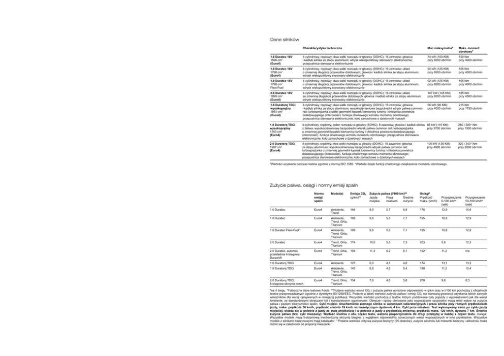 Dane silników Charakterystyka techniczna Moc maksymalnaØ Maks. moment obrotowyØ 1.6 Duratec 16V 1596 cm3 (Euro4) 4-cylindrowy, rzędowy; dwa wałki rozrządu w głowicy (DOHC); 16 zaworów; głowica i kadłub silnika ze stopu aluminium; wtrysk wielopunktowy sterowany elektronicznie; przepustnica sterowana elektronicznie 74 kW (100 KM) przy 6000 obr/min 150 Nm przy 4000 obr/min 1.8 Duratec 16V 1798 cm3 (Euro4) 4-cylindrowy, rzędowy; dwa wałki rozrządu w głowicy (DOHC); 16 zaworów; układ o zmiennej długości przewodów dolotowych; głowica i kadłub silnika ze stopu aluminium; wtrysk wielopunktowy sterowany elektronicznie 92 kW (125 KM) przy 6000 obr/min 165 Nm przy 4000 obr/min 1.8 Duratec 16V 1798 cm3 Flexi-Fuel 4-cylindrowy, rzędowy; dwa wałki rozrządu w głowicy (DOHC); 16 zaworów; układ o zmiennej długości przewodów dolotowych; głowica i kadłub silnika ze stopu aluminium; wtrysk wielopunktowy sterowany elektronicznie 92 kW (125 KM) przy 6000 obr/min 165 Nm przy 4000 obr/min 2.0 Duratec 16V 1999 cm3 (Euro4) 4-cylindrowy, rzędowy; dwa wałki rozrządu w głowicy (DOHC); 16 zaworów; układ ze zmienną długością przewodów dolotowych; głowica i kadłub silnika ze stopu aluminium; wtrysk wielopunktowy sterowany elektronicznie 107 kW (145 KM) przy 6000 obr/min 185 Nm przy 4500 obr/min 1.6 Duratorq TDCi wysokoprężny 1560 cm3 (Euro4) 4-cylindrowy, rzędowy; dwa wałki rozrządu w głowicy (DOHC); 16 zaworów; głowica i kadłub silnika ze stopu aluminium; wysokociśnieniowy bezpośredni wtrysk paliwa common rail; turbosprężarka o stałej geometrii łopatek kierownicy turbiny i chłodnica powietrza doładowującego (intercooler), funkcja chwilowego wzrostu momentu obrotowego; przepustnica sterowana elektronicznie; koło zamachowe o dzielonych masach 66 kW (90 KM) przy 4000 obr/min 215 Nm przy 1750 obr/min 1.8 Duratorq TDCi wysokoprężny 1753 cm3 (Euro4) 4-cylindrowy, rzędowy; jeden rozrządu w głowicy (SOHC); 8 zaworów; głowica i kadłub silnika 85 kW (115 KM) z żeliwa; wysokociśnieniowy bezpośredni wtrysk paliwa common rail; turbosprężarka przy 3700 obr/min o zmiennej geometrii łopatek kierownicy turbiny i chłodnica powietrza doładowującego (intercooler), funkcja chwilowego wzrostu momentu obrotowego; przepustnica sterowana elektronicznie; koło zamachowe o dzielonych masach 280 / 300* Nm przy 1900 obr/min 2.0 Duratorq TDCi 1997 cm3 (Euro4) 4-cylindrowy, rzędowy; dwa wałki rozrządu w głowicy (DOHC); 16 zaworów; głowica ze stopu aluminium; wysokociśnieniowy bezpośredni wtrysk paliwa common rail; turbosprężarka o zmiennej geometrii łopatek kierownicy turbiny i chłodnica powietrza doładowującego (intercooler), funkcja chwilowego wzrostu momentu obrotowego; przepustnica sterowana elektronicznie; koło zamachowe o dzielonych masach 320 / 340* Nm przy 2000 obr/min 100 kW (136 KM) przy 4000 obr/min Wartości uzyskane podczas testów zgodnie z normą ISO 1585. *Wartość dzięki funkcji chwilowego zwiększenia momentu obrotowego. Ø Zużycie paliwa, osiągi i normy emisji spalin Norma emisji spalin Model(e) Emisja CO2 (g/km)ØØ Zużycie paliwa (l/100 km)ØØ Jazda Poza Średnie miejska miastem zużycie OsiagiØ Prędkość maks. (km/h) 1.6 Duratec Euro4 Ambiente, Trend 164 8,9 5,7 6,9 1.8 Duratec Euro4 Ambiente, 169 Trend, Ghia, Titanium 9,6 5,6 1.8 Duratec Flexi-Fuel1) Euro4 Ambiente, 169 Trend, Ghia, Titanium 9,6 2.0 Duratec Euro4 Trend, Ghia, 174 Titanium 2.0 Duratec, automat. przekładnia 4-biegowa Durashift Euro4 Trend, Ghia, 194 Titanium 1.6 Duratorq TDCi Euro4 Ambiente 127 6,0 4,1 4,8 1.8 Duratorq TDCi Euro4 Ambiente, 143 Trend, Ghia, Titanium 6,9 4,5 5,4 2.0 Duratorq TDCi, 6-biegowa skrzynia mech. Euro4 Trend, Ghia, 154 Titanium 7,6 4,8 5,8 200 Przyspieszenie 0-100 km/h (sek) Przyspieszenie 50-100 km/h* (sek) 175 12,9 14,6 7,1 195 10,8 12,9 5,6 7,1 195 10,8 12,9 10,0 5,6 7,3 203 9,8 12,3 11,3 6,2 8,1 192 11,2 n/a 174 13,1 13,3 188 11,2 10,4 9,6 8,3 *na 4 biegu. ØFabryczne dane testowe Forda. ØØPodane wartości emisji CO2 i zużycia paliwa wyrażone odpowiednio w g/km oraz w l/100 km pochodzą z oficjalnych testów przeprowadzanych zgodnie z dyrektywą 80/1268/EEC. Podane w tabeli wartości zużycia paliwa i emisji CO2 nie stanowią gwarancji uzyskania takich samych wskaźników dla wersji opisywanych w niniejszej publikacji. Wszystkie wartości pochodzą z testów, którym poddawane były pojazdy z wyposażeniem jak dla wersji Ambiente, ze standardowymi obręczami kół i standardowym ogumieniem. Obręcze i opony oferowane jako wyposażenie opcjonalne mogą mieć wpływ na zużycie paliwa i poziom toksyczności spalin. Cykl miejski: Uruchomienie zimnego silnika w warunkach laboratoryjnych i praca silnika przy różnych prędkościach jazdy, maks. prędkość 50 km/h, prędkość średnia 19 km/h na teoretycznym dystansie 4 km. Cykl poza miastem: Test wykonywany zaraz po cyklu jazdy miejskiej; składa się w połowie z jazdy ze stałą prędkością i w połowie z jazdy z prędkością zmienną; prędkość maks. 120 km/h, dystans 7 km. Średnie zużycie paliwa (tzw. cykl mieszany): Wartość średnia z obu części testu, ważona proporcjonalnie do drogi przebytej w każdej z części testu. Uwaga: Wszystkie modele mają 5-stopniową mechaniczną skrzynię biegów, z wyjątkiem odpowiednio oznaczonych wersji wyposażonych w inne przekładnie. Wszystkie modele z silnikami benzynowymi mają katalizator. 1) Podane wartości dotyczą zużycia beznyny (95 oktanów), zużycie alkoholu lub miesznki benzyny i alkocholu może różnić się w zależności od proporcji mieszanki.