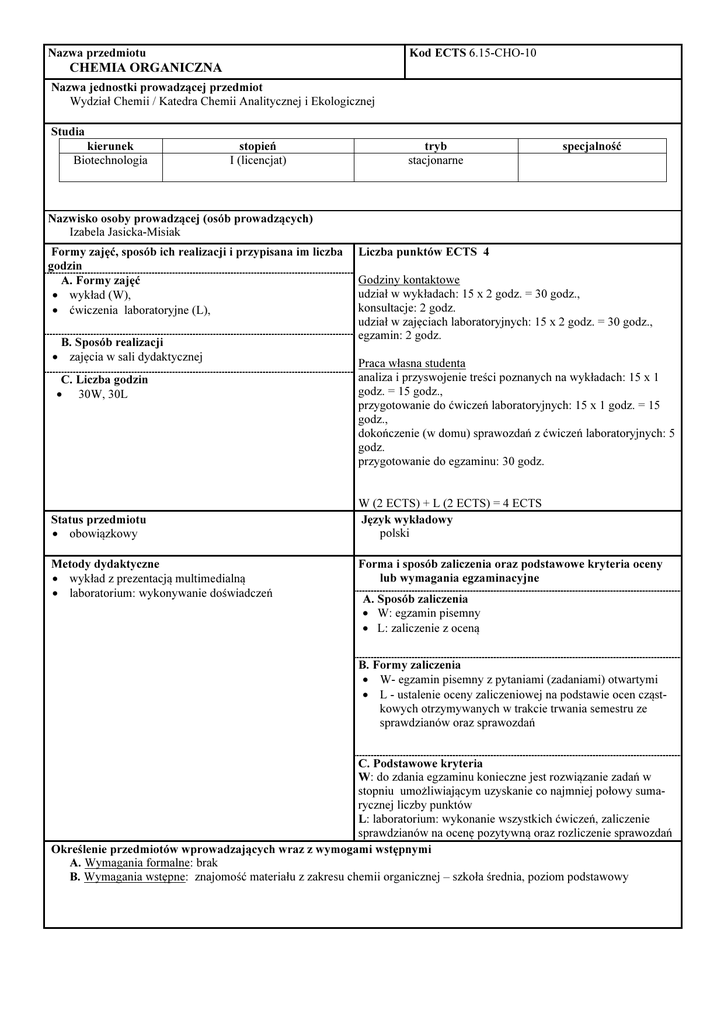 Kod ECTS 6.15-CHO-10 Nazwa przedmiotu CHEMIA ORGANICZNA Nazwa jednostki prowadzącej przedmiot Wydział Chemii / Katedra Chemii Analitycznej i Ekologicznej Studia kierunek Biotechnologia stopień I (licencjat) tryb stacjonarne specjalność Nazwisko osoby prowadzącej (osób prowadzących) Izabela Jasicka-Misiak Formy zajęć, sposób ich realizacji i przypisana im liczba godzin A. Formy zajęć • wykład (W), • ćwiczenia laboratoryjne (L), B. Sposób realizacji • zajęcia w sali dydaktycznej C. Liczba godzin • 30W, 30L Status przedmiotu • obowiązkowy Metody dydaktyczne • wykład z prezentacją multimedialną • laboratorium: wykonywanie doświadczeń Liczba punktów ECTS 4 Godziny kontaktowe udział w wykładach: 15 x 2 godz. = 30 godz., konsultacje: 2 godz. udział w zajęciach laboratoryjnych: 15 x 2 godz. = 30 godz., egzamin: 2 godz. Praca własna studenta analiza i przyswojenie treści poznanych na wykładach: 15 x 1 godz. = 15 godz., przygotowanie do ćwiczeń laboratoryjnych: 15 x 1 godz. = 15 godz., dokończenie (w domu) sprawozdań z ćwiczeń laboratoryjnych: 5 godz. przygotowanie do egzaminu: 30 godz. W (2 ECTS) + L (2 ECTS) = 4 ECTS Język wykładowy polski Forma i sposób zaliczenia oraz podstawowe kryteria oceny lub wymagania egzaminacyjne A. Sposób zaliczenia • W: egzamin pisemny • L: zaliczenie z oceną B. Formy zaliczenia • W- egzamin pisemny z pytaniami (zadaniami) otwartymi • L - ustalenie oceny zaliczeniowej na podstawie ocen cząstkowych otrzymywanych w trakcie trwania semestru ze sprawdzianów oraz sprawozdań C. Podstawowe kryteria W: do zdania egzaminu konieczne jest rozwiązanie zadań w stopniu umożliwiającym uzyskanie co najmniej połowy sumarycznej liczby punktów L: laboratorium: wykonanie wszystkich ćwiczeń, zaliczenie sprawdzianów na ocenę pozytywną oraz rozliczenie sprawozdań Określenie przedmiotów wprowadzających wraz z wymogami wstępnymi A. Wymagania formalne: brak B. Wymagania wstępne: znajomość materiału z zakresu chemii organicznej – szkoła średnia, poziom podstawowy Cele przedmiotu Opanowanie podstaw wiedzy przyrodniczej w zakresie chemii organicznej niezbędnej do dalszego studiowania: − znajomość głównych klas związków organicznych oraz ich właściwości fizycznych i chemicznych − przyswojenie podstaw nomenklatury związków organicznych − rozumienie wpływu struktury związku na jego właściwości fizykochemiczne − znajomość podstawowych typów reakcji chemicznych − przygotowanie do podjęcia nauki kolejnych przedmiotów np. biochemii. Zapoznanie się ze specyfiką pracy laboratoryjnej, pracy w grupie. Poznanie oraz nabycie umiejętności stosowania podstawowych procesów związanych z wyodrębnianiem, oczyszczaniem i identyfikacją związków organicznych oraz oznaczania wybranych właściwości fizykochemicznych. Treści programowe A. Problematyka wykładu − Przedmiot chemii organicznej. Struktura elektronowa cząsteczki organicznej. Typy wiązań chemicznych. Orbitale molekularne sp3,sp2 i sp. Efekty elektronowe na wiązaniach π i σ. Istota teorii rezonansu. − Węglowodory alifatyczne: alkany, alkeny, alkiny, cykloalkany (nomenklatura, występowanie, właściwości). − Węglowodory aromatyczne: nazewnictwo pochodnych benzenu, reguła Hückla, reakcje podstawienia elektrofilowego, wpływ podstawników na reakcje podstawienia elektrofilowego. − Rodzaje izometrii w związkach organicznych : łańcuchowa, położeniowa, izometria geometryczna (cis-trans, Z-E), izometria optyczna: konfiguracja względna (D, L) i bezwzględna (R, S). − Alkohole mono i wielowodorotlenowe, etery i fenole ( nomenklatura, budowa, metody otrzymywania, właściwości. − Aldehydy i ketony (alifatyczne i aromatyczne): nomenklatura, otrzymywanie, podział właściwości uzależniony od obecności grupy karbonylowej. − Aminy (alifatyczne i aromatyczne): budowa amin pierwszo-, drugo- i trzeciorzędowych i związków aminowych, nomenklatura, właściwości, reakcje podstawienia elektrofilowego w aminach aromatycznych. − Kwasy karboksylowe (alifatyczne i aromatyczne): budowa, nomenklatura, otrzymywanie, występowanie. − Pochodne funkcyjne kwasów karboksylowych: sole, chlorki, amidy, bezwodniki, estry (nomenklatura, właściwości). − Aminokwasy i białka: ustalenie struktury aminokwasów i peptydów, wiązanie peptydowe, właściwości analityczne. − Związki heterocykliczne: układy pięcio- i sześcioczłonowe, podstawienie elektrofilowe i nukleofilowe, układy skondensowane. − Węglowodany: podział, wzory Fisher’a, struktura cykliczna, reakcje, glikozydy, disacharydy i polisacharydy. B. Problematyka ćwiczeń laboratoryjnych Laboratorium przygotowawcze (podstawowe szkło oraz aparatura laboratoryjna). Techniki chromatograficzne (chromatografia cienkowarstwowa, bibułowa, chromatografia kolumnowa). Techniki ekstrakcyjne (ciecz-ciecz, ciało stałe-ciecz, ekstrakcja w aparacie Soxhleta). Metody destylacyjne. Krystalizacja. Identyfikacja wyodrębnionych związków organicznych. Wykaz literatury A. Literatura wymagana do ostatecznego zaliczenia zajęć (zdania egzaminu): A.1. wykorzystywana podczas zajęć • Mastalerz P., Podręcznik Chemii Organicznej, Wydawnictwo Chemiczne Dorota Mastalerz, Wrocław 1996 • Patrick G., Krótkie wykłady Chemia Organiczna, Wydawnictwo Naukowe PWN, Warszawa 2005 • • A.2. studiowana samodzielnie przez studenta Achremowicz L., Soroka M., Laboratorium Chemii Organicznej, Politechnika Wrocławska 1980 McMurry M., Chemia organiczna, PWN, Warszawa 2000 Efekty kształcenia A. Literatura uzupełniająca • A.I. Vogel: Preparatyka organiczna, Wydawnictwo Naukowo-Techniczne, Warszawa 1984 • Zieliński W., Rajca A., Spektroskopowe metody identyfikacji związków organicznych, WNT, Warszawa, 1995 Wiedza W1 Zna budowę podstawowych klas związków organicznych oraz ich strukturalnych właściwości, włączając stereochemię W2 Zna zasady nomenklatury zwią