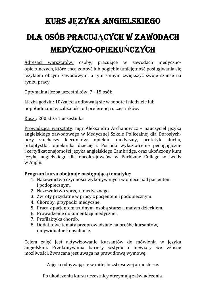KURS jĘzyka angielskiego dla osób pracujĄcych w zawodach medyczno-opiekuŃczych Adresaci warsztatów: osoby, pracujące w zawodach medycznoopiekuńczych, które chcą zdobyć lub pogłębić umiejętność posługiwania się językiem obcym zawodowym, a tym samym zwiększyć swoje szanse na rynku pracy. Optymalna liczba uczestników: 7 - 15 osób Liczba godzin: 10/zajęcia odbywają się w sobotę i niedzielę lub popołudniami w zależności od preferencji uczestników. Koszt: 200 zł za 1 uczestnika Prowadząca warsztaty: mgr Aleksandra Archanowicz – nauczyciel języka angielskiego zawodowego w Medycznej Szkole Policealnej dla Dorosłychuczy słuchaczy kierunków: opiekun medyczny, protetyk słuchu, ortoptystka, opiekunka dziecięca. Posiada wykształcenie pedagogiczne i certyfikat znajomości języka angielskiego Cambridge, oraz ukończony kurs języka angielskiego dla obcokrajowców w ParkLane College w Leeds w Anglii. Program kursu obejmuje następującą tematykę: 1. Nazewnictwo czynności wykonywanych w opiece nad pacjentem i podopiecznym. 2. Nazewnictwo sprzętu medycznego. 3. Zwroty przydatne w pracy z pacjentem i podopiecznym. 4. Choroby, przypadki medyczne. 5. Praca z pacjentem trudnym, osobą starszą, małym dzieckiem. 6. Prowadzenie dokumentacji medycznej. 7. Profilaktyka chorób. 8. Dodatkowe tematy przeprowadzane na prośbę kursantów, indywidualne konsultacje. Celem zajęć jest aktywizowanie kursantów do mówienia w języku angielskim. Przełamywania bariery wstydu i niewiary we własne możliwości. Zwracana jest uwaga na prawidłową wymowę. Zajęcia odbywają się w miłej bezstresowej atmosferze. Po ukonczeniu kursu uczestnicy otrzymują zaswiadczenia.