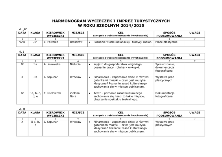 HARMONOGRAM WYCIECZEK I IMPREZ TURYSTYCZNYCH W ROKU SZKOLNYM 2014/2015 kl. „0” DATA KLASA 1 2 V/VI „0” kl. I DATA KLASA KIEROWNIK WYCIECZKI 3 E. Pawełko KIEROWNIK WYCIECZKI CEL (związek z treściami nauczania i wychowania) 4 Ostaszów 5 MIEJSCE Poznanie wioski indiańskiej i tradycji Indian. CEL (związek z treściami nauczania i wychowania) 6 7 Prace plastyczne SPOSÓB PODSUMOWANIA UWAGI 6 7 2 Ia A. Kurowska Nielubia Wyjazd do gospodarstwa wiejskiego, poznanie pracy rolnika – wykopki. Sprawozdanie, dokumentacja fotograficzna X Ib J. Szpunar Wrocław Filharmonia - zapoznanie dzieci z różnymi gatunkami muzyki – czym jest muzyka klasyczna? Poznanie zasad kulturalnego zachowania się w miejscu publicznym. Wystawa prac plastycznych IV I a, b, c, d, e E. Mielniczek Zielona Góra Teatr – poznanie zasad kulturalnego zachowania się, teatr to takie miejsce, obejrzenie spektaklu teatralnego. Dokumentacja fotograficzna 1 2 X II a, b, c KIEROWNIK WYCIECZKI 3 J. Szpunar 5 UWAGI 1 KLASA 4 SPOSÓB PODSUMOWANIA IX kl. II DATA 3 MIEJSCE MIEJSCE CEL (związek z treściami nauczania i wychowania) 4 Wrocław 5 Filharmonia - zapoznanie dzieci z różnymi gatunkami muzyki – czym jest muzyka klasyczna? Poznanie zasad kulturalnego zachowania się w miejscu publicznym. SPOSÓB PODSUMOWANIA UWAGI 6 7 Wystawa prac plastycznych V II a, b, c, d K. Grygorowicz Zagórze Śląskie Zapoznanie z zabytkami oraz historią Dolnego Śląska, poznanie fauny i flory charakterystycznej dla regionu. Dziennik wycieczki VI II a, b, c, d K. Adamczewska - Popów Ostaszów Zapoznanie dzieci z kulturą Indian, wdrażanie do aktywnego spędzania wolnego czasu. Dokumentacja zdjęciowa KLASA KIEROWNIK WYCIECZKI kl. III DATA CEL (związek z treściami nauczania i wychowania) 6 7 2 III a R. Janczak Przemków Poznanie osobowości przyrodniczych Przemkowskiego Parku Krajobrazowego. Edukacja regionalna – zabytki i historia Przemkowa – zajęcia w terenie „Stawy Przemkowskie”. Prezentacja zdjęć wystawa XI III a, b, c, d R. Janczak Zielona Góra Teatr – jako forma artystyczna, środki przekazu w teatrze. Wystawa prac plastycznych KIEROWNIK WYCIECZKI 3 5 UWAGI 1 KLASA 4 SPOSÓB PODSUMOWANIA IX kl. IV DATA 3 MIEJSCE MIEJSCE CEL (związek z treściami nauczania i wychowania) 4 5 SPOSÓB PODSUMOWANIA UWAGI 6 7 1 2 IX IV b A. Bobeła Legnica Udział w imprezie popularno – naukowej „Festiwal Nauki”. Sprawozdanie, dokumentacja fotograficzna X IV a B. Siemieńska – Pleszka Głogów Warsztaty z kaligrafii – zapoznanie uczniów z architekturą gotycką i jej cechami. Poznajemy funkcję muzeum – figury płaskie i przestrzenne. Prace plastyczne, dokumentacja fotograficzna III IV a B. Siemieńska – Pleszka Wschowa Poznajemy architekturę renesansu i baroku – osie symetrii figur. Dokumentacja fotograficzna, sprawozdanie V IV a, b, c, d S. Radzięciak Wrocław Panorama Racławicka, Muzeum Przyrodnicze – zwiedzanie i zapoznanie się z bitwa pod Racławicami, czytanie różnych rodzajów tekstów z uwzględnieniem celu – informacja, czytanie ze zrozumieniem prostego tekstu zawierającego informację ciekawe. Poznanie zwierząt, ptaków i owadów dawniej zamieszkujących ziemię. Sprawozdanie, wystawa widokówek VI IV a, b, c, d J. Sobczyk Skansen Leszczyna Dzień Dziecka - warsztaty na ścieżce ekologicznej – ognisko, integracja zespołu klas IV. Sprawozdanie, dokumentacja fotograficzna kl. V DATA KLASA KIEROWNIK WYCIECZKI 3 MIEJSCE CEL (związek z treściami nauczania i wychowania) 4 5 SPOSÓB PODSUMOWANIA UWAGI 6 7 1 2 IX V a, c K. Pieńko Wrocław Opera – poznanie zasad kulturalnego zachowania się w miejscu publicznym, świadomy odbiór spektaklu operowego. Sprawozdanie, dokumentacja fotograficzna IX Vb A. Bobeła Legnica Udział w imprezie popularno – naukowej „Festiwal Nauki”. Sprawozdanie, dokumentacja fotograficzna X/XI Vb E. Prokopowicz Wrocław Opera – poznanie zasad kulturalnego zachowania się w miejscu publicznym, świadomy odbiór przedstawienia operowego. Dokumentacja fotograficzna V Vb A. Bobeła Skansen Marcinowice Poznanie zabytków kultury ludowej, zwyczajów mieszkańców wsi, udział w warsztatach ludowych. Dokumentacja fotograficzna V/VI V a, c K. Pieńko Trójmiasto Poznanie zabytkowych miejsc, kultury ludowej, zwyczajów. Rozwijanie Dokumentacja fotograficzna zainteresowań, udział w warsztatach naukowych. kl. VI DATA KLASA KIEROWNIK WYCIECZKI 3 MIEJSCE CEL (związek z treściami nauczania i wychowania) 4 5 SPOSÓB PODSUMOWANIA UWAGI 6 7 1 2 X/XI VI a E. Prokopowicz Wrocław Opera – poznanie zasad kulturalnego zachowania się w miejscu publicznym, świadomy odbiór przedstawienia operowego. Dokumentacja fotograficzna XI VI d K. Wesołek Jawor Warsztaty plastyczne – rozwijanie poczucia więzi narodowej i szacunku dla tradycji oraz symboli narodowych. Wystawa, dokumentacja fotograficzna III VI a A. Bobeła Skansen Marcinowice Poznanie zabytków kultury ludowej, zwyczajów mieszkańców wsi, udział w warsztatach ludowych. Dokumentacja fotograficzna V VI c A. Partyka Zagórze Śląskie Poznajemy walory przyrodnicze Dolnego Śląska. Dokumentacja fotograficzna V IV – VI M. Salbierz Londyn Kształtowanie umiejętności językowych, zapoznanie z tradycją kraju. Sprawozdanie V VI a, d K. Wesołek Berlin Wykorzystanie wiedzy lingwistycznej w praktyce, rozwijanie kompetencji interkulturowej i tolerancji wobec innych narodów. Dokumentacja fotograficzna, wystawa V IV – VI D. Paszkiewicz Długopole Zdrój „Euroweek” – kształtowanie umiejętności językowych. Dokumentacja fotograficzna V – VI VI b VI IV – VI K. Pieńko Trójmiasto Poznanie zabytkowych miejsc, kultury ludowej, zwyczajów. Rozwijanie zainteresowań, udział w warsztatach naukowych. Dokumentacja fotograficzna J. Kamińska Warszawa Zwiedzanie Centrum Nauki Kopernik, zapoznanie z tradycją i historią Polski. Dokumentacja fotograficzna Koordynator ds. wycieczek i imprez turystycznych