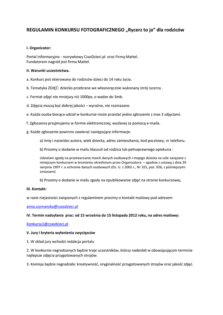 REGULAMIN KONKURSU FOTOGRAFICZNEGO „Rycerz to ja” dla rodziców I. Organizator: Portal informacyjno - rozrywkowy CzasDzieci.pl oraz Firmą Mattel. Fundatorem nagród jest firma Mattel. II. Warunki uczestnictwa. a. Konkurs jest skierowany do rodziców dzieci do 14 roku życia. b. Tematyka ZDJĘĆ: dziecko przebrane we własnoręcznie wykonany strój rycerza . c. Format zdjęć nie mniejszy niż 1000px, o wadze do 3mb. d. Zdjęcia muszą być dobrej jakości – wyraźne, nie rozmazane. e. Każda osoba biorąca udział w konkursie może przesłać jedno zgłoszenie z max 3 zdjęciami. f. Zgłoszenia przyjmujemy w formie elektronicznej, wysłanej za pomocą e-maila. g. Każde zgłoszenie powinno zawierać następujące informacje: a) Imię i nazwisko autora, wiek dziecka, adres zamieszkania, kod pocztowy, nr telefonu. b) Prosimy o dodanie w mailu klauzuli od rodzica lub pełnoprawnego opiekuna : Udzielam zgodę na przetwarzanie moich danych osobowych i mojego dziecka na cele związane z niniejszym konkursem w brzmieniu określonym przez Organizatora – zgodnie z ustawą z dnia 29 sierpnia 1997 r. o ochronie danych osobowych (Dz. U. z 2002 r., Nr 101, poz. 926, z późniejszymi zmianami) b) Prosimy o dodanie w mailu zgody na opublikowanie zdjęć na stronie konkursowej. III. Kontakt: w razie niejasności związanych z regulaminem prosimy o kontakt mailowy pod adresem [email protected] IV. Termin nadsyłania prac: od 15 września do 15 listopada 2012 roku, na adres mailowy: [email protected] V. Jury i kryteria wyłonienia zwycięzców 1. W skład jury wchodzi redakcja portalu 2. W konkursie nagrodzonych będzie troje uczestników, którzy nadesłali w obowiązującym terminie najlepsze zdjęcia przygotowanych strojów. 3. Komisja będzie nagradzała: kreatywność, oryginalność przygotowanych strojów oraz jakość zdjęć. VI. Wyniki konkursu: zostaną zamieszczone na stronie http://czasdzieci.pl/imaginext/konkurs/ do dnia 30 listopada 2012., a nagrody zostaną wysłane najpóźniej do dnia 15 grudnia 2012. VII. Nagrody W Konkursie przewidziane są następujące nagrody: 3 zamki 5 smoków 10 machin bojowych VIII. Odpowiedzialność za przesyłki pocztowe 1. Organizator nie ponosi odpowiedzialności za doręczenie, prawidłowość i terminowość doręczenia przez pocztę lub kuriera – listów, telegramów i innych przesyłek wysyłanych w imieniu Organizatora lub przez/do Organizatora w związku z niniejszym konkursem. 2. Organizator nie ponosi odpowiedzialności za nieprawidłowości związane z opóźnieniem lub niedoręczeniem nagrody wynikające z błędnego podania przez Uczestnika konkursu adresu oraz innych danych, niezbędnych do wydania nagrody. 3. Organizator nie ponosi odpowiedzialności za zmianę miejsca zamieszkania i/lub podanego przez Uczestnika adresu do korespondencji Uczestnika konkursu lub zmianę innych danych – uniemożliwiającą przesłanie Uczestnikowi nagrody, jak również za niemożność odbioru lub nieodebranie nagrody, z jakiejkolwiek przyczyny przez Uczestnika. W takim przypadku nagrodzony Uczestnik traci prawo do nagrody. IX. Uwagi dodatkowe. a. W konkursie nie mogą brać udział osoby należące do redakcji portalu Czasdzieci.pl oraz członkowie ich rodzin., a także pracownicy firmy Mattel b. Prace niezgodne z regulaminem nie będą brane pod uwagę. c. Prace przechodzą na własność organizatorów i będą prezentowane na portalu Czasdzieci.pl , bez ujawniania danych osobowych uczestników konkursu. d. Rozstrzygnięcie jury jest ostateczne (od werdyktu nie przysługuje odwołanie). e. Osoby nagrodzone zostaną powiadomione drogą mailową, oraz zostaną wymienieni w zakładce „Zobacz wyniki” pod konkursem. ORGANIZATOR