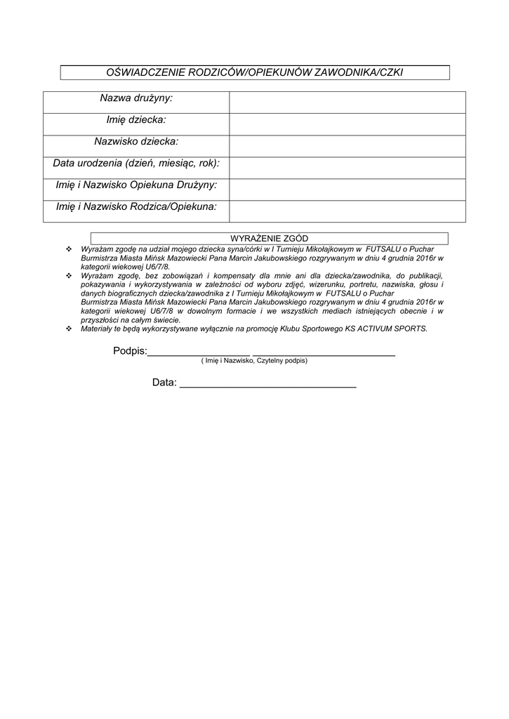 OŚWIADCZENIE RODZICÓW/OPIEKUNÓW ZAWODNIKA/CZKI Nazwa drużyny: Imię dziecka: Nazwisko dziecka: Data urodzenia (dzień, miesiąc, rok): Imię i Nazwisko Opiekuna Drużyny: Imię i Nazwisko Rodzica/Opiekuna: WYRAŻENIE ZGÓD Wyrażam zgodę na udział mojego dziecka syna/córki w I Turnieju Mikołajkowym w FUTSALU o Puchar Burmistrza Miasta Mińsk Mazowiecki Pana Marcin Jakubowskiego rozgrywanym w dniu 4 grudnia 2016r w kategorii wiekowej U6/7/8. Wyrażam zgodę, bez zobowiązań i kompensaty dla mnie ani dla dziecka/zawodnika, do publikacji, pokazywania i wykorzystywania w zależności od wyboru zdjęć, wizerunku, portretu, nazwiska, głosu i danych biograficznych dziecka/zawodnika z I Turnieju Mikołajkowym w FUTSALU o Puchar Burmistrza Miasta Mińsk Mazowiecki Pana Marcin Jakubowskiego rozgrywanym w dniu 4 grudnia 2016r w kategorii wiekowej U6/7/8 w dowolnym formacie i we wszystkich mediach istniejących obecnie i w przyszłości na całym świecie. Materiały te będą wykorzystywane wyłącznie na promocję Klubu Sportowego KS ACTIVUM SPORTS. Podpis:__________________ _________________________ ( Imię i Nazwisko, Czytelny podpis) Data: _______________________________