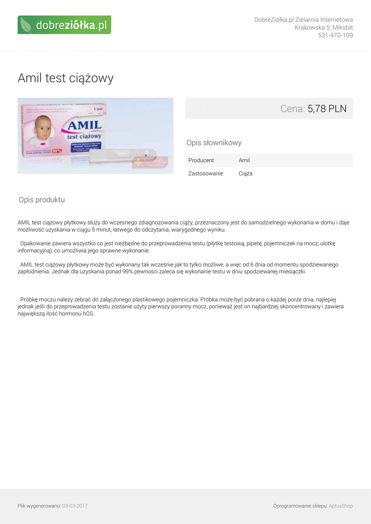 DobreZiółka.pl Zielarnia Internetowa Krakowska 5, Mikstat 531-470-109 Amil test ciążowy Cena: 5,78 PLN Opis słownikowy Producent Amil Zastosowanie Ciąża Opis produktu AMIL test ciążowy płytkowy służy do wczesnego zdiagnozowania ciąży, przeznaczony jest do samodzielnego wykonania w domu i daje możliwość uzyskania w ciągu 5 minut, łatwego do odczytania, wiarygodnego wyniku. Opakowanie zawiera wszystko co jest niezbędne do przeprowadzenia testu (płytkę testową, pipetę, pojemniczek na mocz, ulotkę informacyjną), co umożliwia jego sprawne wykonanie. AMIL test ciążowy płytkowy może być wykonany tak wcześnie jak to tylko możliwe, a więc od 6 dnia od momentu spodziewanego zapłodnienia. Jednak dla uzyskania ponad 99% pewności zaleca się wykonanie testu w dniu spodziewanej miesiączki. Próbkę moczu należy zebrać do załączonego plastikowego pojemniczka. Próbka może być pobrana o każdej porze dnia, najlepiej jednak jeśli do przeprowadzenia testu zostanie użyty pierwszy poranny mocz, ponieważ jest on najbardziej skoncentrowany i zawiera największą ilość hormonu hCG. Plik wygenerowano: 03-03-2017 Powered by TCPDF (www.tcpdf.org) Oprogramowanie sklepu: AptusShop