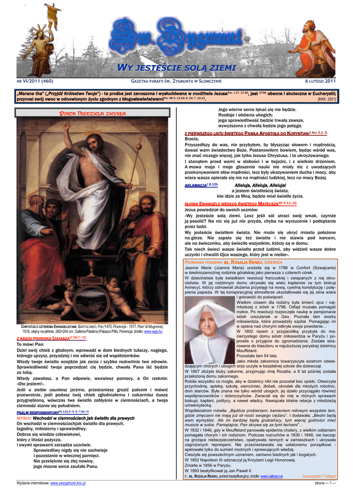 WY JESTEŚCIE SOLĄ ZIEMI…« »… NR VI/2011 (460) GAZETKA PARAFII ŚW. ZYGMUNTA W SŁOMCZYNIE 6 LUTEGO 2011 „Marana tha” („Przyjdź Królestwo Twoje”) - ta prośba jest zanoszona i wysłuchiwana w modlitwie JezusaPor. J 17, 17-20, jest 2746 obecna i skuteczna w Eucharystii; przynosi swój owoc w odnowionym życiu zgodnym z błogosławieństwamiPor. Mt 5, 13-16; 6, 24; 7, 12-13. [KKK, 2821] PIĄTA NIEDZIELA Jego wierne serce lękać się nie będzie. Rozdaje i obdarza ubogich; jego sprawiedliwość będzie trwała zawsze, wywyższona z chwałą będzie jego potęga. ZWYKŁA Z PIERWSZEGO LISTU ŚWIĘTEGO PAWŁA APOSTOŁA DO KORYNTIAN1 Kor 2,1–5 Bracia, Przyszedłszy do was, nie przybyłem, by błyszcząc słowem i mądrością, dawać wam świadectwo Boże. Postanowiłem bowiem, będąc wśród was, nie znać niczego więcej, jak tylko Jezusa Chrystusa, i to ukrzyżowanego. I stanąłem przed wami w słabości i w bojaźni, i z wielkim drżeniem. A mowa moja i moje głoszenie nauki nie miały nic z uwodzących przekonywaniem słów mądrości, lecz były ukazywaniem ducha i mocy, aby wiara wasza opierała się nie na mądrości ludzkiej, lecz na mocy Bożej. AKLAMACJAJ 8,12b Alleluja, Alleluja, Alleluja! a jestem światłością świata, kto idzie za Mną, będzie miał światło życia. SŁOWA EWANGELII WEDŁUG ŚWIĘTEGO MATEUSZAMt 5,13–16 Jezus powiedział do swoich uczniów: »Wy jesteście solą ziemi. Lecz jeśli sól utraci swój smak, czymże ją posolić? Na nic się już nie przyda, chyba na wyrzucenie i podeptanie przez ludzi. Wy jesteście światłem świata. Nie może się ukryć miasto położone na górze. Nie zapala się też światła i nie stawia pod korcem, ale na świeczniku, aby świeciło wszystkim, którzy są w domu. Tak niech świeci wasze światło przed ludźmi, aby widzieli wasze dobre uczynki i chwalili Ojca waszego, który jest w niebie«. PATRONKA TYGODNIA: BŁ. ROSALIA RENDU, DZIEWICA CHRYSTUS Z CZTEREMA EWANGELISTAMI, BARTOLOMEO, Fra (1472, Florencja - 1517, Pian' di Mugnone), 1516, olejny na płótnie, 282×204 cm, Galleria Palatina (Palazzo Pitti), Florencja; źródło: www.wga.hu Z KSIĘGI PROROKA IZAJASZAIZ 58,7–10 To mówi Pan: Dziel swój chleb z głodnym, wprowadź w dom biednych tułaczy, nagiego, którego ujrzysz, przyodziej i nie odwróć się od współziomków. Wtedy twoje światło wzejdzie jak zorza i szybko rozkwitnie twe zdrowie. Sprawiedliwość twoja poprzedzać cię będzie, chwała Pana iść będzie za tobą. Wtedy zawołasz, a Pan odpowie, wezwiesz pomocy, a On rzeknie: »Oto jestem!«. Jeśli u siebie usuniesz jarzmo, przestaniesz grozić palcem i mówić przewrotnie, jeśli podasz twój chleb zgłodniałemu i nakarmisz duszę przygnębioną, wówczas twe światło zabłyśnie w ciemnościach, a twoja ciemność stanie się południem. PSALM RESPONSORYJNYPs 112,4–5. 6–7.8a i 9 REFREN: Wschodzi w ciemnościach jak światło dla prawych On wschodzi w ciemnościachjak światło dla prawych, łagodny, miłosierny i sprawiedliwy. Dobrze się wiedzie człowiekowi, który z litości pożycza, i swymi sprawami zarządza uczciwie. Sprawiedliwy nigdy się nie zachwieje i pozostanie w wiecznej pamięci. Nie przelęknie się złej nowiny, jego mocne serce zaufało Panu. Wydanie internetowe: www.swzygmunt.knc.pl Jeanne Marie (Joanna Maria) urodziła się w 1786 w Confort (Szwajcaria) w średniozamożnej rodzinie góralskiej jako pierwsza z czterech córek. W dzieciństwie była świadkiem rewolucji francuskiej i związanych z nią okrucieństw. W jej rodzinnym domu ukrywało się wielu kapłanów (w tym biskup Annecy), którzy odmawiali złożenia przysięgi na nową, cywilną konstytucję i potępienia papieża. W tej konspiracyjnej atmosferze ukształtowała się jej silna wiara i gotowość do poświęceń. Wielkim ciosem dla rodziny była śmierć ojca i najmłodszej z sióstr w 1796. Odtąd musiała pomagać matce. Po rewolucji rozpoczęła naukę w pensjonacie sióstr urszulanek w Gex. Poznała tam siostry miłosierdzia, które prowadziły szpital. Pomagając im w opiece nad chorymi odkryła swoje powołanie… W 1802 razem z przyjaciółką przybyła do macierzystego domu sióstr miłosierdzia w Paryżu i poprosiła o przyjęcie do zgromadzenia. Została skierowana do klasztoru w najuboższej paryskiej dzielnicy Mouffetard. Pozostała tam 54 lata. Jako młoda zakonnica towarzyszyła siostrom odwiedzającym chorych i ubogich oraz uczyła w bezpłatnej szkole dla dziewcząt. W 1807 złożyła śluby zakonne, przyjmując imię Rozalia, a 8 lat później została przełożoną domu zakonnego. Robiła wszystko co mogła, aby w dzielnicy nikt nie pozostał bez opieki. Otworzyła przychodnię, aptekę, szkołę, sierociniec, żłobek, ośrodek dla młodych robotnic, dom starców. Była znana nie tylko wśród ubogich, jej dzieło przyciągało również współpracowników i dobroczyńców. Zwracali się do niej w różnych sprawach biskupi, kapłani, politycy, a nawet władcy. Nawiązała bliskie relacje z młodzieżą uniwersytecką. Współsiostrom mówiła: „Bądźcie probierzem, kamieniem milowym wszędzie tam, gdzie zmęczeni nie mają już sił nosić swojego ciężaru”. I dodawała; „Biedni będą wam wymyślać. Ale im bardziej będą grubiańscy, tym więcej godności mieć musicie w sobie. Pamiętajcie, Pan skrywa się za tymi łachami”… W 1832 i 1846, gdy w Mouffetard panowała epidemia cholery, z wielkim oddaniem pomagała chorym i ich rodzinom. Podczas rozruchów w 1830 i 1848, nie bacząc na grożące niebezpieczeństwo, opatrywała rannych w zamieszkach i ukrywała zagrożonych represjami. Nie przeciwstawiała się ustalonemu porządkowi apelowała tylko do sumień możnych i sprawujących władzę. Cieszyła się powszechnym uznaniem, zarówno biednych jak i bogatych. W 1852 Napoleon III odznaczył ją Krzyżem Legii Honorowej. Zmarła w 1856 w Paryżu. W 1993 beatyfikował ją Jan Paweł II. il.: B