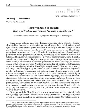 Полемические статьи, полемики 262 ISSN 1642-1248 Σ Ο Φ Ι Α Vol. 15 (2015) DOI: 10.15584/sofia.2015.15.17 Andrzej L. Zachariasz Uniwersytet Rzeszowski Wprowadzenie do panelu Komu potrzebna jest jeszcze filozofia i filozofowie? Введение в дискуссию: Кому еще нужнa философия и философы? Przed nami kolejna, dziewiąta dyskusja okrągłego stołu filozofów krajów słowiańskich. Można by powiedzieć, że tak jak przed laty, nadal stoimy przed tymi samymi problemami; przed pytaniem o filozofię. Choć dziś wydaje się ono przybierać bardziej dramatyczną formułę. Pytamy bowiem nie o stan filozofii, jej perspektywy rozwoju, ale o to: czy filozofia i filozofowie są jeszcze komukolwiek potrzebni? Proces pragmatyzacji kultury dokonujący się w ostatnim stuleciu nie tylko nasilił się, ale wręcz zdominował jej wymiar humanistyczny. Sama filozofia wydaje się rezygnować z dotychczasowego fundamentalistycznego pojmowania samej siebie, a zwłaszcza swoich zadań poznawczych. Wiele wskazuje, że odeszła ona od pytań o to, co pierwsze. Niektórzy autorzy, tak jak choćby Odo Marquard, wprost formułują tezę o końcu filozofii pierwszych zasad1. Choć są i tacy, którzy idą dalej i obwieszczają w ogóle koniec filozofii. Filozofia bywa także rugowana ze sfery publicznej. Ograniczana jest, jeśli nie wręcz likwidowana, z listy przedmiotów nauczanych w szkołach średnich, ale także w uczelniach. Dzieje się to w atmosferze odchodzenia od idei wykształcenia ogólnego, a zwłaszcza humanistycznego, i dążeniem do upraktycznienia szkolnictwa wyższego. Szkoła wyższa wedle aktualnych decydentów winna przygotowywać młodzież do tzw. życia praktycznego, a dokładnie do pracy zawodowej. Stąd też najczęstszym argumentem, mającym uzasadniać decyzje mające na celu ograniczenie filozofii, jeśli nie wręcz jej eliminowanie, jest jej mała przydatność, albo wręcz nieprzydatność w życiu praktycznym. W tej sytuacji dla filozofii, niejako wbrew dotychczasowej jej definicji utożsamiającej ją z poznaniem teoretycznym, a więc poznaniem poszukującym prawdy dla niej samej, poszukuje się uzasadnienia praktycznego. Czy takie pojmowa1 Tak np. Odo Marquard formułuje tezę o potrzebie rozstania się z filozofią pierwszych zasad, proponując ją zastąpić myśleniem sceptycznym i agnostycyzmem. Zob. O. Marquard, Rozstanie z filozofią pierwszych zasad, przekład K. Krzemieniowa, Oficyna Naukowa, Warszawa 1994. Artykuły polemiczne, polemiki 263 nie filozofii można uznać za zasadne? Czy racją filozofii jest wskazanie: komu jest jeszcze potrzebna filozofia i filozofowie? Czy poszukiwanie prawdy dla niej samej okazało się bezzasadne? A prawda sama w sobie przestała być wartością? Sądzę, że warto nad tymi kwestiami, a także innymi, które nas nurtują, podjąć refleksję. Zapraszam do wypowiedzi. ISSN 1642-1248 Σ Ο Φ Ι Α Vol. 15 (2015) DOI: 10.15584/sofia.2015.15.18 Jan Zouhar Masarykova univerzita v Brně Czy z filozofii można żyć? Можно ли из философии жить? Filozofię współcześnie rozumie się przede wszystkim jako dyscyplinę krytyczną, której zadaniem nie jest kreowanie jednolitych i harmonijnych światów (pod tym względem filozofia zawsze zawodziła), lecz krytyczny stosunek do świata, człowieka, społeczeństwa, myślenia. Zadaniem filozofii powinna być więc analiza, krytyka i rozpoznanie tego, co dzieje się wokół nas na płaszczyźnie myślenia i działania praktycznego. Co to znaczy poznać rzeczywistość za pomocą filozofii? Czy świat współczesny jest na tyle skomplikowany, że nie można go zrozumieć? Wydaje się, że dla poszczególnych pokoleń zawsze taki był; skomplikowany i trudny do zrozumienia. Problem polega na tym, że w czasach minionych niezrozumiałe sytuacje można było uprościć, gdyż trwały one dostatecznie długo, by je przeanalizować i tym samym zrozumieć. Współcześnie zmiany przebiegają coraz szybciej i szybciej. Pociąga to za sobą kilka konsekwencji: 1) Nie możemy mieć własnego doświadczenia, jesteśmy zdani na doświadczenia innych; jesteśmy pod wpływem informacji przekazywanych w mediach. 2) Świat i rzeczywistość są nam jedynie zapośredniczone; to, co uważamy za nasze doświadczenie świata, nie jest naszym światem lecz światem zapośredniczonym [imagologia – M. Kundera: nieśmiertelność; symulakr (Baudrillard) = obraz nie przedstawiający rzeczywistości lecz rzeczywistość pozorujący]. 3) Z tego wynika poczucie obcości świata; świat i współczesność są wobec nas obce. 4) Ten obcy świat uważamy jednak za świat rzeczywisty.