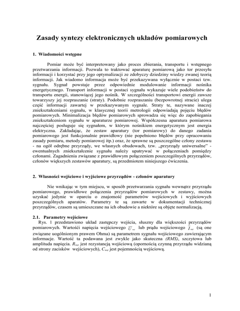 Zasady syntezy elektronicznych układów pomiarowych 1. Wiadomości wstępne Pomiar moŜe być interpretowany jako proces zbierania, transportu i wstępnego przetwarzania informacji. Pozwala to traktować aparaturę pomiarową jako tor przesyłu informacji i korzystać przy jego optymalizacji ze zdobyczy dziedziny wiedzy zwanej teorią informacji. Jak wiadomo informacja moŜe być przekazywana wyłącznie w postaci tzw. sygnału. Sygnał powstaje przez odpowiednie modulowanie informacji nośnika energetycznego. Transport informacji w postaci sygnału wykazuje wiele podobieństw do transportu energii, stanowiącej jego nośnik. W szczególności transportowi energii zawsze towarzyszy jej rozpraszanie (straty). Podobnie rozpraszaniu (bezpowrotnej stracie) ulega część informacji zawartej w przekazywanym sygnale. Straty te, nazywane inaczej zniekształceniami sygnału, w klasycznej teorii metrologii odpowiadają pojęciu błędów pomiarowych. Minimalizacja błędów pomiarowych sprowadza się więc do zapobiegania zniekształceniom sygnału w aparaturze pomiarowej. Współczesna aparatura pomiarowa najczęściej posługuje się sygnałem, w którym nośnikiem energetycznym jest energia elektryczna. Zakładając, Ŝe zestaw aparatury (tor pomiarowy) do danego zadania pomiarowego jest funkcjonalnie prawidłowy (nie popełniono błędów przy opracowaniu zasady pomiaru, metody pomiarowej itp.) oraz, Ŝe sprawne są poszczególne człony zestawu - na ogół odrębne przyrządy, we własnych obudowach, tzw. „przyrządy uniwersalne” ewentualnych zniekształcenie sygnału naleŜy upatrywać w połączeniach pomiędzy członami. Zagadnienia związane z prawidłowym połączeniem poszczególnych przyrządów, członów większych zestawów aparatury, są przedmiotem niniejszego ćwiczenia. 2. Własności wejściowe i wyjściowe przyrządów - członów aparatury Nie wnikając w tym miejscu, w sposób przetwarzania sygnału wewnątrz przyrządu pomiarowego, prawidłowe połączenia przyrządów pomiarowych w zestawy, moŜna uzyskać jedynie w oparciu o znajomość parametrów wejściowych i wyjściowych poszczególnych aparatów. Parametry te są zawarte w dokumentacji technicznej przyrządów, czasem są umieszczane na ich obudowie a niektóre są objęte normalizacją. 2.1. Parametry wejściowe Rys. 1 przedstawiono układ zastępczy wejścia, słuszny dla większości przyrządów pomiarowych. Wartośći napięcia wejściowego U we lub prądu wejściowego I we (są one związane uogólnionym prawem Ohma) są parametrem sygnału wejściowego zawierającym informacje. Wartość ta podawana jest zwykle jako skuteczna (RMS), szczytowa lub amplituda napięcia. Rwe jest rezystancją wejściową (opornością czynną przyrządu widzianą od strony zacisków wejściowych), Cwe jest pojemnością wejściową. 1 Iwe Uwe Rwe Cwe Rys. 1. Schemat zastępczy układu wejścia 2.2. Parametry wyjściowe Jeden z moŜliwych wariantów układu zastępczego „czynnego” wyjścia przyrządu przedstawia rys. 2 (wyjściem czynnym nazywamy wyjście, z którego moŜe być czerpana energia elektryczna). Jeśli E jest siłą elektromotoryczną źródła napięciowego, szeregowa rezystancja Rwy - rezystancją wyjściową urządzenia a Ro - oporność obciąŜenia reprezentuje w tym przypadku rezystancję wejściową urządzenia współpracującego z wyjściem przyrządu. Wartości U wy , I wy są parametrami sygnału wyjściowego zawierającymi informacje. Rwy E Iwy Uwy Rwe Rys. 2. Schemat zastępczy czynnego układu wyjściowego Z ∆R, ∆C lub ∆L Rys. 3. Schemat układu wejściowego Zasadniczo inny jest układ zastępczy tzw. wyjścia biernego (parametrycznego). Przyrządy posiadające takie wyjście nie generują w swoim wnętrzu energii elektrycznej a więc nie wytwarzają sygnału. Informacja pojawia się na takim wyjściu w postaci zmiany 2 któregoś z parametrów obwodu (rezystancji, pojemności lub indukcyjności) i moŜe być przekształcona w sygnał dopiero w następnym członie aparatury, odpowiednio skonstruowanym. Schemat zastępczy wyjścia parametrycznego przedstawia ogólnie rys. 3, gdzie Z jest uogólnioną zastępczą impedancją wyjściową układu. 3. Własności przejściowe przyrządów Prawidłowe przetwarzanie sygnałów wewnątrz przyrządu (między jego wejściem a wyjściem) odbywa się zawsze tylko w pewnych granicach zmian sygnału wejściowego. Najistotniejsze są dwa ograniczenia opisane niŜej. 3.1 Ograniczenia wynikające z kształtu charakterystyki statycznej Statyczną funkcją przetwarzania przyrządu nazywamy zaleŜność przedstawioną graficznie jako charakterystykę statyczną ( rys. 4) Y = f( X ) , gdzie: Y - istotna z punktu widzenia zawartości informacji cecha sygnału wyjściowego, X - istotna z punktu widzenia zawartości informacji cecha sygnału wejściowego. y x y x część robocza obszar przesterowania Rys. 4. Charakterystyka statyczna przyrządu Część robocza charakterystyki statycznej jest zwykle prostoliniowa. 3.2 Ograniczenia częstotliwościowe Błędy przetwarzania związane z częstotliwością sygnału wejściowego określa transmitancja układu. Dla sygnału sinusoidalnego moduł transmitancji ujmuje zaleŜność: Y( ω ) | G(jω ) |= = K( ω ) X( ω) gdzie: Y ( ω ) - amplituda sygnału wyjściowego, X ( ω ) - amplituda sygnału wejściowego. 3 K(ω) ∆K(ω) ω pasmo przenoszenia Rys. 5. Charakterystyka częstotliwościowa modułu przyrządu ZaleŜność K = f ( ω ) nazywamy charakterystyką amplitudowo - częstotliwościową. Przykładową charakterystykę częstotliwościową modułu przedstawia rys. 5, na którym zaznaczono szerokość pasma częstotliwości, w którym sygnał przenoszony jest z dopuszczonym błędem ∆K. Zniekształcenia fazowe sygnału, związane z zaleŜnością argumentu transmitancji od częstotliwości, w większości przypadków są niewielkie przy transmisji informacji i z tego względu są zaniedbywane. 4. Podstawowe 