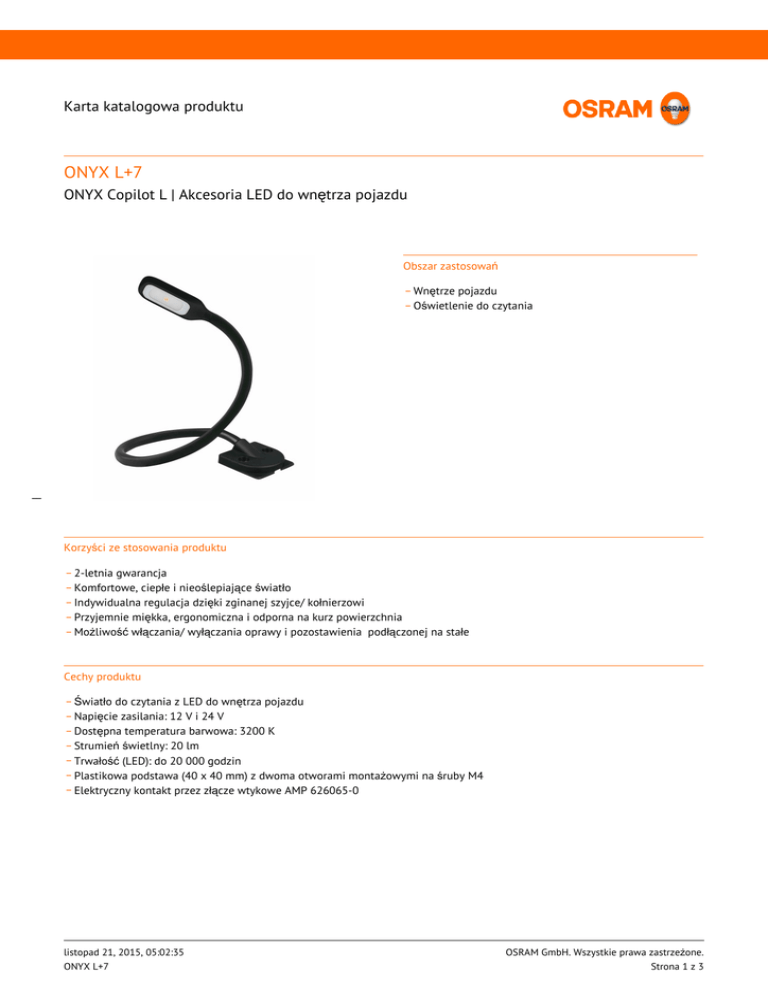 Karta katalogowa produktu ONYX L+7 ONYX Copilot L | Akcesoria LED do wnętrza pojazdu Obszar zastosowań _ Wnętrze pojazdu _ Oświetlenie do czytania __ Korzyści ze stosowania produktu _ 2-letnia gwarancja _ Komfortowe, ciepłe i nieoślepiające światło _ Indywidualna regulacja dzięki zginanej szyjce/ kołnierzowi _ Przyjemnie miękka, ergonomiczna i odporna na kurz powierzchnia _ Możliwość włączania/ wyłączania oprawy i pozostawienia podłączonej na stałe Cechy produktu _ Światło do czytania z LED do wnętrza pojazdu _ Napięcie zasilania: 12 V i 24 V _ Dostępna temperatura barwowa: 3200 K _ Strumień świetlny: 20 lm _ Trwałość (LED): do 20 000 godzin _ Plastikowa podstawa (40 x 40 mm) z dwoma otworami montażowymi na śruby M4 _ Elektryczny kontakt przez złącze wtykowe AMP 626065-0 listopad 21, 2015, 05:02:35 ONYX L+7 OSRAM GmbH. Wszystkie prawa zastrzeżone. Strona 1 z 3 Karta katalogowa produktu Dane techniczne Dane elektryczne Moc wejściowa 0,5 W Moc wejściowa, tolerancja ±10 % Dane fotometryczne Temperatura barwowa 3200 K Wymiary i waga __ Długość listopad 21, 2015, 05:02:35 ONYX L+7 460,0 mm OSRAM GmbH. Wszystkie prawa zastrzeżone. Strona 2 z 3 Karta katalogowa produktu Wyposażenie / Akcesoria _ Pasująca wtyczka współpracująca AMP 626064-0 _ Pasujące wtyczki: AMP 1217281-2, 63241-3, 62572-6 lub 1217321-2 Dane logistyczne Kod produktu Opis produktu Opakowanie (liczba produktów / opakowanie) Wymiary (długość x szerokość x wysokość) Objętość Waga brutto 4052899077324 ONYX L+7 Składane pudełko 1 110 mm x 35 mm x 290 mm 1.12 dm³ 128.00 g 4052899077331 ONYX L+7 Karton wysylkowy 4 149 mm x 118 mm x 302 mm 5.31 dm³ 819.00 g 4052899077348 ONYX L+7 Karton wysylkowy 32 - x - x - Wymieniony kod produktu oznacza najmniejszą ilość produktu, jaka może być zamówiona. Jednostka transportowa może zawierać jedną sztukę lub więcej. Składając zamówienie prosimy o zamawianie ilości odpowiadających jednej lub wielokrotności jednostki transportowej. Odnośniki/łącza __ Warunki gwarancji są dostępne pod www.osram.pl/am-guarantee Oświadczenie Zastrzega się możliwość zmian bez uprzedzenia. Błędy i ominięcia są możliwe. Należy zawsze upewnić się czy korzystasz z najnowszej wersji katalogu. listopad 21, 2015, 05:02:35 ONYX L+7 OSRAM GmbH. Wszystkie prawa zastrzeżone. Strona 3 z 3