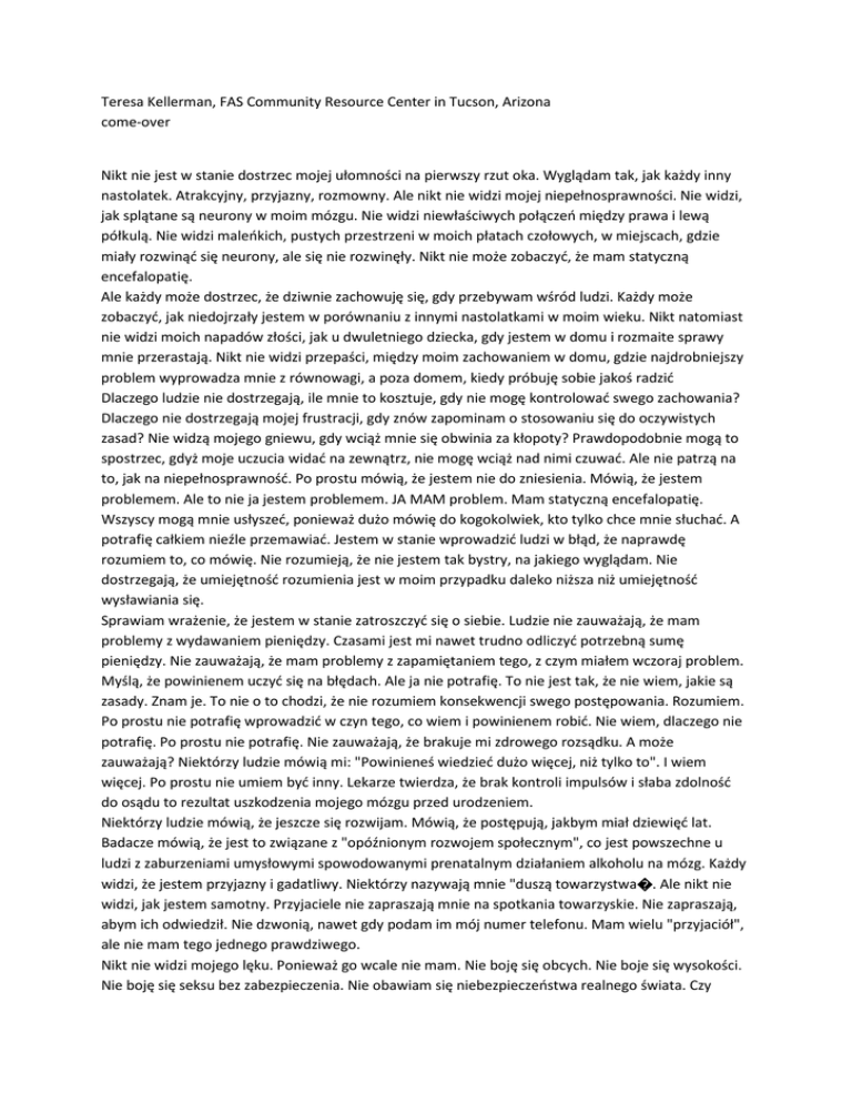Teresa Kellerman, FAS Community Resource Center in Tucson, Arizona come-over Nikt nie jest w stanie dostrzec mojej ułomności na pierwszy rzut oka. Wyglądam tak, jak każdy inny nastolatek. Atrakcyjny, przyjazny, rozmowny. Ale nikt nie widzi mojej niepełnosprawności. Nie widzi, jak splątane są neurony w moim mózgu. Nie widzi niewłaściwych połączeń między prawa i lewą półkulą. Nie widzi maleńkich, pustych przestrzeni w moich płatach czołowych, w miejscach, gdzie miały rozwinąć się neurony, ale się nie rozwinęły. Nikt nie może zobaczyć, że mam statyczną encefalopatię. Ale każdy może dostrzec, że dziwnie zachowuję się, gdy przebywam wśród ludzi. Każdy może zobaczyć, jak niedojrzały jestem w porównaniu z innymi nastolatkami w moim wieku. Nikt natomiast nie widzi moich napadów złości, jak u dwuletniego dziecka, gdy jestem w domu i rozmaite sprawy mnie przerastają. Nikt nie widzi przepaści, między moim zachowaniem w domu, gdzie najdrobniejszy problem wyprowadza mnie z równowagi, a poza domem, kiedy próbuję sobie jakoś radzić Dlaczego ludzie nie dostrzegają, ile mnie to kosztuje, gdy nie mogę kontrolować swego zachowania? Dlaczego nie dostrzegają mojej frustracji, gdy znów zapominam o stosowaniu się do oczywistych zasad? Nie widzą mojego gniewu, gdy wciąż mnie się obwinia za kłopoty? Prawdopodobnie mogą to spostrzec, gdyż moje uczucia widać na zewnątrz, nie mogę wciąż nad nimi czuwać. Ale nie patrzą na to, jak na niepełnosprawność. Po prostu mówią, że jestem nie do zniesienia. Mówią, że jestem problemem. Ale to nie ja jestem problemem. JA MAM problem. Mam statyczną encefalopatię. Wszyscy mogą mnie usłyszeć, ponieważ dużo mówię do kogokolwiek, kto tylko chce mnie słuchać. A potrafię całkiem nieźle przemawiać. Jestem w stanie wprowadzić ludzi w błąd, że naprawdę rozumiem to, co mówię. Nie rozumieją, że nie jestem tak bystry, na jakiego wyglądam. Nie dostrzegają, że umiejętność rozumienia jest w moim przypadku daleko niższa niż umiejętność wysławiania się. Sprawiam wrażenie, że jestem w stanie zatroszczyć się o siebie. Ludzie nie zauważają, że mam problemy z wydawaniem pieniędzy. Czasami jest mi nawet trudno odliczyć potrzebną sumę pieniędzy. Nie zauważają, że mam problemy z zapamiętaniem tego, z czym miałem wczoraj problem. Myślą, że powinienem uczyć się na błędach. Ale ja nie potrafię. To nie jest tak, że nie wiem, jakie są zasady. Znam je. To nie o to chodzi, że nie rozumiem konsekwencji swego postępowania. Rozumiem. Po prostu nie potrafię wprowadzić w czyn tego, co wiem i powinienem robić. Nie wiem, dlaczego nie potrafię. Po prostu nie potrafię. Nie zauważają, że brakuje mi zdrowego rozsądku. A może zauważają? Niektórzy ludzie mówią mi: "Powinieneś wiedzieć dużo więcej, niż tylko to". I wiem więcej. Po prostu nie umiem być inny. Lekarze twierdza, że brak kontroli impulsów i słaba zdolność do osądu to rezultat uszkodzenia mojego mózgu przed urodzeniem. Niektórzy ludzie mówią, że jeszcze się rozwijam. Mówią, że postępują, jakbym miał dziewięć lat. Badacze mówią, że jest to związane z "opóźnionym rozwojem społecznym", co jest powszechne u ludzi z zaburzeniami umysłowymi spowodowanymi prenatalnym działaniem alkoholu na mózg. Każdy widzi, że jestem przyjazny i gadatliwy. Niektórzy nazywają mnie "duszą towarzystwa�. Ale nikt nie widzi, jak jestem samotny. Przyjaciele nie zapraszają mnie na spotkania towarzyskie. Nie zapraszają, abym ich odwiedził. Nie dzwonią, nawet gdy podam im mój numer telefonu. Mam wielu "przyjaciół", ale nie mam tego jednego prawdziwego. Nikt nie widzi mojego lęku. Ponieważ go wcale nie mam. Nie boję się obcych. Nie boje się wysokości. Nie boję się seksu bez zabezpieczenia. Nie obawiam się niebezpieczeństwa realnego świata. Czy powinienem? Może o tym nie pamiętam. Nawet gdy ludzie wciąż mi coś powtarzają, ciągle zapominam. Psycholodzy mówią., że mam problem z przetwarzaniem informacji, deficyt pamięci, deficyt uwagi, nadaktywność. Uff! Niektórzy ludzie, łącznie ze mną samym, mówią, że moja mama jest nadopiekuńcza. Ale fachowcy twierdzą, że jestem podatny na przemoc ze strony innych w rozmaitych sytuacjach społecznych. Ja też narzekam na ograniczenia, ponieważ mama nie pozwala pójść mi na dyskotekę, albo zanocować u przyjaciół. Ona wie, że nie potrafię zachować się właściwie, gdy nie mam odpowiedni ago nadzoru, a ona nie chce, bym wpakował się w kłopoty. Moje sumienie też zdaje się nie funkcjonować prawidłowo. Nie chcę, żeby ludzie denerwowali się na mnie. Nie chcę zachowywać się "niewłaściwie" Nie chcę być zły. Chcę po prostu być rozumiany i akceptowany. Nie obwiniany i zawstydzany. Chcę być doceniany za moje dobre strony. Chcę, żeby ktoś docenił mnie za moje uzdolnienia. Naprawdę mam je, jeśli przypatrzeć się dokładniej. Chcę, żeby ktoś troszczył się o mnie jako o człowieka. Chcę, żebyś się o mnie troszczył, nawet, jeśli sprawiam wrażenie, że mi na tym nie zależy. Chcę, aby okazywano mi szacunek, tak jak tobie. I chcę, abyś przestał mówić źle o mojej biologicznej mamie, że piła, kiedy była ze mną w ciąży. Może nie mogła przestać pić. Może lekarz powiedział jej, że nie ma nic złego w piciu alkoholu w ciąży. Być może nie potrafiła kontrolować swojego zachowania. Może chciała być akceptowania i robiła to, co inni. Może nie zastanawiała się nad tym, co robi. Nie chcę usprawiedliwiać jej postępowania, lub własnego. Chcę tylko, żebyś zrozumiał. Może ona także miała statyczną encefalopatię, tak jak ja. Tylko że nikt tego nie mógł zobaczyć. -------------------------------------------------------------------------------STATYCZNA ENCEFALOPATIA Statyczna encefalopatia oznacza stałe lub nie zmieniające się uszkodzenie mózgu. Wp