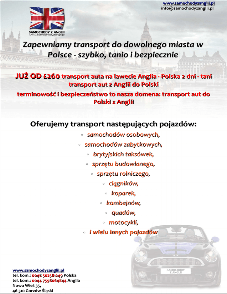 www.samochodyzanglii.pl [email protected] Zapewniamy transport do dowolnego miasta w Polsce - szybko, tanio i bezpiecznie JUŻ OD £260 transport auta na lawecie Anglia - Polska 2 dni - tani transport aut z Anglii do Polski terminowość i bezpieczeństwo to nasza domena: transport aut do Polski z Anglii Oferujemy transport następujących pojazdów: samochodów osobowych, ◦ ◦ samochodów zabytkowych, ◦ brytyjskich taksówek, ◦ sprzętu budowlanego, ◦ sprzętu rolniczego, ciągników, ◦ koparek, ◦ ◦ kombajnów, ◦ quadów, motocykli, i wielu innych pojazdów ◦ ◦ www.samochodyzanglii.pl tel. kom.: 0048 502581249 Polska tel. kom.: 0044 7598064844 Anglia Nowa Wieś 35, 46-310 Gorzów Śląski www.samochodyzanglii.pl [email protected] Transport auta z Anglii do Polski przykładowe cenny : TANI TRANSPORT ANGLIA - POLSKA • Londyn - Wrocław: £260 • Londyn - Lublin: £410 • Manchester - Poznań: £300 • Swansea - Słupsk: £410 • Birmingham - Ełk: £460 CENY TRANSPORTU OBLICZANE SĄ INDYWIDUALNIE NA PODSTAWIE: • długości trasy, • czasu dostawy, • rodzaju pojazdu, ZADZWOŃ, ABY DOWIEDZIEĆ SIĘ WIĘCEJ: 0048 502581249 www.samochodyzanglii.pl tel. kom.: 0048 502581249 Polska tel. kom.: 0044 7598064844 Anglia Nowa Wieś 35, 46-310 Gorzów Śląski www.samochodyzanglii.pl [email protected] www.samochodyzanglii.pl tel. kom.: 0048 502581249 Polska tel. kom.: 0044 7598064844 Anglia Nowa Wieś 35, 46-310 Gorzów Śląski