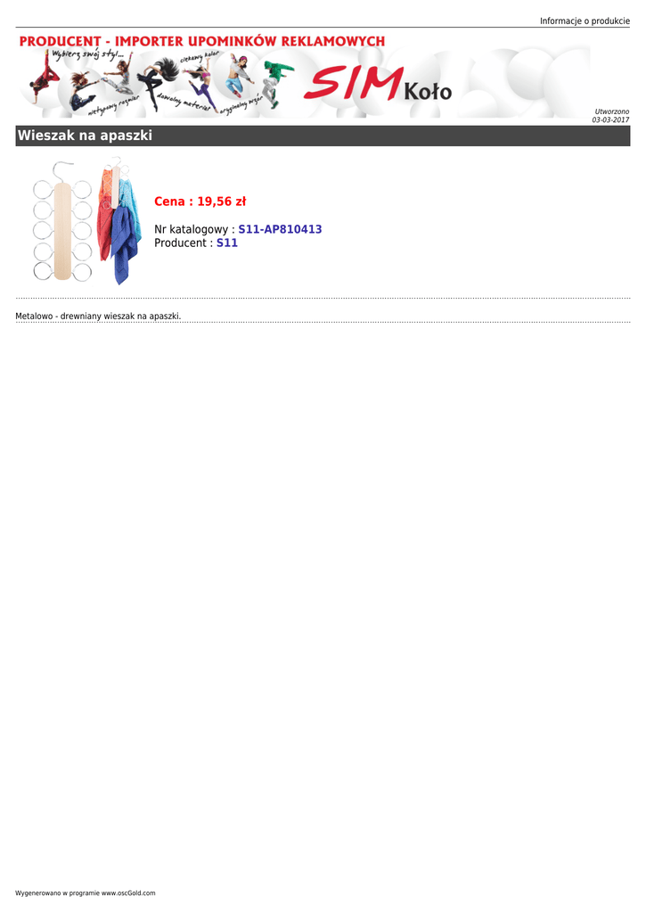 Informacje o produkcie Utworzono 03-03-2017 Wieszak na apaszki Cena : 19,56 zł Nr katalogowy : S11-AP810413 Producent : S11 Metalowo - drewniany wieszak na apaszki. Wygenerowano w programie www.oscGold.com
