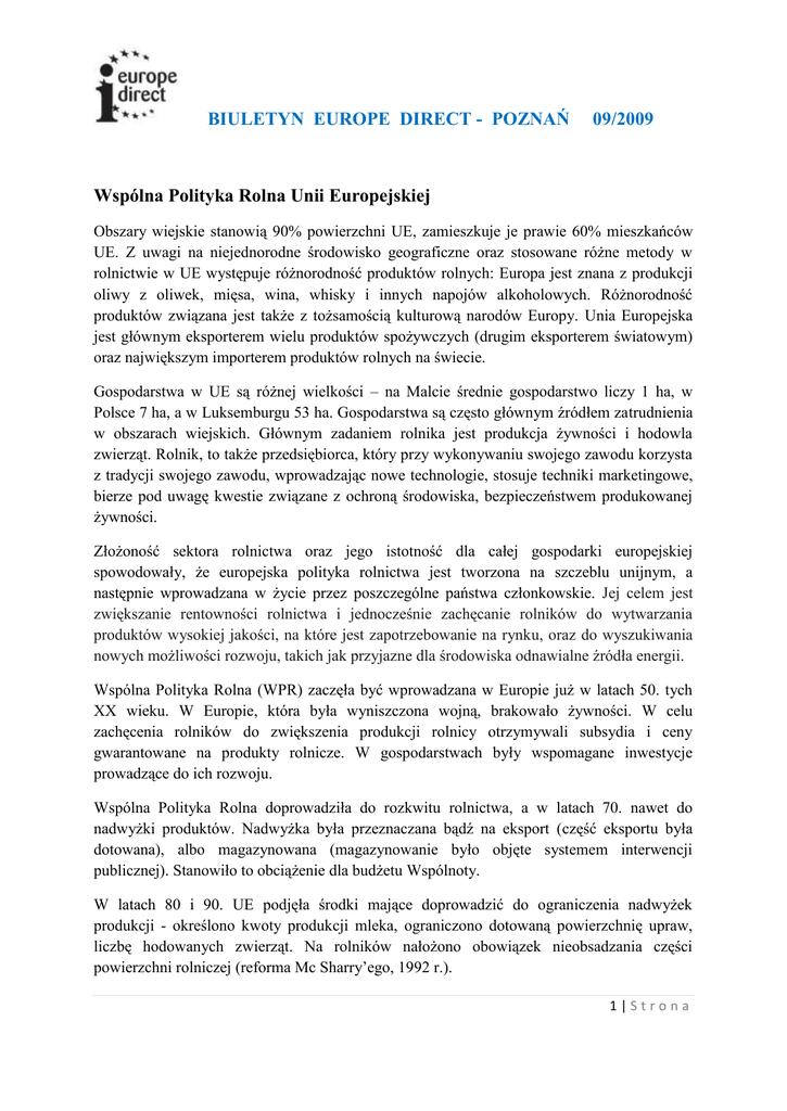 BIULETYN EUROPE DIRECT - POZNAŃ 09/2009 Wspólna Polityka Rolna Unii Europejskiej Obszary wiejskie stanowią 90% powierzchni UE, zamieszkuje je prawie 60% mieszkańców UE. Z uwagi na niejednorodne środowisko geograficzne oraz stosowane różne metody w rolnictwie w UE występuje różnorodność produktów rolnych: Europa jest znana z produkcji oliwy z oliwek, mięsa, wina, whisky i innych napojów alkoholowych. Różnorodność produktów związana jest także z tożsamością kulturową narodów Europy. Unia Europejska jest głównym eksporterem wielu produktów spożywczych (drugim eksporterem światowym) oraz największym importerem produktów rolnych na świecie. Gospodarstwa w UE są różnej wielkości – na Malcie średnie gospodarstwo liczy 1 ha, w Polsce 7 ha, a w Luksemburgu 53 ha. Gospodarstwa są często głównym źródłem zatrudnienia w obszarach wiejskich. Głównym zadaniem rolnika jest produkcja żywności i hodowla zwierząt. Rolnik, to także przedsiębiorca, który przy wykonywaniu swojego zawodu korzysta z tradycji swojego zawodu, wprowadzając nowe technologie, stosuje techniki marketingowe, bierze pod uwagę kwestie związane z ochroną środowiska, bezpieczeństwem produkowanej żywności. Złożoność sektora rolnictwa oraz jego istotność dla całej gospodarki europejskiej spowodowały, że europejska polityka rolnictwa jest tworzona na szczeblu unijnym, a następnie wprowadzana w życie przez poszczególne państwa członkowskie. Jej celem jest zwiększanie rentowności rolnictwa i jednocześnie zachęcanie rolników do wytwarzania produktów wysokiej jakości, na które jest zapotrzebowanie na rynku, oraz do wyszukiwania nowych możliwości rozwoju, takich jak przyjazne dla środowiska odnawialne źródła energii. Wspólna Polityka Rolna (WPR) zaczęła być wprowadzana w Europie już w latach 50. tych XX wieku. W Europie, która była wyniszczona wojną, brakowało żywności. W celu zachęcenia rolników do zwiększenia produkcji rolnicy otrzymywali subsydia i ceny gwarantowane na produkty rolnicze. W gospodarstwach były wspomagane inwestycje prowadzące do ich rozwoju. Wspólna Polityka Rolna doprowadziła do rozkwitu rolnictwa, a w latach 70. nawet do nadwyżki produktów. Nadwyżka była przeznaczana bądź na eksport (część eksportu była dotowana), albo magazynowana (magazynowanie było objęte systemem interwencji publicznej). Stanowiło to obciążenie dla budżetu Wspólnoty. W latach 80 i 90. UE podjęła środki mające doprowadzić do ograniczenia nadwyżek produkcji - określono kwoty produkcji mleka, ograniczono dotowaną powierzchnię upraw, liczbę hodowanych zwierząt. Na rolników nałożono obowiązek nieobsadzania części powierzchni rolniczej (reforma Mc Sharry’ego, 1992 r.). 1|Strona BIULETYN EUROPE DIRECT - POZNAŃ 09/2009 Kolejne zmiany nastąpiły w ramach Agendy 2000 : Unia zredukowała wsparcie cenowe, w wyniku czego nastąpił dalszy postęp liberalizacji zasad handlu, wprowadziła zmiany w programowaniu funduszy strukturalnych. Reforma WPR w 2003 roku polegała przede wszystkim na znacznym uniezależnieniu płatności bezpośrednich od struktury i wielkości produkcji rolnej. Wcześniej im więcej rolnik produkował, tym większe otrzymywał dotacje. Wg nowych zasad rolnik otrzymywał płatności bezpośrednie w zależności od powierzchni roli uprawnej, przestrzegając praw ochrony środowiska, bezpiecznej żywności oraz zdrowia zwierząt (zasada cross-compliance). Zasady te ściśle wiążą się Wprowadzono także dopłaty do upraw roślin energetycznych. Celem dopłat było zwiększenie produkcji roślin energetycznych oraz energii cieplnej uzyskiwanej z biomasy. W latach 2008-2009 zmiany w WPR polegały m. in. na wprowadzeniu (na wniosek Polski) dodatkowej płatności bezpośredniej dla producentów owoców miękkich przeznaczonych dla przetwórstwa (po akcesji 12 państw do UE, Europa stałą się producentem owoców i warzyw). Inne zmiany to pomoc dla sektora ogrodnictwa w czasie kryzysów na rynku, promocja konsumpcji owoców i warzyw, zachęcenie Europejczyków do lepszego odżywiania. W Europie winnice zajmują 50% ogólnej powierzchni wszystkich winnic, Europa jest największym producentem win (60% produkcji) oraz konsumentem (60% światowej konsumpcji) i największym eksporterem i importerem. Stąd Unia Europejska zainteresowana jest także rynkiem wina. W obliczu coraz silniejszej konkurencji win produkowanych w Australii, RPA i Ameryce Południowej i następujących nadwyżek win wytworzonych w Europie, UE została zmuszona do wprowadzenia reform na rynku wina i stosowania środków, które doprowadzą do wzrostu konkurencyjności europejskich producentów wina. Na restrukturyzację winnic (unowocześnienie produkcji, poprawę jakości i zorientowanie na rynek, wprowadzenie nowych odmian winorośli, promowanie win na rynkach eksportu) producenci win będą otrzymywać środki finansowe. Część winnic (175 000 ha) musi zostać wykarczowana. W tej chwili konsumenci europejscy i światowi są zainteresowani żywnością o wysokiej jakości. Przywiązują dużą wagę do żywności tradycyjnej, chcą znać kraj pochodzenia oraz cechy artykułów. Już w latach 80. wprowadzono system oznaczania jakości win, następnie oliwy z oliwek oraz owoców i warzyw. Wprowadzono także trzy loga jakości dla tradycyjnych produktów – "Chronioną Nazwę Pochodzenia" dla produktów wykazujących się cechami, które są typowe jedynie dla obszaru jego produkcji i ukazujących umiejętności producentów dla tego obszaru, "Chronione Oznaczenie Geograficzne" dla produktów posiadających szczególne cechy wiążące go z konkretnym obszarem, gdy przynajmniej jeden z etapów produkcji ma miejsce na tym obszarze, oraz logo GTS – „Gwarantowana 2|Strona BIULETYN EUROPE DIRECT - POZNAŃ 09/2009 Tradycyjna Specjalność”, dla towarów, które posiadają tradycyjny charakter, czy to ze względu na skład, czy też sp