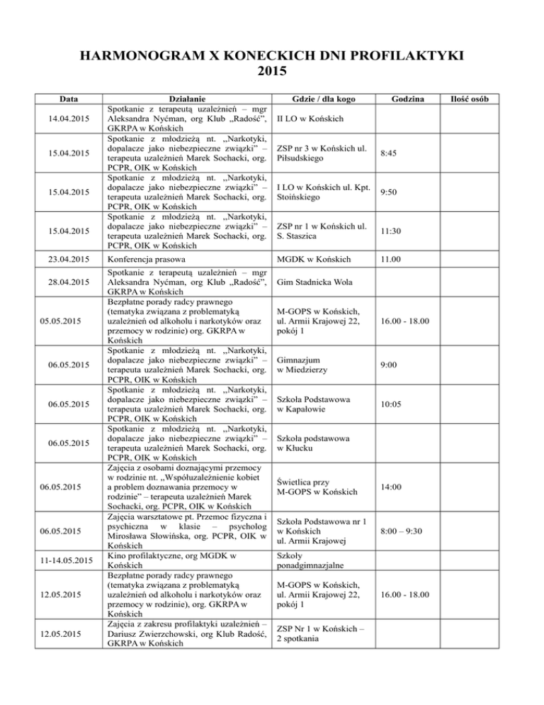 HARMONOGRAM X KONECKICH DNI PROFILAKTYKI 2015 Data 14.04.2015 15.04.2015 15.04.2015 15.04.2015 23.04.2015 28.04.2015 05.05.2015 06.05.2015 06.05.2015 06.05.2015 06.05.2015 06.05.2015 11-14.05.2015 12.05.2015 12.05.2015 Działanie Spotkanie z terapeutą uzależnień – mgr Aleksandra Nyćman, org Klub „Radość”, GKRPA w Końskich Spotkanie z młodzieżą nt. ,,Narkotyki, dopalacze jako niebezpieczne związki” – terapeuta uzależnień Marek Sochacki, org. PCPR, OIK w Końskich Spotkanie z młodzieżą nt. ,,Narkotyki, dopalacze jako niebezpieczne związki” – terapeuta uzależnień Marek Sochacki, org. PCPR, OIK w Końskich Spotkanie z młodzieżą nt. ,,Narkotyki, dopalacze jako niebezpieczne związki” – terapeuta uzależnień Marek Sochacki, org. PCPR, OIK w Końskich Konferencja prasowa Spotkanie z terapeutą uzależnień – mgr Aleksandra Nyćman, org Klub „Radość”, GKRPA w Końskich Bezpłatne porady radcy prawnego (tematyka związana z problematyką uzależnień od alkoholu i narkotyków oraz przemocy w rodzinie) org. GKRPA w Końskich Spotkanie z młodzieżą nt. ,,Narkotyki, dopalacze jako niebezpieczne związki” – terapeuta uzależnień Marek Sochacki, org. PCPR, OIK w Końskich Spotkanie z młodzieżą nt. ,,Narkotyki, dopalacze jako niebezpieczne związki” – terapeuta uzależnień Marek Sochacki, org. PCPR, OIK w Końskich Spotkanie z młodzieżą nt. ,,Narkotyki, dopalacze jako niebezpieczne związki” – terapeuta uzależnień Marek Sochacki, org. PCPR, OIK w Końskich Zajęcia z osobami doznającymi przemocy w rodzinie nt. ,,Współuzależnienie kobiet a problem doznawania przemocy w rodzinie” – terapeuta uzależnień Marek Sochacki, org. PCPR, OIK w Końskich Zajęcia warsztatowe pt. Przemoc fizyczna i psychiczna w klasie – psycholog Mirosława Słowińska, org. PCPR, OIK w Końskich Kino profilaktyczne, org MGDK w Końskich Bezpłatne porady radcy prawnego (tematyka związana z problematyką uzależnień od alkoholu i narkotyków oraz przemocy w rodzinie), org. GKRPA w Końskich Zajęcia z zakresu profilaktyki uzależnień – Dariusz Zwierzchowski, org Klub Radość, GKRPA w Końskich Gdzie / dla kogo Godzina II LO w Końskich ZSP nr 3 w Końskich ul. Piłsudskiego 8:45 I LO w Końskich ul. Kpt. Stoińskiego 9:50 ZSP nr 1 w Końskich ul. S. Staszica 11:30 MGDK w Końskich 11.00 Gim Stadnicka Wola M-GOPS w Końskich, ul. Armii Krajowej 22, pokój 1 16.00 - 18.00 Gimnazjum w Miedzierzy 9:00 Szkoła Podstawowa w Kapałowie 10:05 Szkoła podstawowa w Kłucku Świetlica przy M-GOPS w Końskich 14:00 Szkoła Podstawowa nr 1 w Końskich ul. Armii Krajowej 8:00 – 9:30 Szkoły ponadgimnazjalne M-GOPS w Końskich, ul. Armii Krajowej 22, pokój 1 ZSP Nr 1 w Końskich – 2 spotkania 16.00 - 18.00 Ilość osób 12.05.2015 12.05.2015 15.05.2015 15.05.2015 15.05.2015 15.05.2015 15.05.2015 15.05.2015 16/17.05.2015 18.05.2015 18.05.2015 18.05.2015 18.05.2015 19.05.2015 19.05.2015 19.05.2015 19.05.2015 19.05.2015 19.05.2015 19.05.2015 20.05.2015 22.05.2015 Spotkanie z terapeutą – ks. Dariuszem Jarlińskim Spotkanie z terapeutą – ks. Dariuszem Jarlińskim Profilaktyka antytytoniowa pogram „Znajdź właściwe rozwiązanie”, obchody Światowego Dnia bez Tytoniu, org. PSSE Końskie Zajęcia warsztatowe pt. Przemoc fizyczna i psychiczna w klasie – psycholog Mirosława Słowińska, org. PCPR, OIK w Końskich Zajęcia nt. Narkotyki, dopalacze – odpowiedzialność prawna – prawnik Sylwester Ślusarczyk, org. PCPR, OIK w Końskich Zajęcia nt. Narkotyki, dopalacze – odpowiedzialność prawna – prawnik Sylwester Ślusarczyk, org. PCPR, OIK w Końskich Zajęcia nt. Narkotyki, dopalacze – odpowiedzialność prawna – prawnik Sylwester Ślusarczyk, org. PCPR, OIK w Końskich Punkt konsultacyjny w PPP Noc Muzeów, org Zabytkowy Zakład Hutniczy w Maleńcu Teatralny spektakl edukacyjnoprofilaktyczny dla uczniów, org. przez Stowarzyszenie "Spinacz", GKRPA w Końskich (2 realizacje) Profilaktyka HIV/AIDS, org PSSE Końskie, GKRPA w Końskich Profilaktyka HIV/AIDS, org PSSE Końskie, GKRPA w Końskich Profilaktyka HIV/AIDS, org PSSE Końskie, GKRPA w Końskich Profilaktyka HIV/AIDS, org PSSE Końskie, GKRPA w Końskich Profilaktyka HIV/AIDS, org PSSE Końskie, GKRPA w Końskich Profilaktyka HIV/AIDS, org PSSE Końskie, GKRPA w Końskich Bezpłatne porady radcy prawnego (tematyka związana z problematyką uzależnień od alkoholu i narkotyków oraz przemocy w rodzinie), org GKRPA w Końskich „Dlaczego NIE mówimy” Piotr Nagiel, org Klub Radość, GKRPA w Końskich „Dlaczego NIE mówimy” Piotr Nagiel, org Klub Radość, GKRPA w Końskich Konferencja „Mediacje skuteczną metodą rozwiązywania konfliktów w rodzinie”, org Zespół Interdyscyplinarny Warsztaty dla nauczycieli „Aspekty przemocy” org Klub Radość, GKRPA w Końskich Polska Biega, ZSP Nr 1 w Końskich, GKRPA w Końskich Szkoła „Uniwerek” 10.00 ZSP Nr 2 11.30 Gimnazjum Nr 1 9.50 Szkoła Podstawowa w Dziebałtowie 11:50 Szkoła ,,AWANS” w Końskich ul. Towarowa 9:30 ZSP nr 3 w Końskich ul. Piłsudskiego 10:30 Gimnazjum nr 1 w Końskich ul. Armii Krajowej 8.00 PPP Otwarty dla każdego 13.00-15.00 SP Nr 1 w Końskich SP w Nieświniu od godz. 9.00 II LO 8.00 Szkoły AWANS 9.50 ZSP Nr 3 11.30 ZSP Nr 1 8.00 ZSP Nr 2 10.00 I LO 12.00 M-GOPS w Końskich, ul. Armii Krajowej 22, pokój 1 16.00 - 18.00 Gimnazjum Nr 1 w Końskich II LO 2 w Końskich MGDK w Końskich 9:30 Świetlica Klubu Radość, ul. Partyzantów 3 ZSP Nr 1 11.30 21.05.2015 21-22. 05.2015 22.05.2015 22.05.2015 22.05.2015 26.05.2015 26.05.2015 26.05.2015 27.05.2015 28.05.2015 29.05.2015 29.05.2015 Profilaktyka antytytoniowa pogram „Znajdź właściwe rozwiązanie”, obchody Światowego Dnia bez Tytoniu, org. PSSE Końskie Dni Otwarte Świetlic Środowiskowych możliwość skorzystania z komputerów/internetu, gry i zabawy świetlicowe, zawody sportowe na Orliku ul. A.K. (zajęcia połączone z profilak