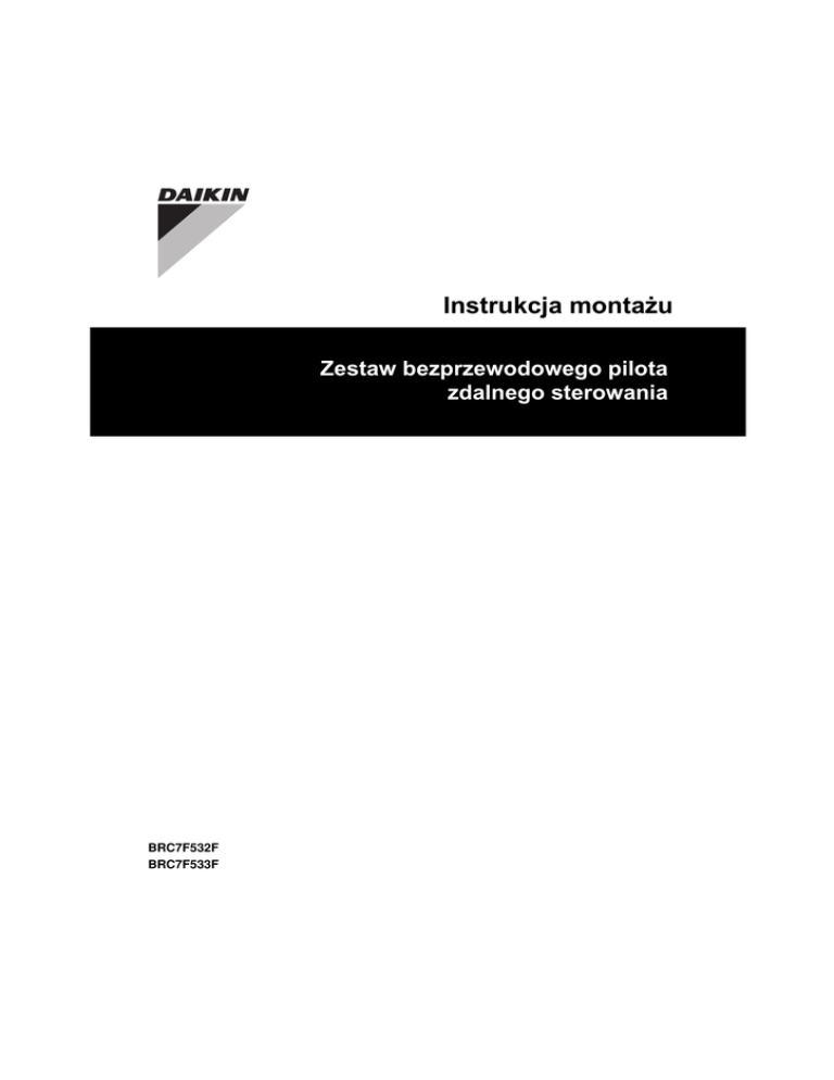 Instrukcja montażu Zestaw bezprzewodowego pilota zdalnego sterowania BRC7F532F BRC7F533F 1 1 2 1x 1x 3 1x 4 2x 5 2x 6 2x 7 1x 8 1x 9 1x 2 2 2 1 1 1 10 2x 3 3 3 1 2 X24A (BLK) 2 7 6 5 4 1 8 9 3 3 2 2 3 ON 4 OFF TEMP TIME A SETTING ON 3 UP FAN TEMP TIME A B DOWN B RESERVE CANCEL C TIMER 6 SETTING 2 3 4 UP FAN 2 1 OFF DOWN 4 RESERVE CANCEL 4 MODE C TIMER D MODE SWING 5 4 2 3 5 SWING 1 /TEST /TEST 5 3 1,6 2 4 5 1 5 2 3 6 8 7 3 6 BRC7F532F BRC7F533F Zestaw bezprzewodowego pilota zdalnego sterowania Spis treści Strona Uwagi na temat bezpieczeństwa ....................................1 Przed przystąpieniem do montażu .................................1 W sekcjach oznaczonych symbolem UWAGA zamieszczono instrukcje dotyczące poprawnej obsługi urządzenia. Akcesoria...................................................................... 1 Uwaga skierowana do montera .................................... 1 ■ Należy również zapoznać się z treścią instrukcji montażu dostarczanej wraz z urządzeniem wewnętrznym oraz instrukcji montażu dostarczanej wraz z panelem ozdobnym. ■ Istnieje tylko 1 położenie montażowe tego zestawu w panelu ozdobnym. Z tego względu zaleca się, aby przed przystąpieniem do montażu zestawu sprawdzić orientację panelu ozdobnego. • Upewnij się, że nic nie zakłóca działania bezprzewodowego pilota zdalnego sterowania. • Upewnij się, że sygnał z pilota zdalnego sterowania może być nadawany. • Upewnij się, że lampka pracy oraz inne lampki wskaźników są dobrze widoczne. • W pobliżu odbiornika nie mogą znajdować się źródła światła ani lampy fluorescencyjne. • Odbiornik nie może być też narażony na bezpośrednie działanie promieni słonecznych. Instalacja pilota zdalnego sterowania.............................2 Instalowanie bezprzewodowego pilota zdalnego sterowania .................................................................... 2 Określanie adresu i pilota GŁÓWNEGO/ PODRZĘDNEGO ......................................................... 2 Procedura konfiguracji.................................................. 2 Montaż płyty nadajnika ................................................. 3 Montaż panelu ozdobnego ........................................... 4 Montaż odbiornika ........................................................ 4 Konfiguracja w miejscu instalacji ....................................4 Testowanie .....................................................................5 PRZED PRZYSTĄPIENIEM DO ROZRUCHU URZĄDZENIA NALEŻY DOKŁADNIE ZAPOZNAĆ SIĘ Z NINIEJSZĄ INSTRUKCJĄ. INSTRUKCJI NIE NALEŻY WYRZUCAĆ. POWINNA ONA ZNALEŹĆ SIĘ W ARCHIWUM, ABY MOŻNA Z NIEJ BYŁO KORZYSTAĆ W PRZYSZŁOŚCI. NIEPRAWIDŁOWY MONTAŻ LUB PODŁĄCZENIE URZĄDZENIA I AKCESORIÓW MOŻE SPOWODOWAĆ PORAŻENIE PRĄDEM ELEKTRYCZNYM, ZWARCIA, WYCIEKI, POŻAR LUB INNE USZKODZENIA SPRZĘTU. NALEŻY STOSOWAĆ WYŁĄCZNIE AKCESORIA FIRMY DAIKIN, ZAPROJEKTOWANE SPECJALNIE Z MYŚLĄ O WYKORZYSTANIU Z OPISYWANYMI URZĄDZENIAMI; AKCESORIA POWINNY BYĆ INSTALOWANE PRZEZ OSOBĘ WYKWALIFIKOWANĄ. W PRZYPADKU WĄTPLIWOŚCI CO DO PROCEDURY MONTAŻU LUB EKSPLOATACJI, NALEŻY ZAWSZE ZWRACAĆ SIĘ DO DEALERA FIRMY DAIKIN. Uwagi na temat bezpieczeństwa Przed przystąpieniem do montażu należy dokładnie zapoznać się z niniejszymi "Uwagami na temat bezpieczeństwa". Urządzenie musi być zamontowane prawidłowo. Po zakończeniu montażu należy upewnić się, że urządzenie podczas rozruchu funkcjonuje prawidłowo. Należy także udzielić klientowi instrukcji dotyczących prawidłowej obsługi i konserwacji urządzenia. Znaczenie symboli przestróg Nieprzestrzeganie tych instrukcji może spowodować uszkodzenie mienia lub obrażenia ciała. BRC7F532+533F Zestaw bezprzewodowego pilota zdalnego sterowania Instrukcja montażu Przed przystąpieniem do montażu Akcesoria Patrz rysunek 1. Należy sprawdzić, czy do zestawu dołączone są następujące akcesoria. 1 Odbiornik 2 Bezprzewodowy pilot zdalnego sterowania 3 Uchwyt do pilota zdalnego sterowania 4 Śruba do instalacji pilota zdalnego sterowania 5 Baterie alkaliczne typu AAA.LR03 6 Wkręt samogwintujący do mocowania płyty nadajnika Zacisk Płyta nadajnika Etykieta z numerem urządzenia Instrukcja montażu Instrukcja obsługi 7 8 9 10 Uwaga skierowana do montera Należy koniecznie poinstruować użytkownika na temat zasad prawidłowej obsługi systemu i pokazać mu dołączoną instrukcję obsługi. Instrukcja montażu 4PW29215-3B 1 Instalacja pilota zdalnego sterowania Procedura konfiguracji Instalowanie bezprzewodowego zdalnego sterowania Nastawa odbiornika pilota Należy ustawić przełącznik adresu pilota bezprzewodowego (SS2) na płycie nadajnika zgodnie z informacjami podanymi w tabeli poniżej. Numer urządzenia 1 2 3 1 1 2 2 2 3 3 3 Przełącznik adresu pilota bezprzewodowego (SS2) 1 ■ Nie należy dopuszczać do upadku pilota ani narażać go na silne wstrząsy. Pilota zdalnego sterowania nie należy przechowywać w miejscu wilgotnym ani wystawionym na bezpośrednie promieniowanie słoneczne. ■ Podczas obsługi urządzenia część pilota z nadajnikiem należy skierować w stronę odbiornika. ■ Zasięg bezpośredni pilota wynosi około 7 metrów. ■ Sygnał nie jest przesyłany, jeśli jakiś obiekt, np. zasłony, znajduje się na drodze od pilota do odbiornika. Mocowanie do ściany lub słupa 1 Zamocuj uchwyt na pilota za pomocą dołączonych śrub. 2 Wsuń pilota w uchwyt od góry. W przypadku używania przewodowego oraz bezprzewodowego pilota z tym samym urządzeniem wewnętrznym pilot przewodowy powinien być ustawiony jako GŁÓWNY. Ustawić przełącznik (Główny/podrzędny) adresu pilota bezprzewodowego (SS1) na płycie nadajnika w pozycji "SUB" (Podrzędny). (2) PODRZĘDNY GŁÓWNY M S M Przełącznik pilota główny/podrzędny (SS1) S (1) Jak wkładać baterie 1 Otwórz schowek na baterie w tylnej części pilota, przesuwając pokrywę w kierunku oznaczony