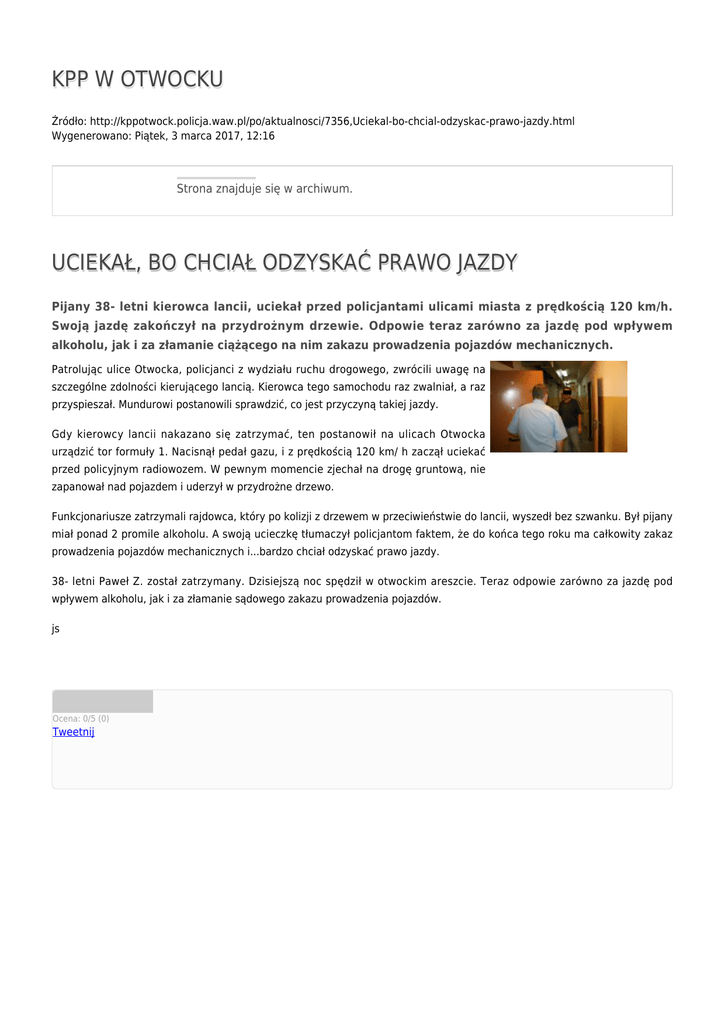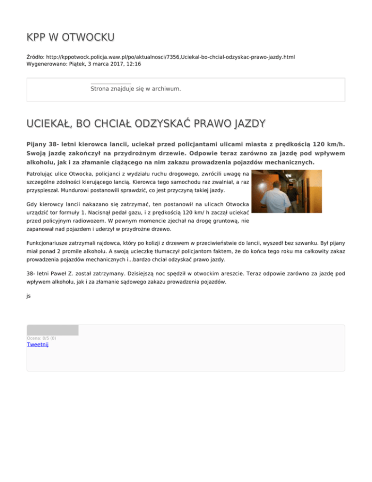 KPP W OTWOCKU Źródło: http://kppotwock.policja.waw.pl/po/aktualnosci/7356,Uciekal-bo-chcial-odzyskac-prawo-jazdy.html Wygenerowano: Piątek, 3 marca 2017, 12:16 Strona znajduje się w archiwum. UCIEKAŁ, BO CHCIAŁ ODZYSKAĆ PRAWO JAZDY Pijany 38- letni kierowca lancii, uciekał przed policjantami ulicami miasta z prędkością 120 km/h. Swoją jazdę zakończył na przydrożnym drzewie. Odpowie teraz zarówno za jazdę pod wpływem alkoholu, jak i za złamanie ciążącego na nim zakazu prowadzenia pojazdów mechanicznych. Patrolując ulice Otwocka, policjanci z wydziału ruchu drogowego, zwrócili uwagę na szczególne zdolności kierującego lancią. Kierowca tego samochodu raz zwalniał, a raz przyspieszał. Mundurowi postanowili sprawdzić, co jest przyczyną takiej jazdy. Gdy kierowcy lancii nakazano się zatrzymać, ten postanowił na ulicach Otwocka urządzić tor formuły 1. Nacisnął pedał gazu, i z prędkością 120 km/ h zaczął uciekać przed policyjnym radiowozem. W pewnym momencie zjechał na drogę gruntową, nie zapanował nad pojazdem i uderzył w przydrożne drzewo. Funkcjonariusze zatrzymali rajdowca, który po kolizji z drzewem w przeciwieństwie do lancii, wyszedł bez szwanku. Był pijany miał ponad 2 promile alkoholu. A swoją ucieczkę tłumaczył policjantom faktem, że do końca tego roku ma całkowity zakaz prowadzenia pojazdów mechanicznych i...bardzo chciał odzyskać prawo jazdy. 38- letni Paweł Z. został zatrzymany. Dzisiejszą noc spędził w otwockim areszcie. Teraz odpowie zarówno za jazdę pod wpływem alkoholu, jak i za złamanie sądowego zakazu prowadzenia pojazdów. js Ocena: 0/5 (0) Tweetnij