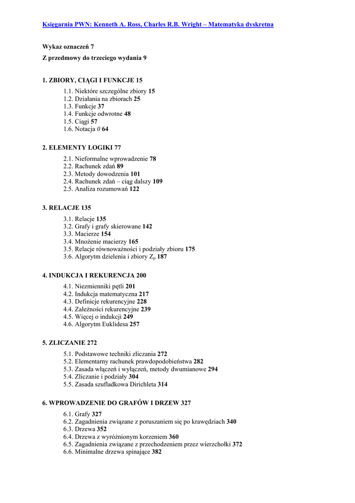 Księgarnia PWN: Kenneth A. Ross, Charles R.B. Wright – Matematyka dyskretna Wykaz oznaczeń 7 Z przedmowy do trzeciego wydania 9 1. ZBIORY, CIĄGI I FUNKCJE 15 1.1. Niektóre szczególne zbiory 15 1.2. Działania na zbiorach 25 1.3. Funkcje 37 1.4. Funkcje odwrotne 48 1.5. Ciągi 57 1.6. Notacja 0 64 2. ELEMENTY LOGIKI 77 2.1. Nieformalne wprowadzenie 78 2.2. Rachunek zdań 89 2.3. Metody dowodzenia 101 2.4. Rachunek zdań – ciąg dalszy 109 2.5. Analiza rozumowań 122 3. RELACJE 135 3.1. Relacje 135 3.2. Grafy i grafy skierowane 142 3.3. Macierze 154 3.4. Mnożenie macierzy 165 3.5. Relacje równoważności i podziały zbioru 175 3.6. Algorytm dzielenia i zbiory Zp 187 4. INDUKCJA I REKURENCJA 200 4.1. Niezmienniki pętli 201 4.2. Indukcja matematyczna 217 4.3. Definicje rekurencyjne 228 4.4. Zależności rekurencyjne 239 4.5. Więcej o indukcji 249 4.6. Algorytm Euklidesa 257 5. ZLICZANIE 272 5.1. Podstawowe techniki zliczania 272 5.2. Elementarny rachunek prawdopodobieństwa 282 5.3. Zasada włączeń i wyłączeń, metody dwumianowe 294 5.4. Zliczanie i podziały 304 5.5. Zasada szufladkowa Dirichleta 314 6. WPROWADZENIE DO GRAFÓW I DRZEW 327 6.1. Grafy 327 6.2. Zagadnienia związane z poruszaniem się po krawędziach 340 6.3. Drzewa 352 6.4. Drzewa z wyróżnionym korzeniem 360 6.5. Zagadnienia związane z przechodzeniem przez wierzchołki 372 6.6. Minimalne drzewa spinające 382 7. REKURENCJA, DRZEWA I ALGORYTMY 398 7.1 .Ogólna postać definicji rekurencyjnych i dowodów indukcyjnych 398 7.2. Algorytmy rekurencyjne 413 7.3. Algorytmy przeszukiwania w głąb 427 7.4. Notacja polska 449 7.5. Drzewa z wagami 459 8. GRAFY SKIEROWANE 477 8.1. Grafy skierowane 477 8.2. Grafy skierowane z wagami 490 8.3. Algorytmy na grafach skierowanych 503 8.4. Modyfikacje i zastosowania algorytmów na grafach skierowanych 517 9. RACHUNEK PRAWDOPODOBIEŃSTWA 527 9.1. Niezależność 527 9.2. Zmienne losowe 542 9.3. Wartość oczekiwana i odchylenie standardowe 556 9.4. Rozkład dwumianowy i inne rozkłady z nim związane 570 10. ALGEBRY BOOLE’A 587 10.1. Algebry Boole’a 587 10.2. Wyrażenia booleowskie 601 10.3. Sieci logiczne 612 10.4. Tablice Karnaugha 624 11. WIĘCEJ O RELACJACH 634 11.1. Zbiory częściowo uporządkowane 634 11.2. Szczególne porządki 650 11.3. Ogólne własności relacji 663 11.4. Domknięcia relacji 675 12. STRUKTURY ALGEBRAICZNE 687 12.1. Permutacje 687 12.2. Działania grup na zbiorach 699 12.3. Działania grup na zbiorach, część 2 708 12.4. Zastosowania działań grup na zbiorach do problemów kolorowania 720 12.5. Grupy 733 12.6. Twierdzenie o izomorfizmie 747 12.7. Półgrupy 760 12.8. Inne systemy algebraiczne 771 13. RACHUNEK PREDYKATÓW I ZBIORY NIESKOŃCZONE 790 13.1. Kwantyfikatory 790 13.2. Elementarny rachunek predykatów 799 13.3. Zbiory nieskończone 809 Odpowiedzi i wskazówki 822 Algorytmy 892 Skorowidz 893