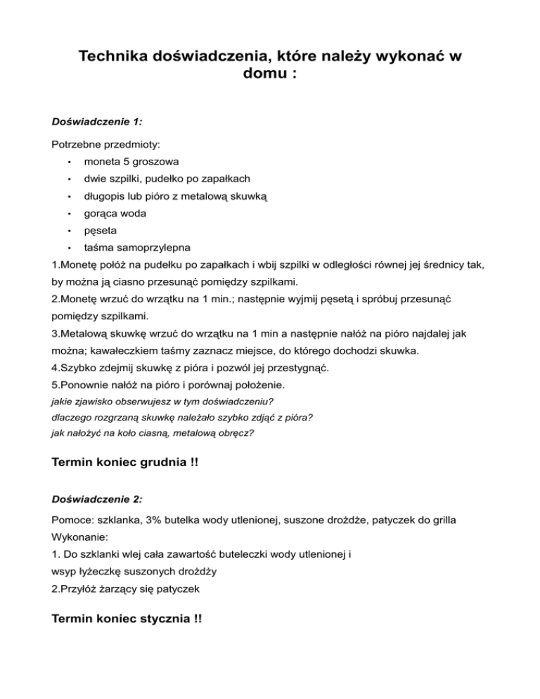 Technika doświadczenia, które należy wykonać w domu : Doświadczenie 1: Potrzebne przedmioty: • moneta 5 groszowa • dwie szpilki, pudełko po zapałkach • długopis lub pióro z metalową skuwką • gorąca woda • pęseta • taśma samoprzylepna 1.Monetę połóż na pudełku po zapałkach i wbij szpilki w odległości równej jej średnicy tak, by można ją ciasno przesunąć pomiędzy szpilkami. 2.Monetę wrzuć do wrzątku na 1 min.; następnie wyjmij pęsetą i spróbuj przesunąć pomiędzy szpilkami. 3.Metalową skuwkę wrzuć do wrzątku na 1 min a następnie nałóż na pióro najdalej jak można; kawałeczkiem taśmy zaznacz miejsce, do którego dochodzi skuwka. 4.Szybko zdejmij skuwkę z pióra i pozwól jej przestygnąć. 5.Ponownie nałóż na pióro i porównaj położenie. jakie zjawisko obserwujesz w tym doświadczeniu? dlaczego rozgrzaną skuwkę należało szybko zdjąć z pióra? jak nałożyć na koło ciasną, metalową obręcz? Termin koniec grudnia !! Doświadczenie 2: Pomoce: szklanka, 3% butelka wody utlenionej, suszone drożdże, patyczek do grilla Wykonanie: 1. Do szklanki wlej cała zawartość buteleczki wody utlenionej i wsyp łyżeczkę suszonych drożdży 2.Przyłóż żarzący się patyczek Termin koniec stycznia !! Doświadczenie 3: Pomoce: jajko, słoik, ocet, woda, butelka z szeroką szyjką Wykonanie: 1. Surowe jajko kurze umieść w słoiczku i zalej octem, mocz 24 h. 2. Ostrożnie wylej ocet ze słoiczka 3. Ostrożnie przepłucz jajko wodą 4. Przenieś jajko do butelki 5. Nalej wody do butelki i mocz jajko kolejne 24 h. Termin koniec marca !! Doświadczenie 4 – OPTYKA: 1.Weź dwie filiżanki (nie przezroczyste) 2.Do jednej włóż monetę, a do drugiej nalej wodę 3.Postaw filiżanki na blacie 4.Nachyl się nad nimi i obniżaj głowę aż do chwili, gdy stracisz monetę z oczu 5. W tej pozycji wlewaj wodę do filiżanki z moneta 6. Zapisz obserwacje i wyjaśnij je naukowo. Zilustruj rysunkiem Termin koniec maja !!