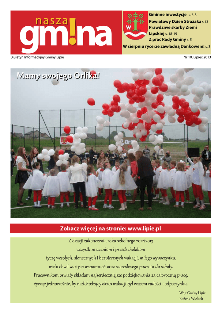 Gminne inwestycje s. 6-8 Powiatowy Dzień Strażaka s.13 Prawdziwe skarby Ziemi Lipskiej s. 18-19 Z prac Rady Gminy s. 5 W sierpniu rycerze zawładną Dankowem! s. 3 Biuletyn Informacyjny Gminy Lipie Nr 10, Lipiec 2013 Mamy swojego Orlika! Zobacz więcej na stronie: www.lipie.pl Z okazji zakończenia roku szkolnego 2012/2013 wszystkim uczniom i przedszkolakom życzę wesołych, słonecznych i bezpiecznych wakacji, miłego wypoczynku, wielu chwil wartych wspomnień oraz szczęśliwego powrotu do szkoły. Pracownikom oświaty składam najserdeczniejsze podziękowania za całoroczną pracę, życząc jednocześnie, by nadchodzący okres wakacji był czasem radości i odpoczynku. Wójt Gminy Lipie Bożena Wieloch W skrócie Twórczy przedszkolak Z dniem 1 września 2013r. gmina Lipie przystępuje do realizacji projektu dofinansowanego ze środków Unii Europejskiej w ramach POKL, Priorytet IX, Poddziałanie 9.1.1, Zmniejszenie nierówności w stopniu upowszechnienia edukacji przedszkolnej, na kwotę 743 360,00 zł. –Cieszę się, że projekt, wychodząc naprzeciw oczekiwaniom wielu rodziców, umożliwi wydłużenie bezpłatnego pobytu wychowanków we wszystkich przedszkolach Gminy Lipie do 8 godzin, zamiast dotychczasowych 5. Będę prosiła Radę Gminy o uchylenie uchwały o odpłatności za pobyt w przedszkolu – mówi Wójt, Bożena Wieloch. Projekt zakłada ponadto wprowadzenie dodatkowych zajęć umuzykalniających, plastycznych, teatralnych oraz z języka angielskiego. Przewidziane są również zajęcia specjalistyczne z logopedą, pedagogiem i psychologiem. Twórcy projektu zaplanowali także cykl warsztatów psychologiczno-pedagogicznych, wspierających rodziców w procesie wychowawczym. Z funduszy „Twórczego przedszkolaka w Gminie Lipie” zostaną zakupione meble dla przedszkoli, 3 tablice interaktywne oraz pomoce do różnorodnych zajęć. Informacji na temat zapisów do uczestnictwa w projekcie udzielą dyrektorzy poszczególnych placówek na początku nowego roku szkolnego. *** Firma PROTONET przygotowuje się obecnie do ostatniego etapu prac monterskich na terenie Gminy Lipie. Prace będą polegały na podłączaniu działek do światłowodowej sieci internetowej. Prace powinny ruszyć w drugiej połowie sierpnia. Aby sfinalizować proces uzbrojenia posesji w przyłącze światłowodowe, usługodawca skontaktuje się z każdym mieszkańcem, który wyraził wolę uzbrojenia swojej działki. Pierwsze zapisy były dokonywane podczas spotkań wiejskich. Dla mieszkańców, którzy nie byli na zebraniach lub później podjęli decyzję, firma przygotowała specjalne formularze rejestracyjne, które są dołączone do niniejszego biuletynu. Wypełniony formularz można przesłać na adres siedziby firmy lub zostawić w Urzędzie Gminy w Lipiu. Zapisać można się także elektronicznie, na formularzu zamieszczonym na stronie usługodawcy: www.protonet.pl lub telefonicznie, dzwoniąc pod numer 695-193-191. Jak informuje przedstawiciel firmy, Marcin Ludyga, każdy, kto chciałby podłączyć się na promocyjnych warunkach, tj. w cenie 1 zł za przyłącze, musi podjąć decyzję i wyrazić wolę podłączenia do końca sierpnia 2013 r. Dodatkowo dla tych, którzy zgłoszą chęć uzbrojenia działki do końca sierpnia firma przygotowała specjalną promocję. Z terenu gmin objętych projektem, czyli Lipia, Opatowa i Krzepic zostanie wylosowanych 1200 osób, które przez 2 lata będą korzystać z internetu bez żadnych opłat abonamentowych. *** Podatek rolny pobierany na terenie Gminy Lipie jest drugim pod względem wielkości dochodem własnym, który 2 Nr 10, Lipiec 2013 zasila nasz gminny budżet. Roczny wymiar podatku szacuje się na kwotę około 438.000,00 zł. Dla porównania koszty oświetlenia ulicznego w 2012 roku wyniosły 475.298,00 zł. *** W obronie pogotowia Prawie 2.000 osób z terenu Gminy Lipie wyraziło stanowczy sprzeciw wobec projektu Wojewódzkiego Planu Działania Sytemu Państwowego Ratownictwa Medycznego, który zakłada m.in. likwidację rejonu operacyjnego w Kłobucku. Podpisy zbierano w kwietniu br. W dniu 17 maja 2013 r. Rada Gminy Lipie podjęła uchwałę, w której wyraziła stanowczy sprzeciw wobec założeń Wojewódzkiego Planu Działania Systemu Państwowego Ratownictwa Medycznego dla Województwa Śląskiego *** Od 1 stycznia do 26 czerwca 2013 r. miały miejsce 42 awarie wodociągowe. Ilość awarii w poszczególnych miejscowościach wynosiła: Albertów – 1, Danków – 4, Julianów – 2, Kleśniska – 2, Lipie – 7, Napoleon – 2, Natolin – 1, Parzymiechy – 11, Troniny – 2, Wapiennik – 2, Zbrojewsko – 1, Zimnowoda – 7. Łączna kwota kosztów, jakie poniosła gmina w związku z usuwaniem awarii wynosi: 34.201,66 zł. Najważniejsze przyczyny awarii to: stary wodociąg, stare przyłącza wodociągowe, brak prądu, wyładowania atmosferyczne, powódź. *** We wszystkich sołectwach gminy zakończyły się zebrania wiejskie, trwały od 10 do 21 czerwca 2013 r. Na zebraniach omawiano wdrożenie przepisów nowej ustawy śmieciowej, sposoby postępowania ze zwierzyną łowną, odbyły się konsultacje w sprawie monitoringu wizyjnego, a przedstawiciel firmy Protonet omówił zasady działania internetu szerokopasmowego. Sołtysi przedstawiali sprawozdanie z działalności rady Sołeckiej za rok 2012r. oraz sprawozdanie z wykonania funduszu sołeckiego za poprzedni rok. Mieszkańcy zgłaszali wstępne propozycje zadań do realizacji w ramach funduszu sołeckiego na rok 2014. Wzorem roku ubiegłego sołtysi otrzymają informacje w zakresie realizacji zgłoszonych na zebraniach wniosków, a pracownicy urzędu wykorzystają je w planie swojej pracy. *** Przeciw przemocy w Gminie Lipie 10 czerwca 2013 r. został rozstrzygnięty konkurs w ramach Programu Osłonowego „Wspieranie jednostek Samorządu Terytorialnego w Tworzeniu Systemu Przeciwdziałania Przemocy w Rodzinie”. Z tego tytułu Gminny Ośrodek Pomocy Społecznej w Lipiu o