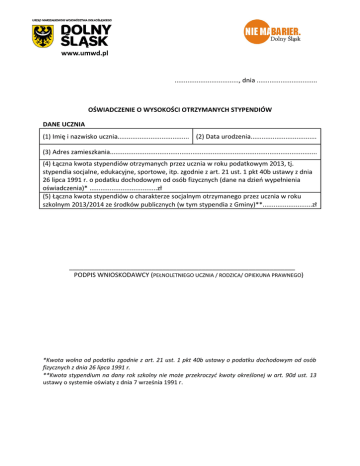 ..................................., dnia ................................. OŚWIADCZENIE O WYSOKOŚCI OTRZYMANYCH STYPENDIÓW DANE UCZNIA (1) Imię i nazwisko ucznia....................................... (2) Data urodzenia.................................... (3) Adres zamieszkania................................................................................................................. (4) Łączna kwota stypendiów otrzymanych przez ucznia w roku podatkowym 2013, tj. stypendia socjalne, edukacyjne, sportowe, itp. zgodnie z art. 21 ust. 1 pkt 40b ustawy z dnia 26 lipca 1991 r. o podatku dochodowym od osób fizycznych (dane na dzień wypełnienia oświadczenia)* .....................................zł (5) Łączna kwota stypendiów o charakterze socjalnym otrzymanego przez ucznia w roku szkolnym 2013/2014 ze środków publicznych (w tym stypendia z Gminy)**...........................zł _______________________________________________________________ PODPIS WNIOSKODAWCY (PEŁNOLETNIEGO UCZNIA / RODZICA/ OPIEKUNA PRAWNEGO) *Kwota wolna od podatku zgodnie z art. 21 ust. 1 pkt 40b ustawy o podatku dochodowym od osób fizycznych z dnia 26 lipca 1991 r. **Kwota stypendium na dany rok szkolny nie może przekroczyć kwoty określonej w art. 90d ust. 13 ustawy o systemie oświaty z dnia 7 września 1991 r.