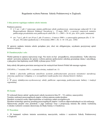 Regulamin wyboru Patrona Szkoły Podstawowej w śeglcach. I Akty prawne regulujące nadanie szkole imienia: Podstawy prawne: § 1 ust. 1 pkt 2 ramowego statutu publicznej szkoły podstawowej, stanowiącego załącznik Nr 2 do Rozporządzenia Ministra Edukacji Narodowej z 21 maja 2001 r. w sprawie ramowych statutów publicznego przedszkola oraz publicznych szkół (Dz. U. z 2001 r. Nr 61, poz. 624 z późn. zmianami) art. 7 ust.1, pkt 8 i art.18 ust.2, pkt 15 ustawy z 8 marca 1990 r. o samorządzie gminnym (Dz. U. Nr 16, poz. 95) (tekst ujednolicony z 16 kwietnia 2004 r. Dz. U. Nr 116, poz. 1203) W sprawie nadania imienia szkole poŜądane jest, choć nie obligatoryjne, uzyskanie pozytywnej opinii kuratora oświaty. II Charakterystyka i cele: Wybór patrona to sprawa najwyŜszej wagi. Nie moŜe on być przypadkowy, nieuzasadniony. Tylko aktywny udział i powaŜne podejście do sprawy wyboru patrona społeczności szkolnej gwarantuje dumę i satysfakcję, z jaką przez lata będziemy nosili IMIĘ wybrane przez NAS! Imię szkoły lub patron powinien nawiązywać do waŜnych kart historii Polski lub naszego regionu. USTAWA z 7 września 1991 r. o systemie oświaty, rozdział I art. 13: 1. Szkoła i placówka publiczna umoŜliwia uczniom podtrzymywanie poczucia toŜsamości narodowej, etnicznej, językowej i religijnej, a w szczególności nauki języka oraz własnej historii i kultury. (…) 4. W pracy dydaktyczno-wychowawczej szkoły publiczne zapewniają podtrzymywanie kultury i tradycji regionalnej. III Zasady: W wyborach bierze udział społeczność szkoły (uczniowie klas IV – VI, rodzice, nauczyciele). Terminy realizacji poszczególnych etapów wyboru patrona ustala dyrektor. Dyrektor wyznacza osoby odpowiedzialne za realizację zadań szczegółowych. Dyrektor kontroluje sprawny przebieg poszczególnych etapów i rozlicza odpowiedzialnych za ich realizację. Opracowany projekt oraz protokoły z jego realizacji wraz z propozycją imienia dla szkoły wyłonioną w drodze wyborów zostanie skierowany do Rady Gminy w Chorkówce. IV Procedura: 1. W kampanii wyboru imienia uczestniczą nauczyciele, rodzice i uczniowie Szkoły Podstawowej w śeglcach. 2. Rada Pedagogiczna, biorąc pod uwagę zgłoszone w określonym czasie przez uczniów, rodziców nauczycieli i mieszkańców kandydatury, dokonuje spośród nich wyboru w głosowaniu tajnym. 3. Wybrany kandydat wraz z pisemnym uzasadnieniem zostaje przedstawiony do akceptacji społeczności szkolnej oraz rodzicom. 4. W kaŜdej klasie na godzinie wychowawczej zostanie zaprezentowana kandydatura oraz uzasadnienie dokonanego wyboru przez RP. 5. Uczniowie w tajnym głosowaniu wyraŜą zgodę na proponowanego patrona lub odrzucą jego kandydaturę, proponując innego. 6. Kampanii poprzedzającej akceptację kandydatury wysuniętej przez RP towarzyszyć będzie akcja informacyjna. 7. W przypadku odrzucenia kandydatury uczniowie klas IV - VI wytypują jednego kandydata, który uzyskał największą ilość głosów w głosowaniu klasowym. 8. Wyniki głosowania w kaŜdej klasie zostaną przekazane RP. Następnie odbędą się wybory, które przeprowadzi Samorząd Uczniowski. Drogą tajnego głosowania wybrany zostanie jeden kandydat, który uzyskał zdecydowaną większość głosów. Zostaje on przedstawiony do akceptacji RP i RR. 9. Podobną procedurę stosuje się w sytuacji odrzucenia przez Radę Rodziców kandydata wybranego przez Radę Pedagogiczną. 10. W przypadku braku dalszej zgody decyzje co do dalszej procedury wyboru patrona podejmuje na wniosek komisji dyrektor. 11. Po przeprowadzeniu głosowania i publicznym ogłoszeniu wyniku wyborów sporządzony zostaje dokument/protokół z kampanii mającej na celu wybranie imienia dla szkoły. Dokument ten zostanie przesłany do Urzędu Gminy w Chorkówce. Będzie on zawierał równieŜ wyczerpującą prezentację sylwetki patrona i uzasadnienie jego wyboru. 12. Po akceptacji kandydata przez urząd Gminy w Chorkówce zostanie opracowany scenariusz uroczystości nadania szkole imienia. Regulamin został uchwalony przez Radę Pedagogiczną 4 lutego 2010 r.