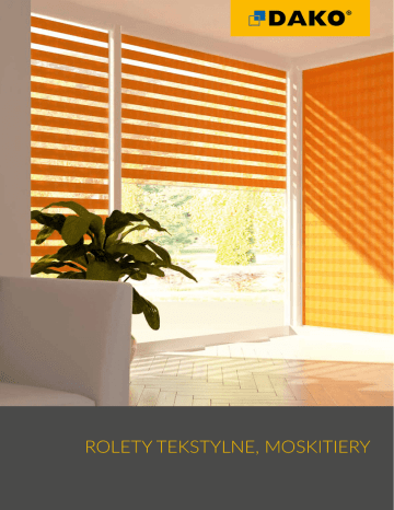 ROLETY TEKSTYLNE, MOSKITIERY CIĄGŁE INNOWACJE od 1994 roku Jakość Innowacje Zaawansowe technologie Profesjonalna sieć Partnerów Handlowych Doświadczenie Międzynarodowy zasięg DAKO to długa historia innowacji, których celem jest zrozumienie potrzeb klienta i dostosowanie się do jego oczekiwań. Od 1994 roku DAKO produkuje wysokiej klasy stolarkę z PVC, drewna, aluminium i stali, nieustannie poszerzając ofertę i dostosowując ją do zmieniających się wymagań klientów. Firma dba o jakość i precyzję wykonania produktów, modernizując proces produkcji wraz z rozwojem nowoczesnych technologii. Systematycznie podnosi kwalifikacje kadry, inwestuje w rozwój przedsiębiorstwa i poszerza działalność o kolejne rynki zagraniczne. Miarą sukcesu DAKO są miliony sprzedanych okien, drzwi, bram i rolet oraz szerokie grono zadowolonych klientów z całego świata. Gdzie jesteśmy? Polska, Niemcy, Włochy, Norwegia, Szwecja, Francja, Belgia, Czechy, Słowacja, Szwajcaria, Luksemburg, Hiszpania, Izrael, Tunezja, Meksyk, Japonia i wiele innych krajów całego globu! 2 3 KOMPLEKSOWA OFERTA ZOBACZ RÓWNIEŻ: Harmonia | wygoda | oszczędności Skorzystanie z pełnego zakresu oferty DAKO umożliwia klientom kompleksowe wyposażenie domu w stolarkę otworową. Ścisła kooperacja technologów i projektantów odpowiedzialnych za poszczególne grupy wyrobów gwarantuje estetyczną harmonię stolarki całego domu. Zapewnia również technologiczną zgodność wszystkich produktów, która jest szczególnie ważna w systemach Inteligentnego Zarządzania Domem. Możliwość wyceny i zakupu wszystkich produktów w jednym punkcie sprzedaży pozwala z kolei na komfortowe i sprawne podejmowanie decyzji, dodatkowo oszczędzając czas i pieniądze. STOLARKA PVC Okna | Drzwi przesuwne | Drzwi zewnętrzne STOLARKA DREWNIANA Okna | Drzwi przesuwne | Drzwi zewnętrzne STOLARKA ALUMINIOWA Okna | Drzwi przesuwne Drzwi zewnętrzne | Konstrukcje | Fasady DRZWI PRZECIWPOŻAROWE I STALOWE SPIS TREŚCI ROLETY TEKSTYLNE 6 Rolety wolnowiszące7 Rolety w kasecie aluminiowej8 Rolety w kasecie PVC9 Kolorystyka10 MOSKITIERY12 ŚWIATOWY ZASIĘG16 FOLDERY DAKO OKNA | DRZWI PRZESUWNE | DRZWI ZEWNĘTRZNE OKNA | DRZWI PRZESUWNE | DRZWI ZEWNĘTRZNE STOLARKA PVC STOLARKA DREWNIANA OKNA | DRZWI PRZESUWNE | DRZWI ZEWNĘTRZNE | ROZWIĄZANIA PRZECIWPOŻAROWE ŚLUSARKA ALUMINIOWA ROLETY ZEWNĘTRZNE SEGMENTOWE | ROLOWANE | DRZWI BOCZNE ROLETY ZEWNĘTRZNE BRAMY GARAŻOWE ROLETY TEKSTYLNE, MOSKITIERY DAKO OTWARTE NA EMOCJE Zobacz markę DAKO na największych wydarzeniach sportowych w Europie HARMONYLINE DRZWI ZEWNĘTRZNE OKNA | ROLETY | DRZWI | BRAMY DRZWI NAKŁADKOWE PVC | DREWNO | ALUMINIUM OKNA | DRZWI | ROLETY | BRAMY PVC | DREWNO | ALUMINIUM www.dako.eu ROLETY TEKSTYLNE 4 5 Rolety tekstylne ROLETY TEKSTYLNE Rolety tekstylne to praktyczne i estetyczne osłony okien, montowane wewnątrz pomieszczeń, zapewniające prywatność oraz podnoszące estetykę każdego wnętrza. Niezwykle szeroka oferta tkanin do rolet tekstylnych, różne możliwości konstrukcyjne, a także kilka wariantów montażu pozwalają na idealne dopasowanie kolorów i wzorów rolet do indywidualnych preferencji użytkowników. ROLETY WOLNOWISZĄCE W systemie rolet wolnowiszących tkanina rolety jest podnoszona i opuszczana poprzez nawijanie na wałek przy pomocy łańcuszka koralikowego. Rolety wolnowiszące nie dają całkowitego zaciemnienia pomieszczenia, ponieważ nie przylegają bezpośrednio do ściany, ani do okna. Poprzez boczne szczeliny część światła przedostaje się do pomieszczenia. DOSTĘPNE SYSTEMY ROLET WOLNOWISZĄCYCH SYSTEM DK-MAJA System DK-MAJA przeznaczony jest do montażu na skrzydłach okiennych o niewielkiej powierzchni, gdy szerokość rolety nie przekracza 170 cm. SYSTEM DK-BLANKA System DK-BLANKA stosowany jest do okien o większych rozmiarach – nawet do 4 m wysokości i 3,2 m szerokości. SYSTEM DK-STELLA System DK-STELLA stosowany jest, gdy szerokość rolety nie przekracza 120 cm. W rolecie DK-STELLA stosowana jest tkanina typu Dzień / Noc. 6 7 Rolety tekstylne ROLETY W KASECIE ALUMINIOWEJ W systemie rolet w kasecie aluminiowej tkanina rolety jest podnoszona i opuszczana w aluminiowych prowadnicach szczelnie przylegających do skrzydła okiennego a następnie nawijana na wałek ukryty w estetycznej kasecie. Dzięki takiej konstrukcji i wykorzystaniu odpowiednich materiałów możemy uzyskać całkowite zaćmienie pomieszczenia. DOSTĘPNE SYSTEMY W KASECIE ALUMINIOWEJ SYSTEM DK-VERA Roleta tekstylna posiadająca kasetę i prowadnice aluminiowe, przeznaczona do okien rozwiernych i uchylnych. Maksymalne rozmiary rolety wynoszą 1700 mm x 2200 mm. SYSTEM DK-LUISA System stosowany jest w oknach o dużych powierzchniach, znajduje zastosowanie w pomieszczeniach biurowych, hotelach oraz salach konferencyjnych. W systemie rolet DK-LUISA istnieje możliwość zamontowania silnika. ROLETY W KASECIE PVC W systemie rolet w kasecie PVC tkanina rolety jest podnoszona i opuszczana poprzez nawijanie na wałek ukryty w estetycznej kasecie PVC. Jest ona prowadzona w wyprodukowanych z PVC prowadnicach które szczelnie przylegają do skrzydła okiennego. Takie rozwiązanie oraz zastosowanie odpowiedniej tkaniny daje możliwość całkowitego zaciemnienia pomieszczenia. DOSTĘPNE SYSTEMY ROLET W KASECIE PVC SYSTEM DK-NINA Roleta tekstylna, wyposażona w kasetę i prowadnice PVC. Kasety i prowadnice dostępne wyłącznie w kolorze białym. Maksymalne wymiary rolety to 1700 mm x 1500 mm. SYSTEM DK-IGA Roleta tekstylna, wyposażona w kasetę PVC i prowadnice PVC. Kaseta i prowadnice dostępne również w kolorach drewnopodobnych. Maksymalne wymiary rolety to 1700 mm x2200 mm. SYSTEMY DK-KLARA I DK-ROMA Roleta tekstylna wyposażona w kasetę i prowadnice PVC. W roletach DK-KLARA i DK-ROMA stosowana jest tkanina typu Dzień / Noc. Maksymalne wymiary rolety DK-KLARA to 1500 mm x 2200 mm, a rolety DK-ROMA 1500 mm x 1500 mm. 8 9 Rolety tekstylne K