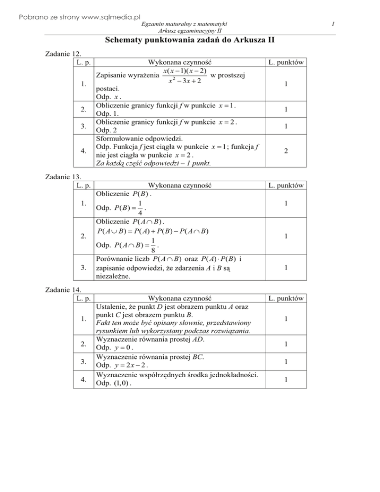 Pobrano ze strony www.sqlmedia.pl Egzamin maturalny z matematyki Arkusz egzaminacyjny II 1 Schematy punktowania zada! do Arkusza II Zadanie 12. L. p. 1. 2. 3. 4. Zadanie 13. L. p. 1. 2. 3. Zadanie 14. L. p. 1. 2. 3. 4. Wykonana czynno!" x ( x " 1)( x " 2) w prostszej Zapisanie wyra#enia x 2 " 3x ! 2 postaci. Odp. x . Obliczenie granicy funkcji f w punkcie x # 1 . Odp. 1. Obliczenie granicy funkcji f w punkcie x # 2 . Odp. 2 Sformu$owanie odpowiedzi. Odp. Funkcja f jest ci%g$a w punkcie x # 1 ; funkcja f nie jest ci%g$a w punkcie x # 2 . Za ka!d" cz#$% odpowiedzi – 1 punkt. L. punktów Wykonana czynno!" Obliczenie P(B ) . 1 Odp. P( B ) # . 4 Obliczenie P( A $ B ) . P( A % B ) # P( A) ! P( B ) " P( A $ B ) 1 Odp. P( A $ B ) # . 8 Porównanie liczb P ( A $ B ) oraz P ( A) & P ( B ) i zapisanie odpowiedzi, #e zdarzenia A i B s% niezale#ne. L. punktów Wykonana czynno!" Ustalenie, #e punkt D jest obrazem punktu A oraz punkt C jest obrazem punktu B. Fakt ten mo!e by% opisany s&ownie, przedstawiony rysunkiem lub wykorzystany podczas rozwi"zania. Wyznaczenie równania prostej AD. Odp. y # 0 . Wyznaczenie równania prostej BC. Odp. y # 2 x " 2 . Wyznaczenie wspó$rz&dnych !rodka jednok$adno!ci. Odp. (1, 0) . L. punktów 1 1 1 2 1 1 1 1 1 1 1 Pobrano ze strony www.sqlmedia.pl Egzamin maturalny z matematyki Arkusz egzaminacyjny II Zadanie 15. L. p. Wykonana czynno!" Naszkicowanie wykresu funkcji f. 1. 2 L. punktów 1 Odp. 2. Wyznaczenie wzoru funkcji f ! g . Odp. ' f ! g ( ' x ( # 2 " x . Naszkicowanie wykresu funkcji f ! g . 3. 1 1 Odp. 4. Wyznaczenie wzoru funkcji h ! f ! g . Odp. 'h ! f ! g ( ' x ( # 2 " x " 2 . Naszkicowanie wykresu funkcji h ! f ! g . 5. 1 1 Odp. Zadanie 16. L. p. 1. 2. 3. Wykonana czynno!" L. punktów Zapisanie liczby wszystkich zdarze' elementarnych za pomoc% symbolu Newtona. 1 * 42 Odp. )) ++ . .5, Obliczenie liczby wszystkich zdarze' elementarnych. 1 Odp. 850668. Zapisanie liczby zdarze' sprzyjaj%cych trafieniu co najmniej 4 spo!ród 5 liczb z wykorzystaniem symbolu Newtona. 1 * 5 -* 37 Odp. )) ++)) ++ ! 1 . . 4 ,. 1 , Pobrano ze strony www.sqlmedia.pl Egzamin maturalny z matematyki Arkusz egzaminacyjny II 4. 5. Obliczenie liczby zdarze' sprzyjaj%cych. Odp. 186. Obliczenie prawdopodobie'stwa trafienia co najmniej 4 spo!ród 5 liczb. 186 / 0,0002186 850668 Odp. 0,00022. 3 1 1 Zadanie 17. L. p. Wykonana czynno!" L. punktów 2 1. Zapisanie równania w postaci 2 sin x " 5 sin x ! 2 # 0 . 1 Zapisanie równania z niewiadom% t # sin x . 2. 1 Odp. 2t 2 " 5t ! 2 # 0 . Wyznaczenie rozwi%za' równania 2t 2 " 5t ! 2 # 0 . 3. 1 1 Odp. t # 2 , t # . 2 4. Zapisanie, #e równanie sin x # 2 nie ma rozwi%za'. 1 Zapisanie rozwi%za' równania 2 cos2 x ! 5 sin x " 4 # 0 . 0 5 Odp. x # ! 2k0 , k 1 C lub x # 0 ! 2k0 , k 1 C . 1 5. 6 6 (Uznajemy te# wynik zapisany w postaci. x # 300 ! k & 3600 , gdzie k 1 C lub x # 1500 ! k & 3600 , gdzie k 1 C ). Zadanie 18. L. p. 1. 2. 3. 4. Zadanie 19. L. p. 1. 2. Wykonana czynno!" Wykonanie polecenia a). 5 Odp. y # . 8 Za podanie wspó&czynnika kierunkowego stycznej lub warto$ci pochodnej funkcji f dla x=0 przyznajemy 1 punkt. Podanie argumentu, dla którego funkcja f osi%ga minimum. Odp. x # 3 . Podanie minimum funkcji f. Odp. f min (3) # "1 . Wykonanie polecenia c). Odp. Najmniejsza warto!" funkcji f jest równa – 1. L. punktów Wykonana czynno!" Wykonanie polecenia zadania. Odp. Równanie nie ma rozwi%za' dla m 1 '" 2, 0 ; L. punktów równanie ma 1 rozwi%zanie dla m 1 '0, ! 2 ( . Po 1 punkcie za ka!dy z rozwa!onych przypadków. Uzasadnienie odpowiedzi. Odp. Funkcja g okre!lona wzorem g ( x ) # f ( x " 1) jest funkcj% ró#nowarto!ciow%. Zbiorem warto!ci 2 1 1 1 2 2 Pobrano ze strony www.sqlmedia.pl Egzamin maturalny z matematyki Arkusz egzaminacyjny II 4 funkcji g jest przedzia$ (0, ! 2) . Po 1 punkcie za ka!dy element uzasadnienia. Zadanie 20. L. p. 1. 2. 3. Wykonana czynno!" L. punktów Sprawdzenie, czy dla n # 1 zachodzi dana równo!". Odp. Lewa strona równo!ci jest równa 2. Prawa 1 3 1 strona jest równa ! # 2 . 2 2 Zapisanie za$o#enia indukcyjnego. 3 1 Odp. 2 ! 5 ! 8 ! ... ! (3k " 1) # k 2 ! k , gdzie k 1 2 2 jest dowoln% ustalon% liczb% naturaln% wi&ksz% lub równ% 1. Zapisanie tezy indukcyjnej. Odp. 1 1 3 2 ! 5 ! 8 ! ... ! (3k " 1) ! (3k ! 2) # ( k ! 1)2 ! ( k ! 1) 2 2 Przeprowadzenie dowodu tezy indukcyjnej. Odp. 3 2 1 k ! k ! (3k ! 2) # 2 2 3 3 1 1 3 1 # k 2 ! 3k ! ! k ! # ( k ! 1) 2 ! ( k ! 1) 2 2 2 2 2 2 4. 2 ! 5 ! 8 ! ... ! (3k " 1) ! (3k ! 2) # 2 5. Sformu$owanie odpowiedzi. Odp. Na mocy zasady indukcji matematycznej dana równo!" jest prawdziwa dla ka#dej liczby ca$kowitej, dodatniej n. 1 Zadanie 21. L. p. Wykonana czynno!" Wykonanie rysunku i wprowadzenie oznacze'. Odp. 1. 2. 3. L. punktów 1 Zapisanie jak% bry$% jest bry$a po obrocie danego trójk%ta. Odp. Powsta$a bry$a jest sto#kiem z wyci&tym sto#kiem o tej samej podstawie. Punkt przyznajemy tak!e je$li zaznaczony jest sto!ek na rysunku. Wyznaczenie d$ugo!ci odcinka AB . Z twierdzenia kosinusów 1 1 Pobrano ze strony www.sqlmedia.pl Egzamin maturalny z matematyki Arkusz egzaminacyjny II 5 2 AB # AC ! BC " 2 AC & BC cos 3ACB . Odp. AB # 7 . 4. Wyznaczenie d$ugo!ci odcinka AD . AD # AC & sin 3ACB 1 Odp. AD # 4 3 . 5. Wyznaczenie d$ugo!ci odcinka CD . CD # AC & cos 3ACB 1 Odp. CD # 4 . 6. 7. Zadanie 22. L. p. Obliczenie obj&to!ci powsta$ej bry$y. 2 2 1 1 V # 0 AD & CD " 0 AD & BD 3 3 Odp. 480 . Obliczenie pola powierzchni ca$kowitej. P # 0 AD & AC ! 0 AD & AB Odp. 60 30 . Je$li wyznaczone zosta&o pole powierzchni bocznej tylko jednego sto!ka przyznajemy 1 punkt. 1 2 Wykonana czynno!" Zapisanie warunku jaki musi spe$nia" niewiadoma x. 7x 8 0 4 Odp. 6 log3 x 8 0 4log x 8 0 5 9 Wyznaczenie dziedziny równania. Odp. x 1 (1, ! 2) . Zapisanie równania w postaci log9 'log9 x (2 # log9 'log3 x ( . Za zastosowanie twierdzenia o zamianie podstaw – 1 punkt. L. punktów 4. Zapisanie równania w postaci 'log9 x (2 " log3 x # 0 . 1 5. Zapisanie równania w postaci 'log9 x (2 " 2 log9 x # 0 . Wyz