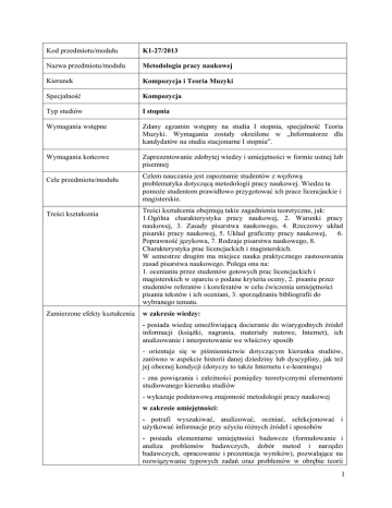 Kod przedmiotu/modułu K1-27/2013 Nazwa przedmiotu/modułu Metodologia pracy naukowej Kierunek Kompozycja i Teoria Muzyki Specjalność Kompozycja Typ studiów I stopnia Wymagania wstępne Zdany egzamin wstępny na studia I stopnia, specjalność Teoria Muzyki. Wymagania zostały określone w „Informatorze dla kandydatów na studia stacjonarne I stopnia”. Wymagania końcowe Zaprezentowanie zdobytej wiedzy i umiejętności w formie ustnej lub pisemnej Cele przedmiotu/modułu Treści kształcenia Zamierzone efekty kształcenia Celem nauczania jest zapoznanie studentów z węzłową problematyka dotyczącą metodologii pracy naukowej. Wiedza ta pomoże studentom prawidłowo przygotować ich prace licencjackie i magisterskie. Treści kształcenia obejmują takie zagadnienia teoretyczne, jak: 1.Ogólna charakterystyka pracy naukowej, 2. Warunki pracy naukowej, 3. Zasady pisarstwa naukowego, 4. Rzeczowy układ pisarski pracy naukowej, 5. Układ graficzny pracy naukowej, 6. Poprawność językowa, 7. Rodzaje pisarstwa naukowego, 8. Charakterystyka prac licencjackich i magisterskich. W semestrze drugim ma miejsce nauka praktycznego zastosowania zasad pisarstwa naukowego. Polega ona na: 1. ocenianiu przez studentów gotowych prac licencjackich i magisterskich w oparciu o podane kryteria oceny, 2. pisaniu przez studentów referatów i koreferatów w celu ćwiczenia umiejętności pisania tekstów i ich oceniani, 3. sporządzaniu bibliografii do wybranego tematu. w zakresie wiedzy: - posiada wiedzę umożliwiającą docieranie do wiarygodnych źródeł informacji (książki, nagrania, materiały nutowe, Internet), ich analizowanie i interpretowanie we właściwy sposób - orientuje się w piśmiennictwie dotyczącym kierunku studiów, zarówno w aspekcie historii danej dziedziny lub dyscypliny, jak też jej obecnej kondycji (dotyczy to także Internetu i e-learningu) - zna powiązania i zależności pomiędzy teoretycznymi elementami studiowanego kierunku studiów - wykazuje podstawową znajomość metodologii pracy naukowej w zakresie umiejętności: - potrafi wyszukiwać, analizować, oceniać, selekcjonować i użytkować informacje przy użyciu różnych źródeł i sposobów - posiada elementarne umiejętności badawcze (formułowanie i analiza problemów badawczych, dobór metod i narzędzi badawczych, opracowanie i prezentacja wyników), pozwalające na rozwiązywanie typowych zadań oraz problemów w obrębie teorii 1 muzyki - posiada umiejętność przygotowania typowych prac pisemnych dotyczących zagadnień szczegółowych związanych ze studiowanym kierunkiem studiów i specjalnością, na temat interpretowania muzyki, z wykorzystaniem podstawowych ujęć teoretycznych, a także różnych źródeł - posiada umiejętność przygotowania typowych wystąpień ustnych, dotyczących zagadnień szczegółowych związanych ze studiowanym kierunkiem studiów i specjalnością, na temat interpretowania muzyki, z wykorzystaniem podstawowych ujęć teoretycznych, a także różnych źródeł w zakresie kompetencji społecznych: - rozumie potrzebę uczenia się przez całe życie - samodzielnie podejmuje niezależne prace, wykazując się umiejętnościami: zbierania, analizowania i interpretowania informacji, rozwijania idei i formułowania krytycznej argumentacji oraz wewnętrzną motywacją i organizacją pracy twórczej - w sposób świadomy poszerza swoją wiedzę i umiejętności poprzez odpowiedzialny wybór przedmiotów uzupełniających podstawowy tok studiów Formy kształcenia (np. wykład/ćwiczenia/inne) Wykład/ćwiczenia Rok Punkty ECTS (nakład pracy studenta niezbędny do osiągnięcia zamierzonych efektów kształcenia) Semestr Literatura 1 II 2 III 3 4 Punkty ECTS 2 2 Ilość godzin w tygodniu Rodzaj zaliczenia 1 1 zal zst Legenda Kryteria oceny i sposoby weryfikacji I 5 6 zal – zaliczenie; zst – zaliczenie ze stopniem; egz – egzamin; ekm – egzamin komisyjny Podstawę do zaliczenia przedmiotu w I semestrze stanowi sprawdzian pisemny z wiadomości dotyczących zasad pisarstwa naukowego. W II semestrze studenci muszą wykazać się umiejętnością zastosowania zasad pisarstwa naukowego w praktyce przez recenzowanie gotowych prac licencjackich lub magisterskich, pisanie koreferatów do wcześniej przygotowanych referatów oraz sporządzanie bibliografii. J. Pieter, Ogólna metodologia pracy naukowej, Wrocław 1967 J. Pieter, Z zagadnień pracy naukowej, Wrocław 1974 J. Pieter, Zarys metodologii pracy naukowej, Warszawa 1975 M. Święcicki, Jak studiować, jak pisać pracę magisterską, Warszawa 1971 5. T. Natanson, Praca magisterska - egzamin magisterski. 1. 2. 3. 4. 2 6. 7. 8. 9. 10. 11. Poradnik dla studentów wyższych szkół muzycznych, Wrocław 1982 J. Maćkiewicz, Jak pisać teksty naukowe?, Gdańsk 1995 M. Węglińska, Jak pisać pracę magisterską. Poradnik dla studentów, Kraków 1997 G. Gambarelli, Z. Łucki, Jak przygotować pracę dyplomową lub doktorską. (Wybór tematu, pisanie, przezentowanie, publikowanie), Kraków 1998 Z. Łucki, Jak zdać egzamin, Kraków 1998 J. Boć, Jak pisać pracę magisterską, Wrocław 1998 R. Kolman, Poradnik podnoszenia kwalifikacji (magisteria, doktoraty, habilitacje), Bydgoszcz-Gdańsk 2004 Język wykładowy polski Prowadzący prof. AM dr hab. A. Granat-Janki Uwagi 3
