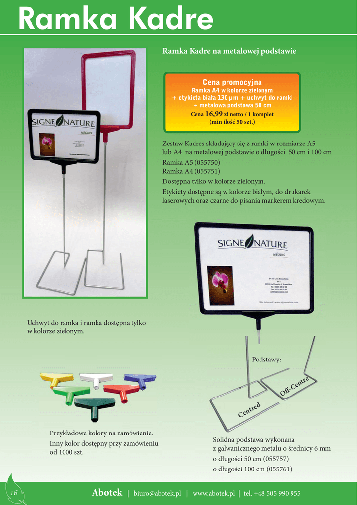 Ramka Kadre Ramka Kadre na metalowej podstawie Cena promocyjna Ramka A4 w kolorze zielonym + etykieta biała 130 µm + uchwyt do ramki + metalowa podstawa 50 cm Cena 16,99 zł netto / 1 komplet (min ilość 50 szt.) Zestaw Kadres składający się z ramki w rozmiarze A5 lub A4 na metalowej podstawie o długości 50 cm i 100 cm Ramka A5 (055750) Ramka A4 (055751) Dostępna tylko w kolorze zielonym. Etykiety dostępne są w kolorze białym, do drukarek laserowych oraz czarne do pisania markerem kredowym. Uchwyt do ramka i ramka dostępna tylko w kolorze zielonym. Podstawy: e ntr e -C Off ed ntr e C Przykładowe kolory na zamówienie. Inny kolor dostępny przy zamówieniu od 1000 szt. 16 Abotek Solidna podstawa wykonana z galwanicznego metalu o średnicy 6 mm o długości 50 cm (055757) o długości 100 cm (055761) | [email protected] | www.abotek.pl | tel. +48 505 990 955